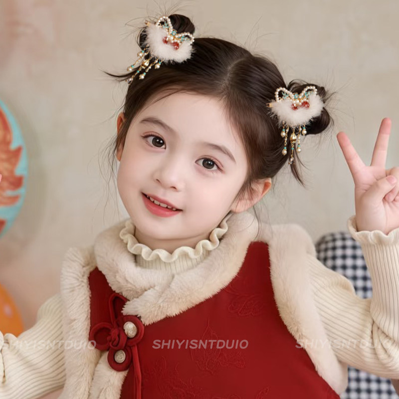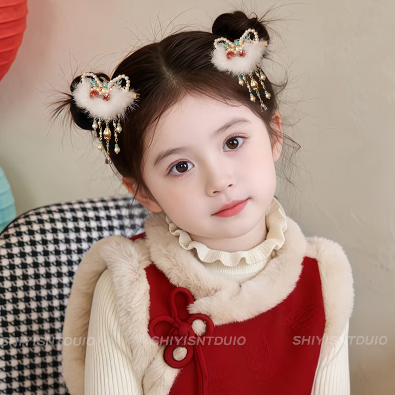 📚 儿童新年醒狮毛绒流苏蝴蝶结发夹女童前额刘海夹宝宝古风汉服发饰