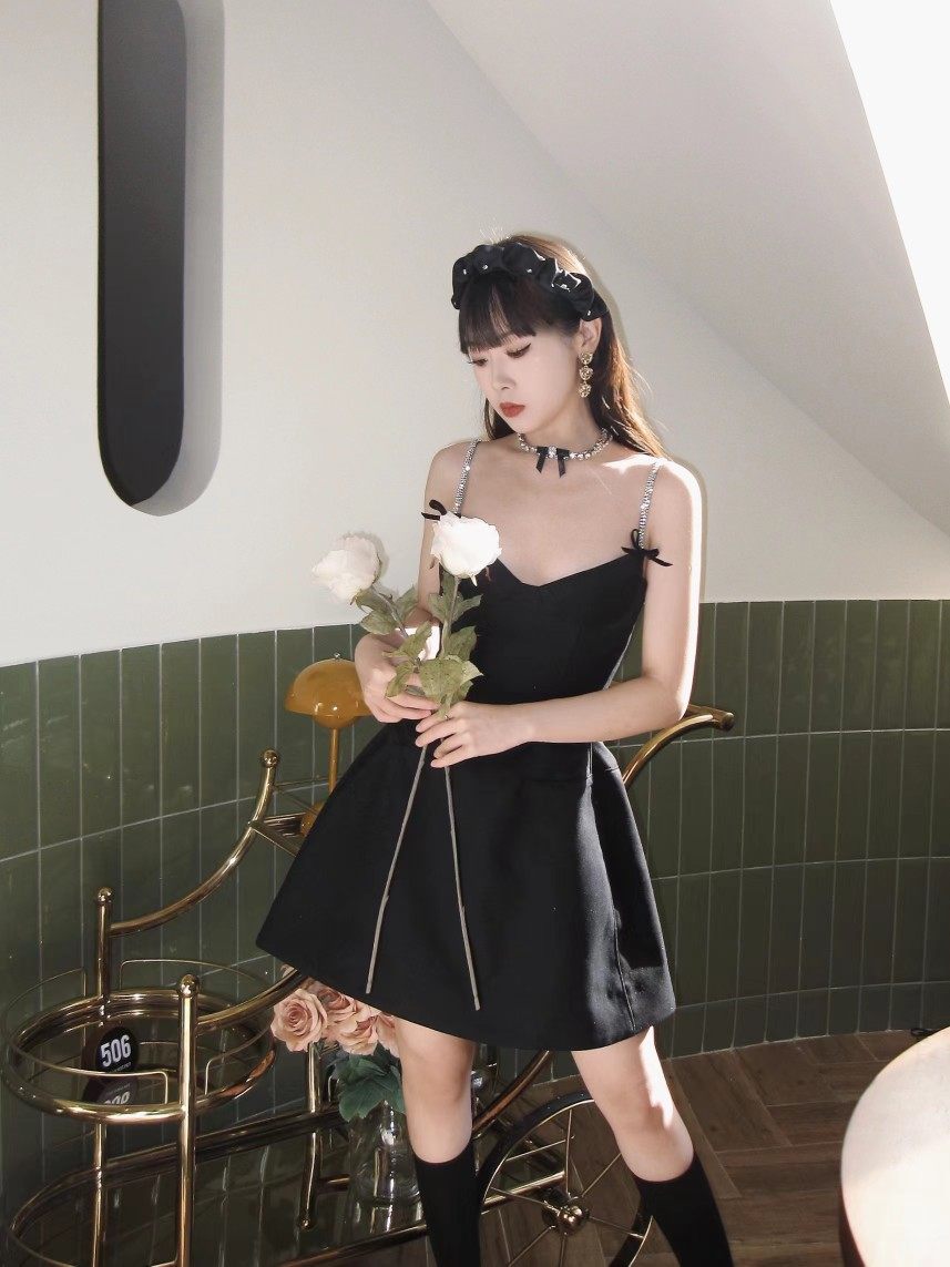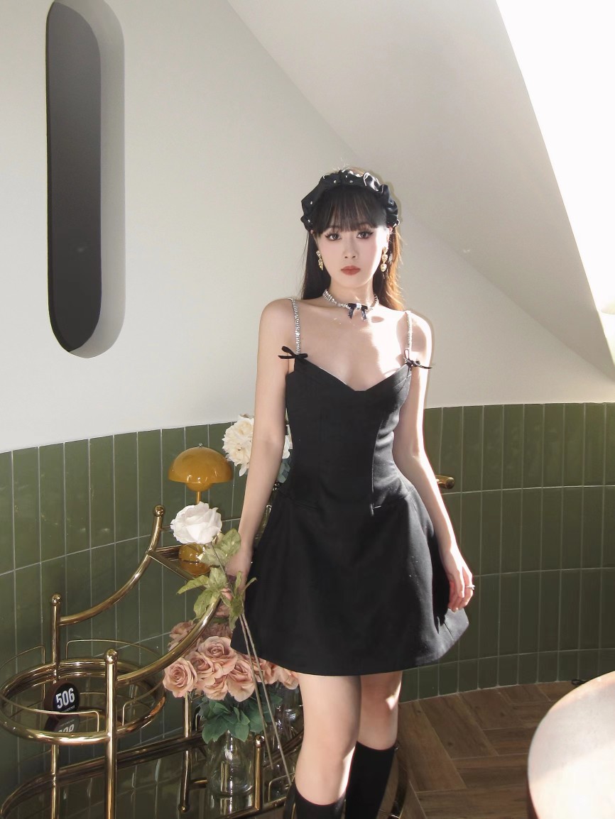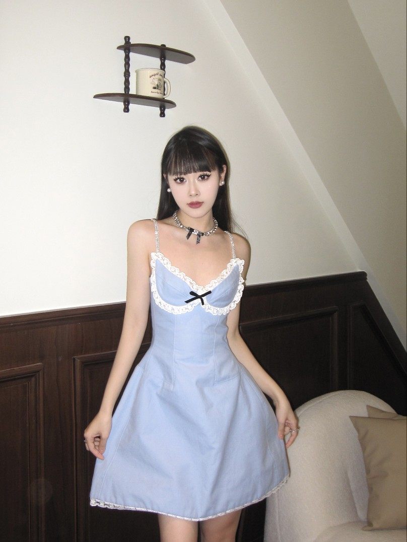 📚 蓝色无●正版SST纯欲花朵复古风吊带v领显瘦设计感蓬蓬裙短连衣裙