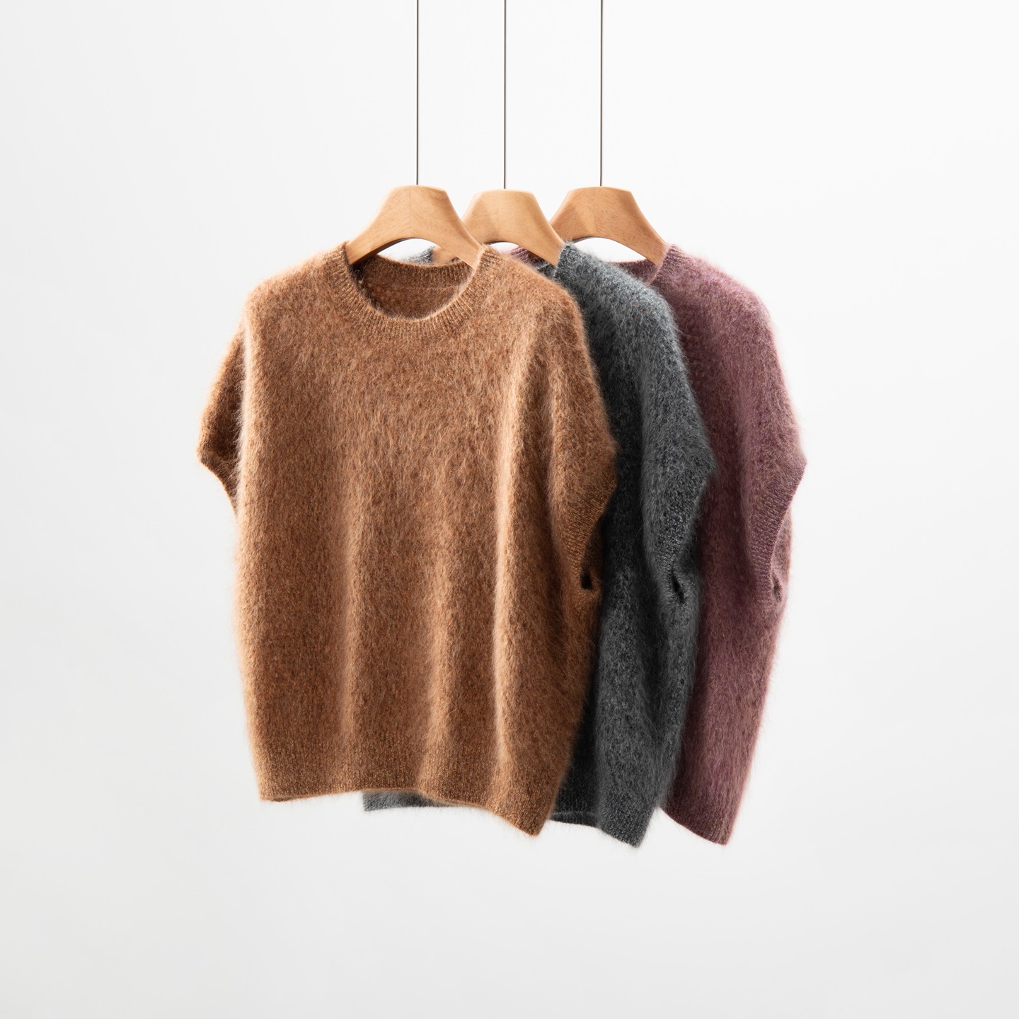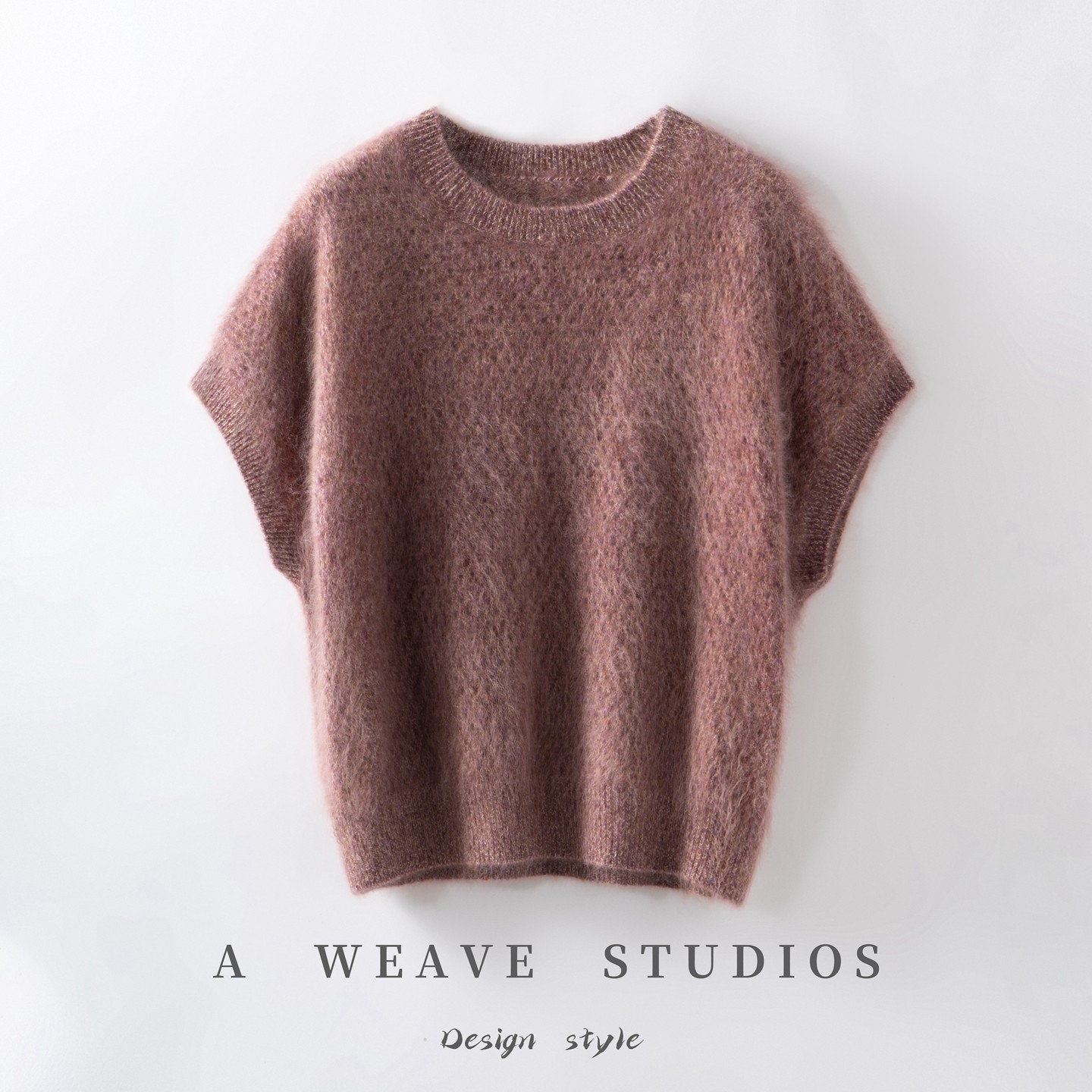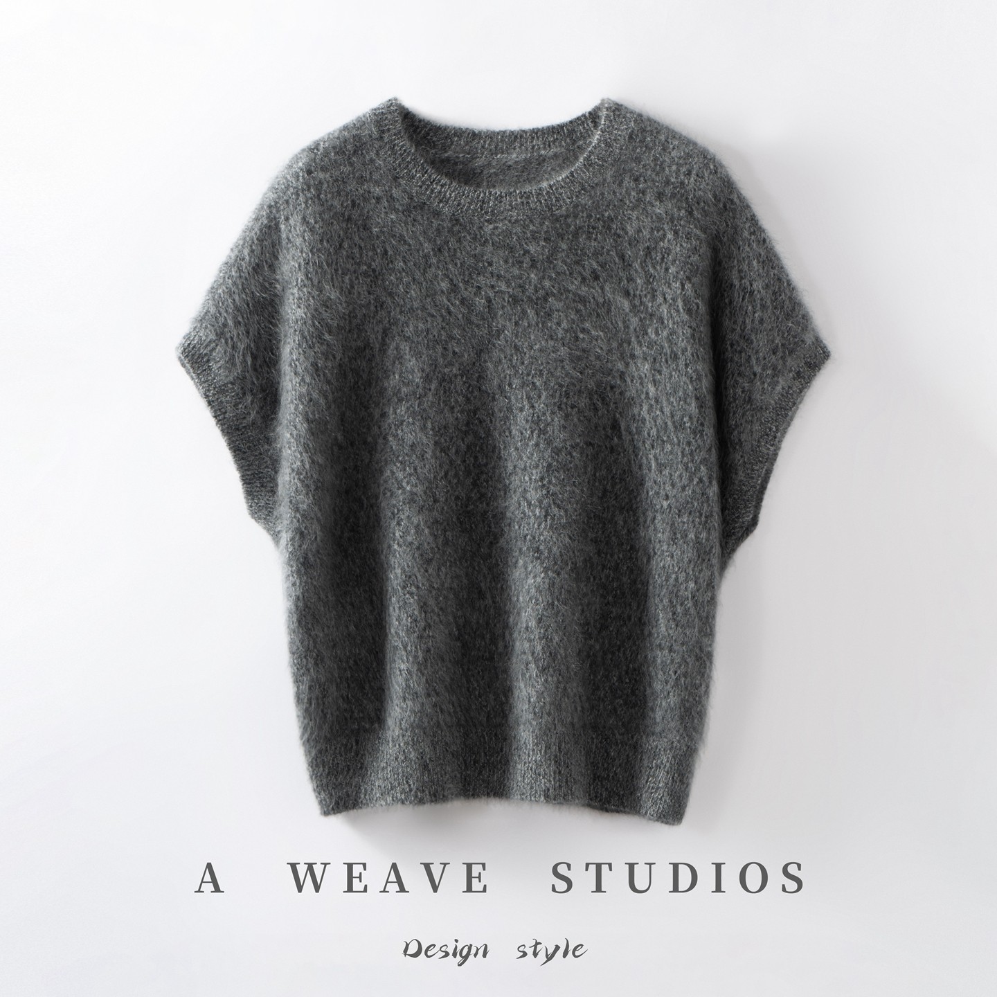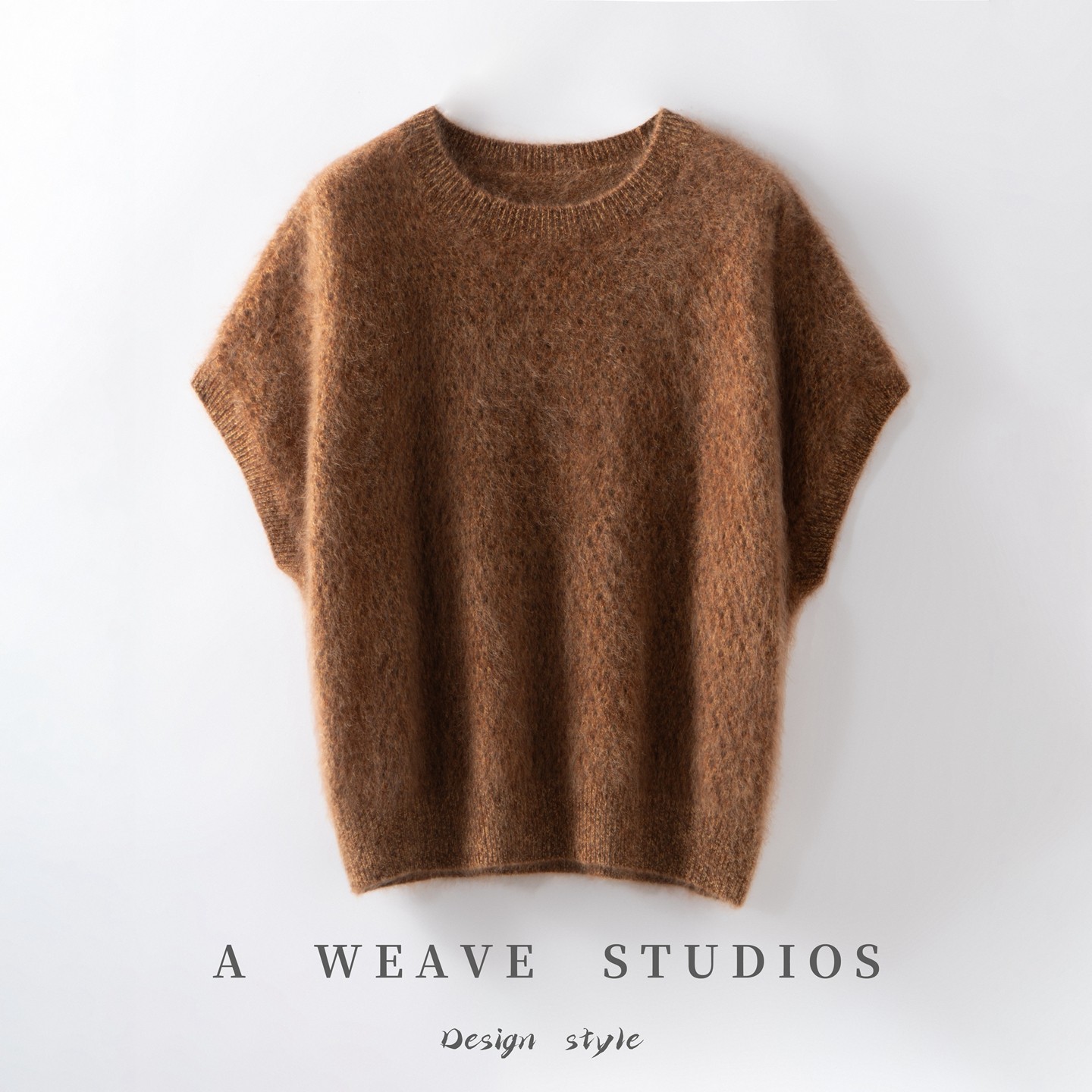 📚 拉绒100%纯山羊绒衫短袖毛衣女圆领镂空落肩针织衫极简风套头背心