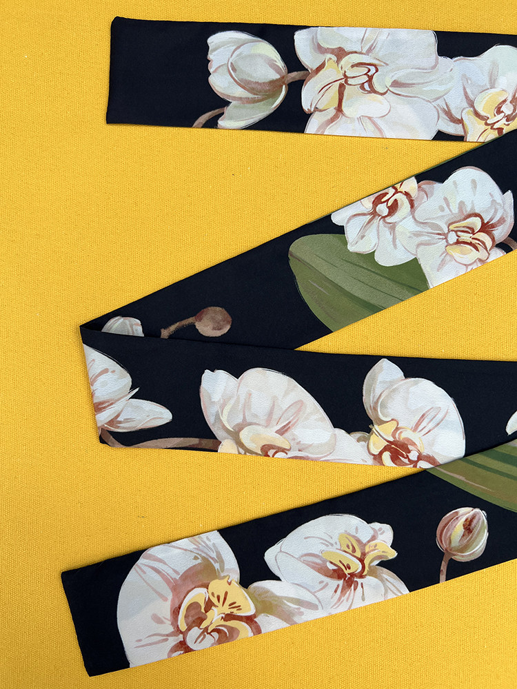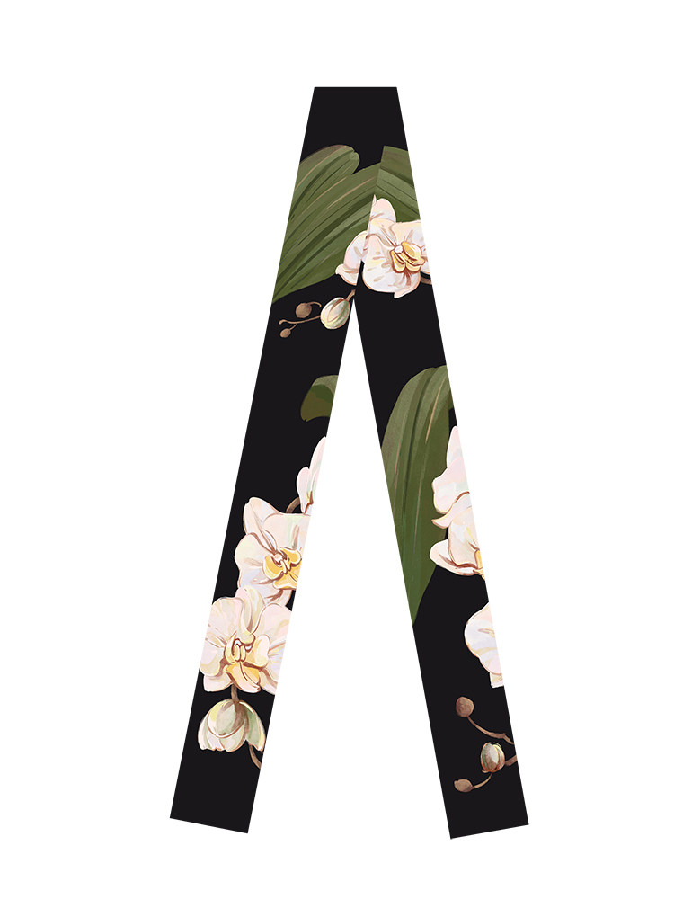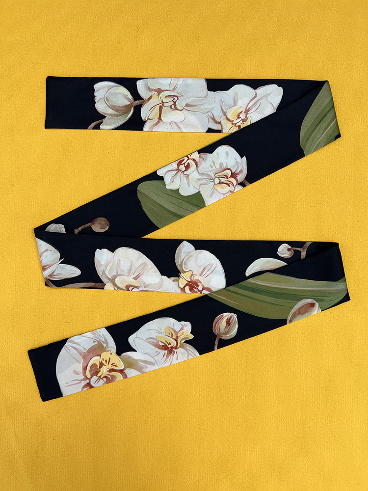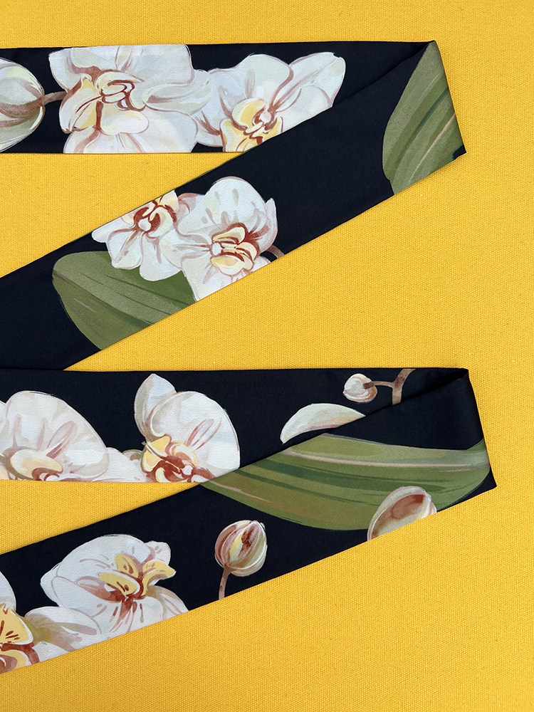 📚 插画复古水彩手绘黑白橙黄色蝴蝶兰尾飘带丝带窄丝巾发带领巾腰带