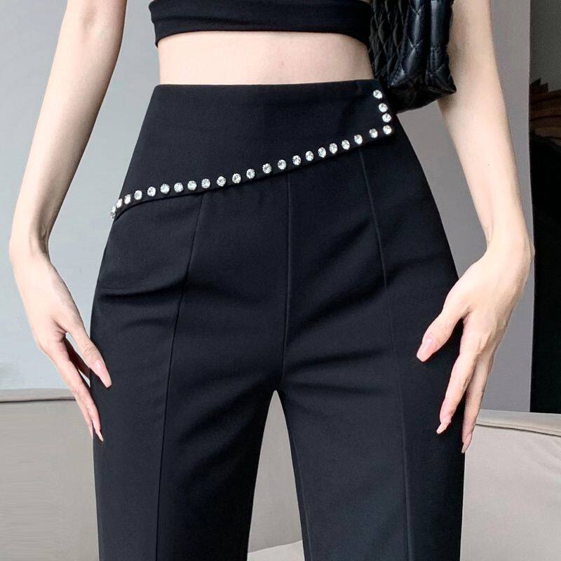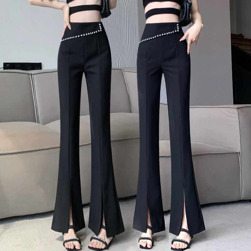 📚 带钻喇叭裤子女春夏小个子高腰显瘦垂感黑色女裤前开叉微喇裤