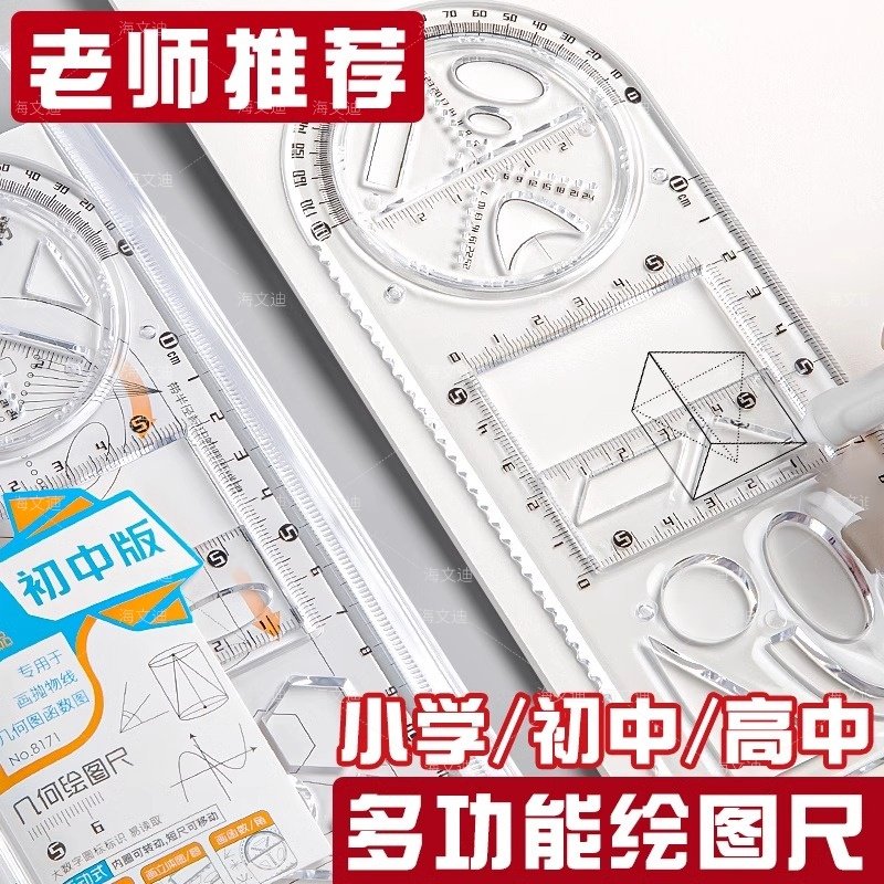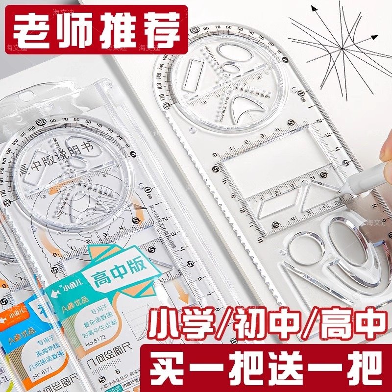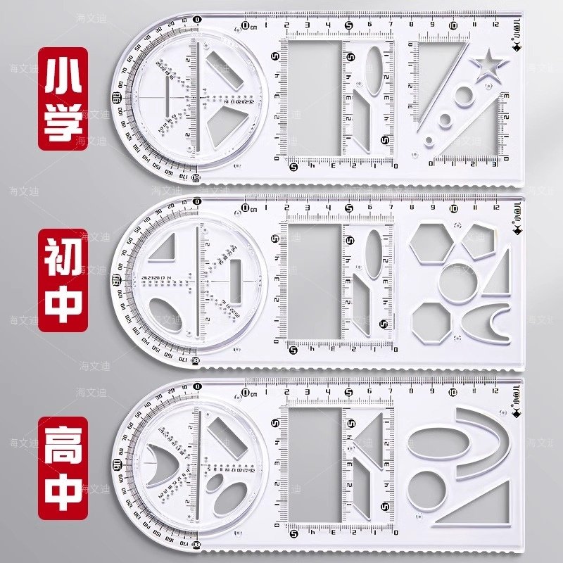 📚 中小学多功能绘图尺子高中生可旋转数学函数几何图形尺套装三角直尺椭圆格尺量角圆规画圆镂空手抄报设计模板
