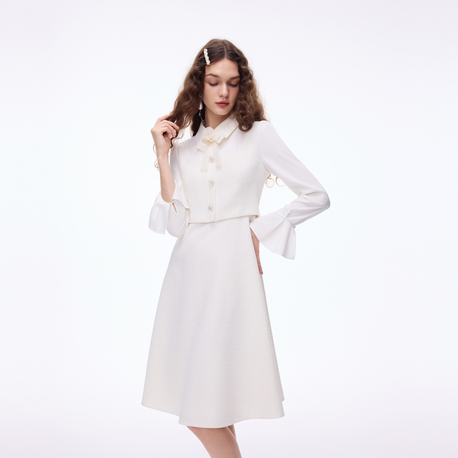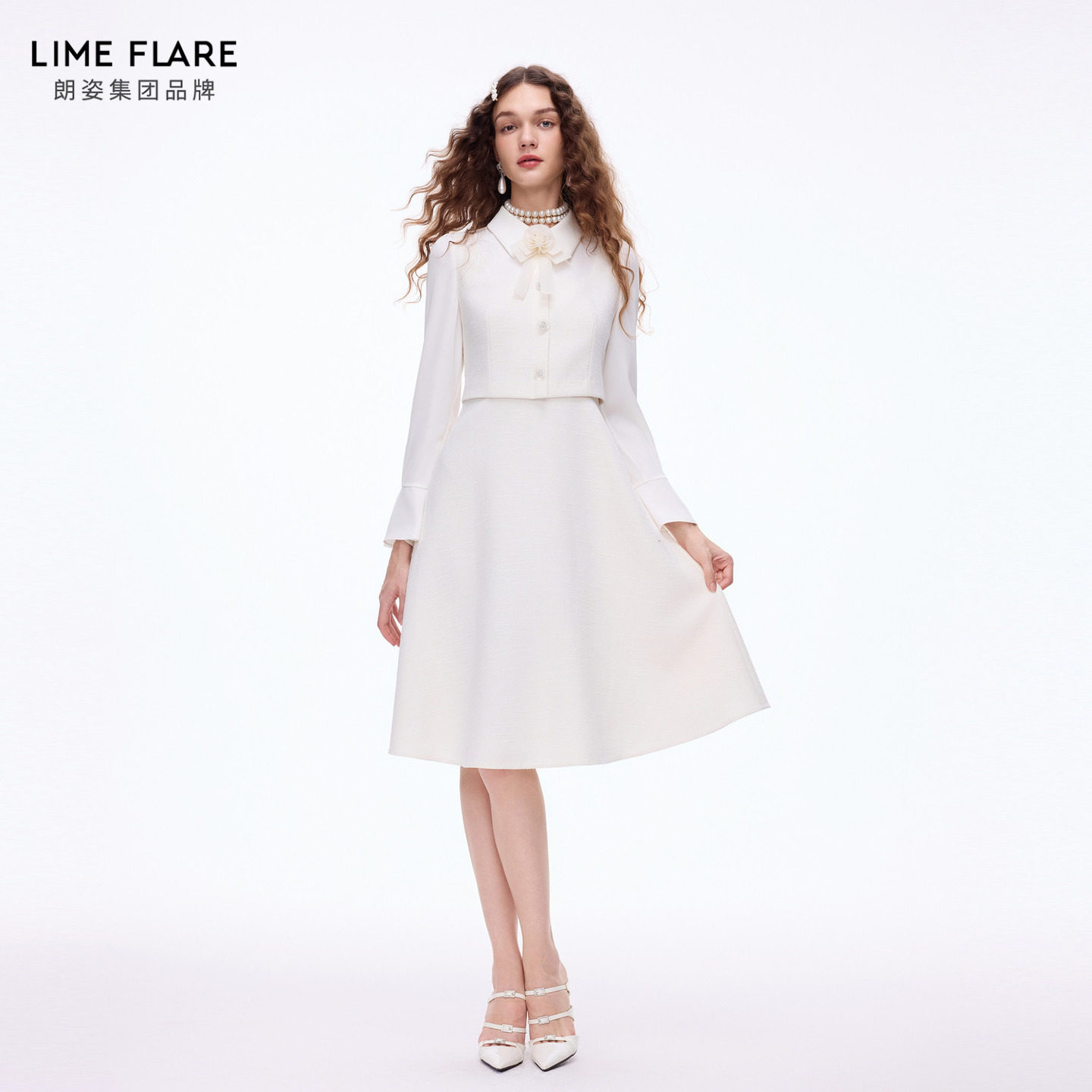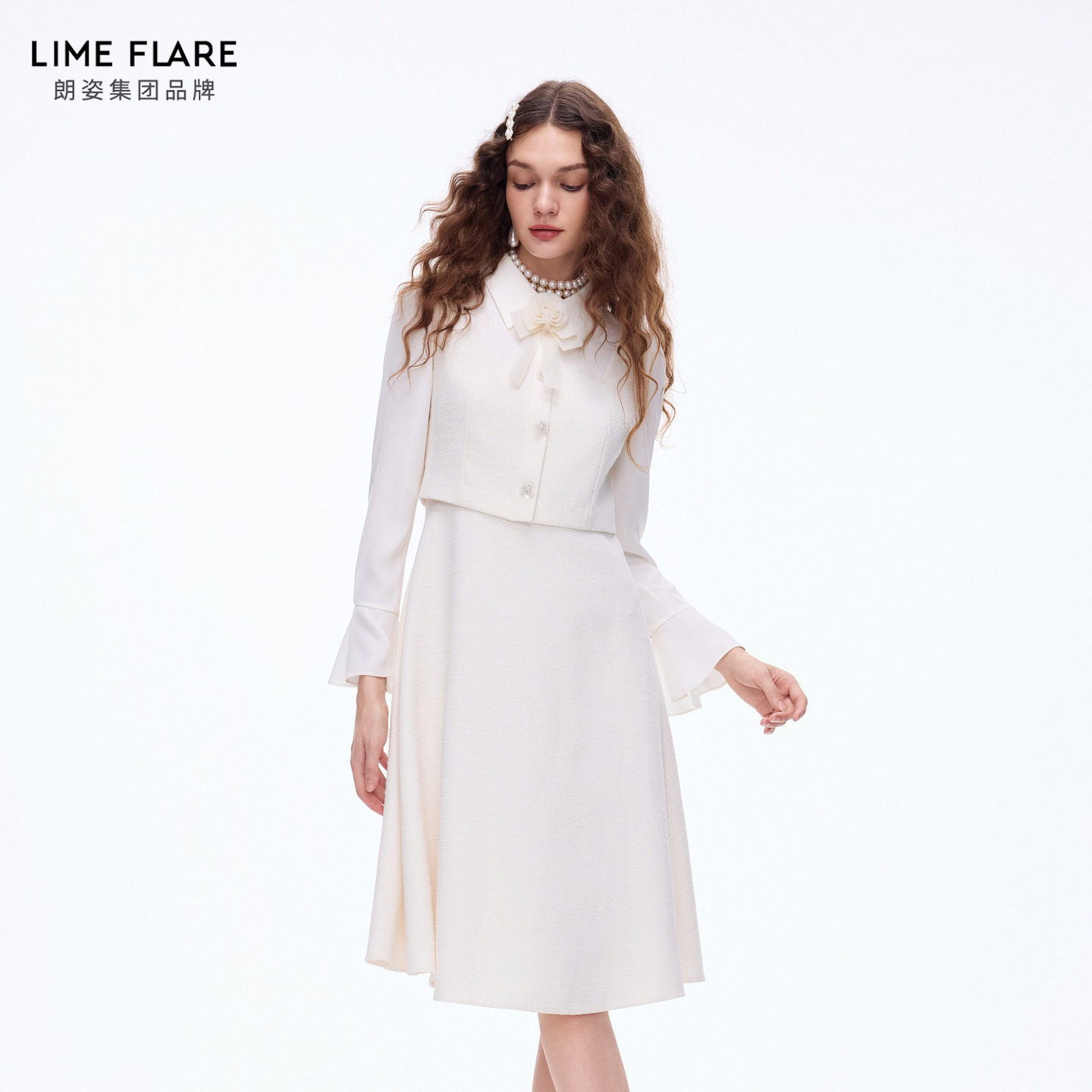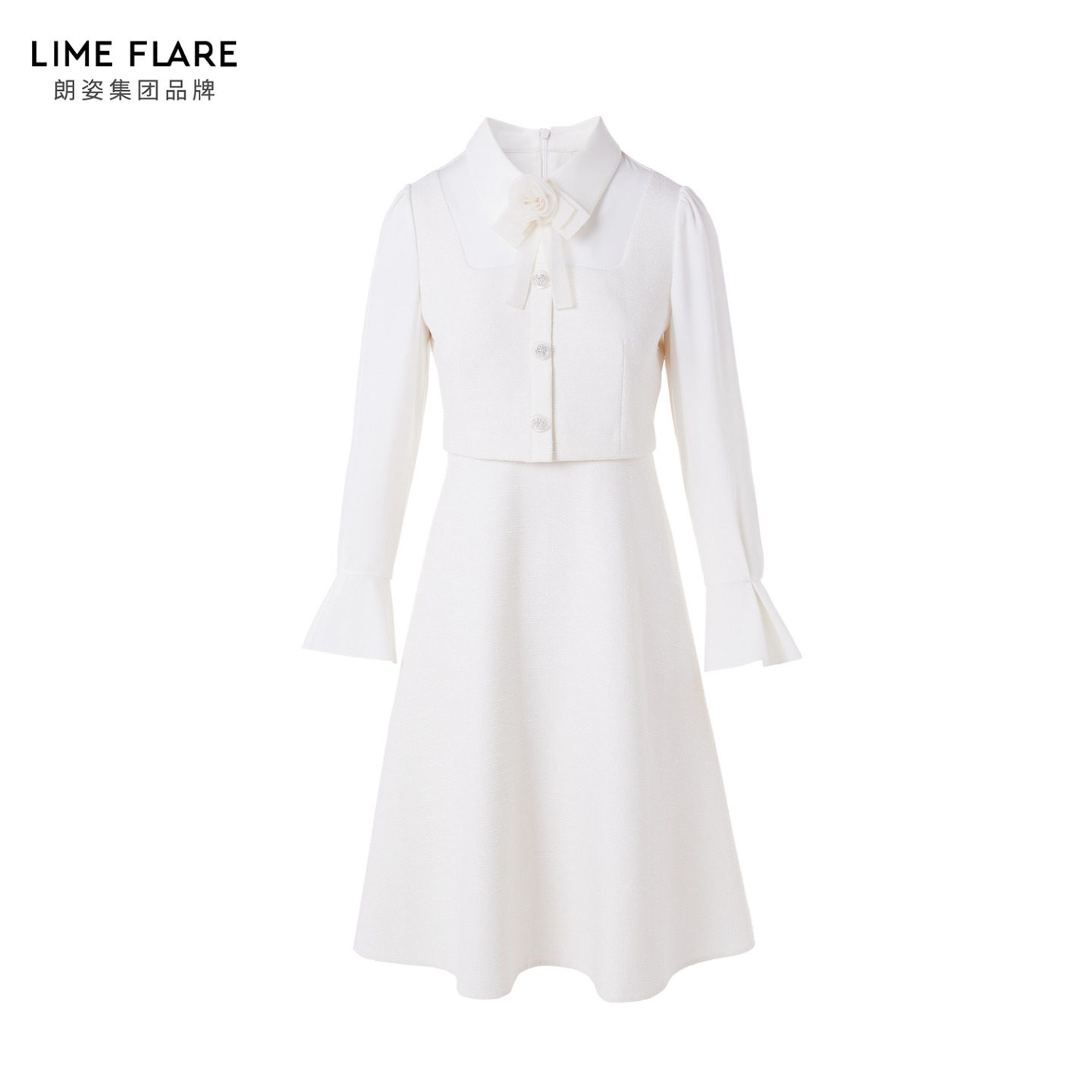 📚 朗姿莱茵福莱尔花式纱气质翻领可拆卸领花假两件香风连衣裙26春新
