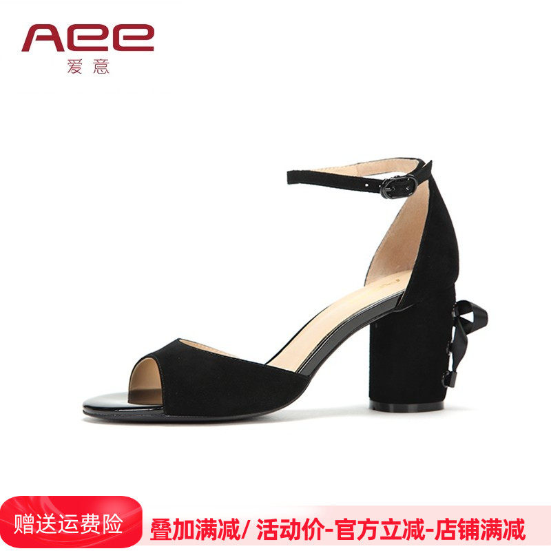📚 Aee/爱意女鞋夏季羊皮绒绑带一字扣粗跟鱼嘴高跟凉鞋女1617203023
