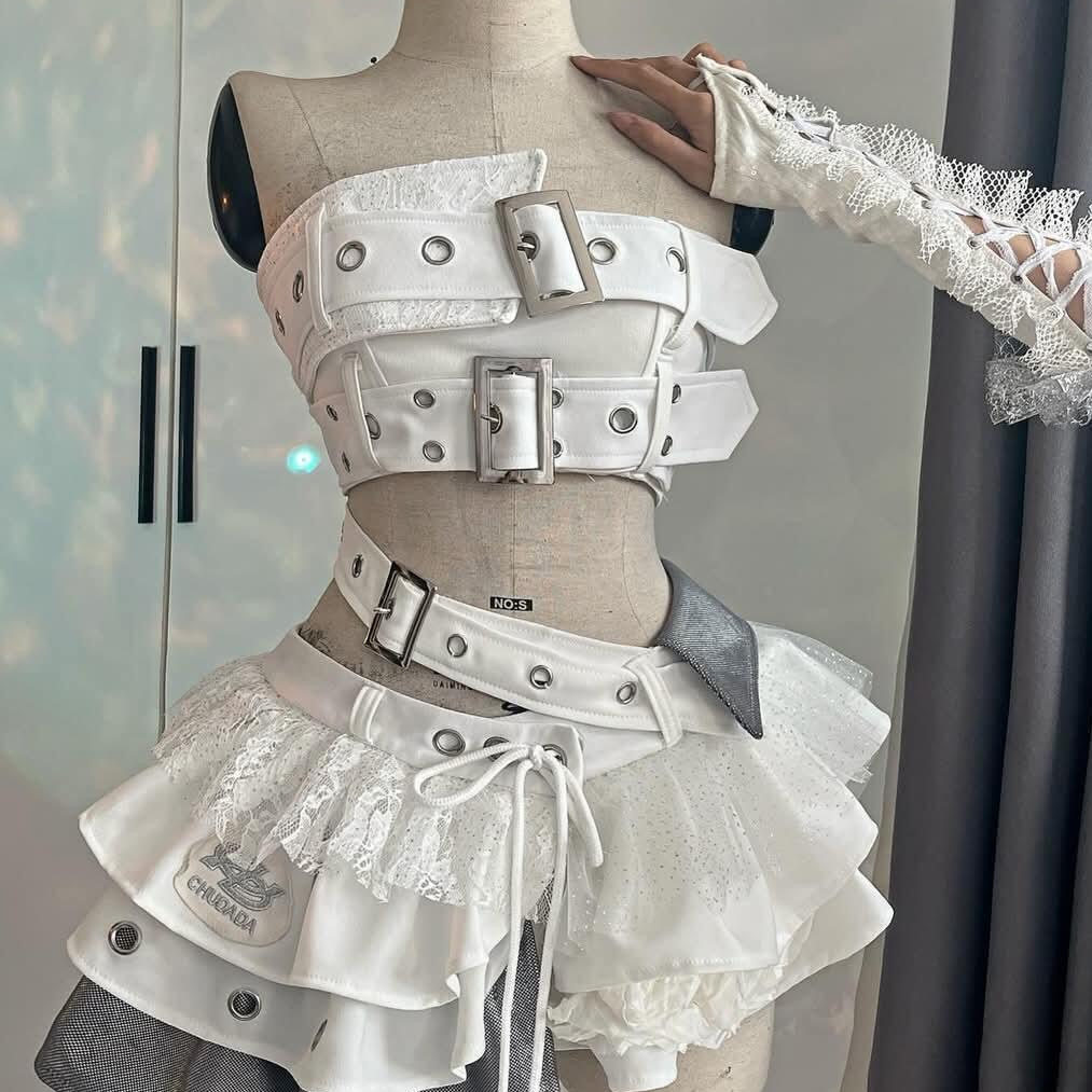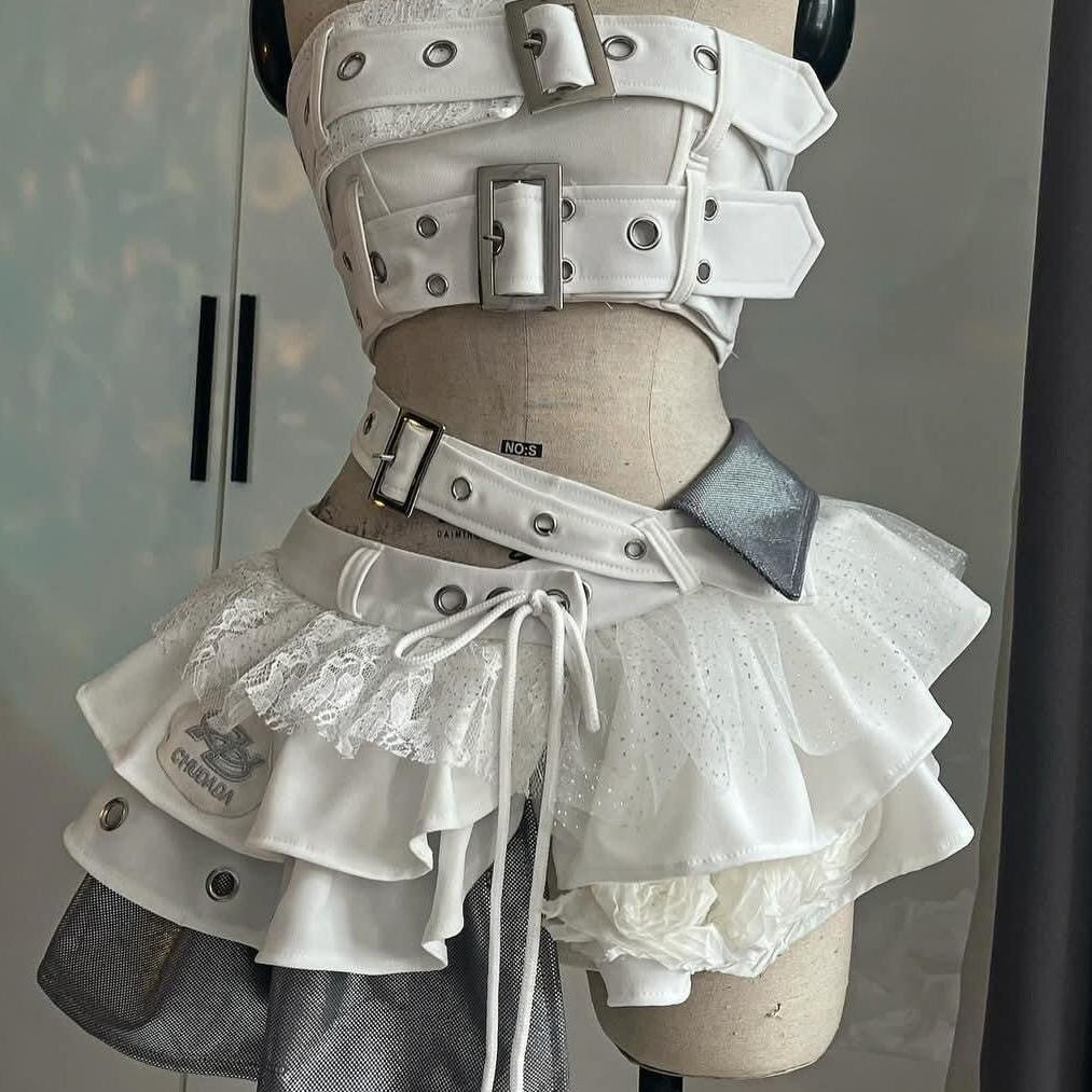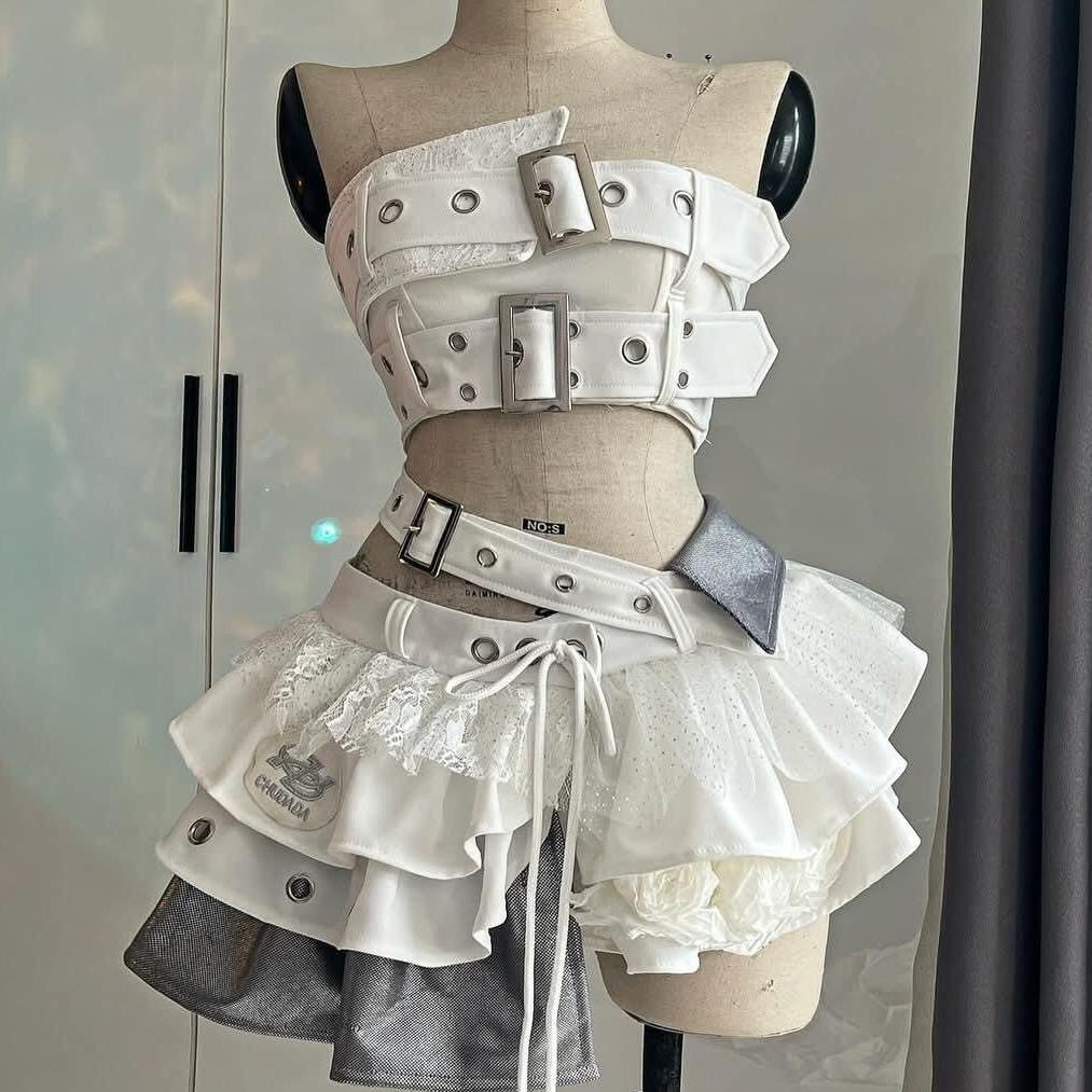 📚 甜酷辣妹白色朋克风y2k抹胸上衣拼接蕾丝不规则蓬蓬裙性感两件套