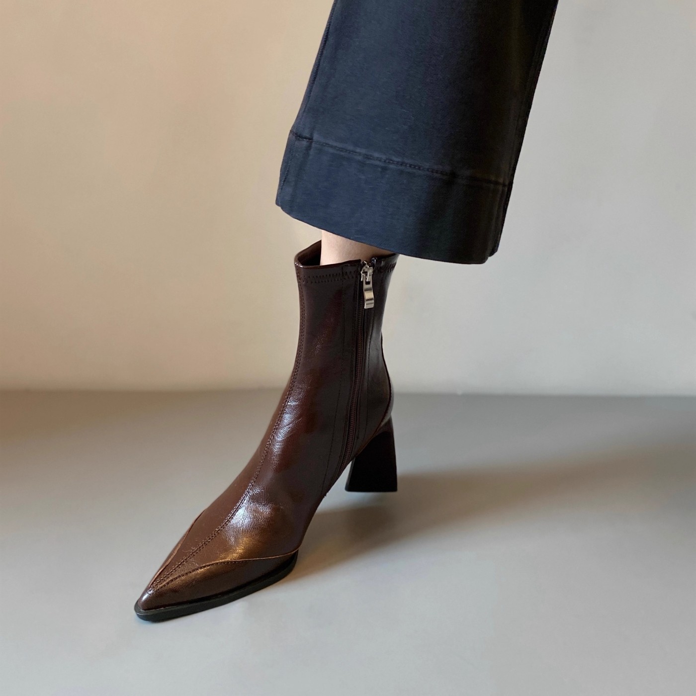 📚 羊皮版~尖头瘦瘦靴高跟短靴女法式气质复古马丁靴英伦风真皮单靴