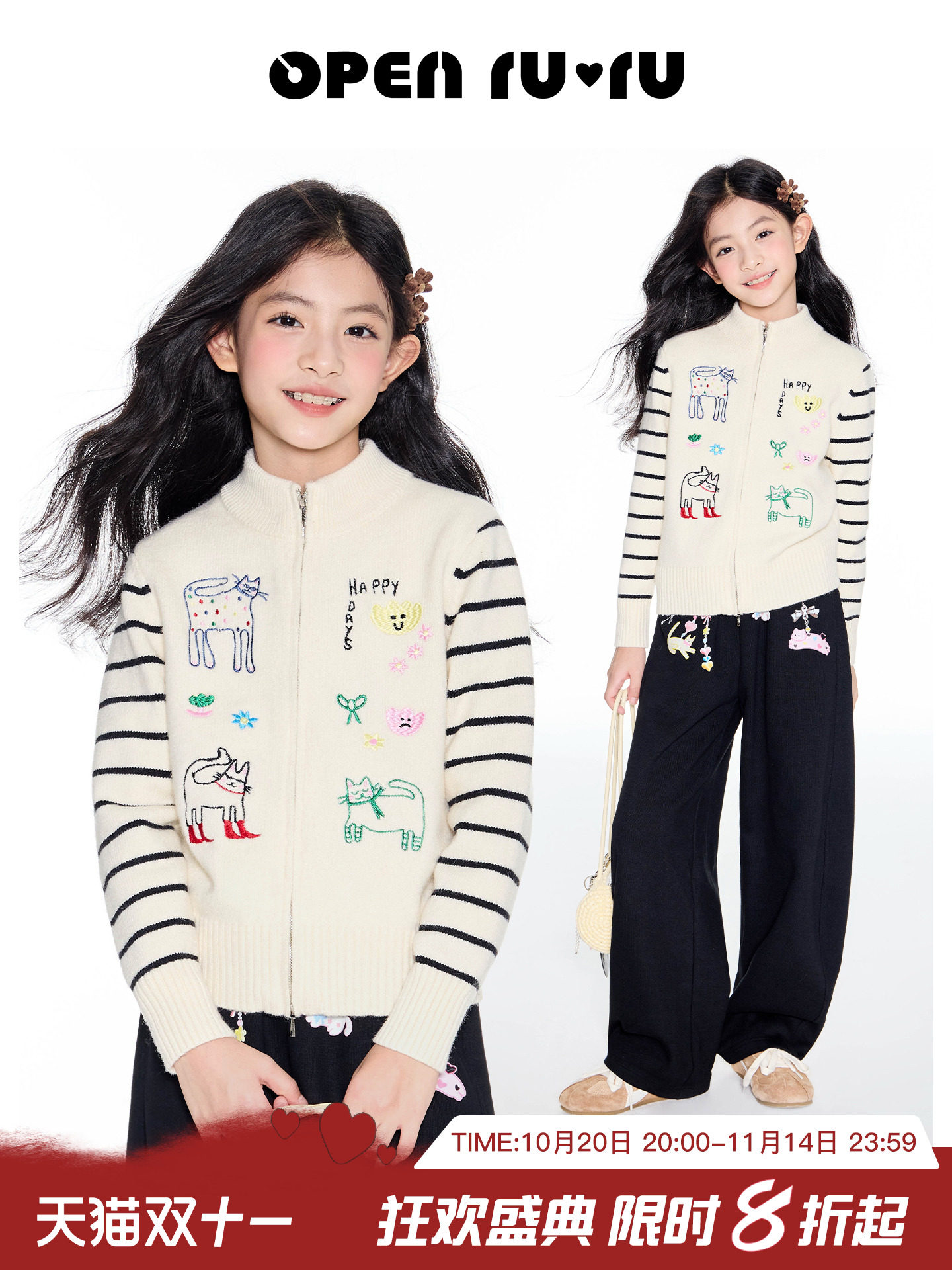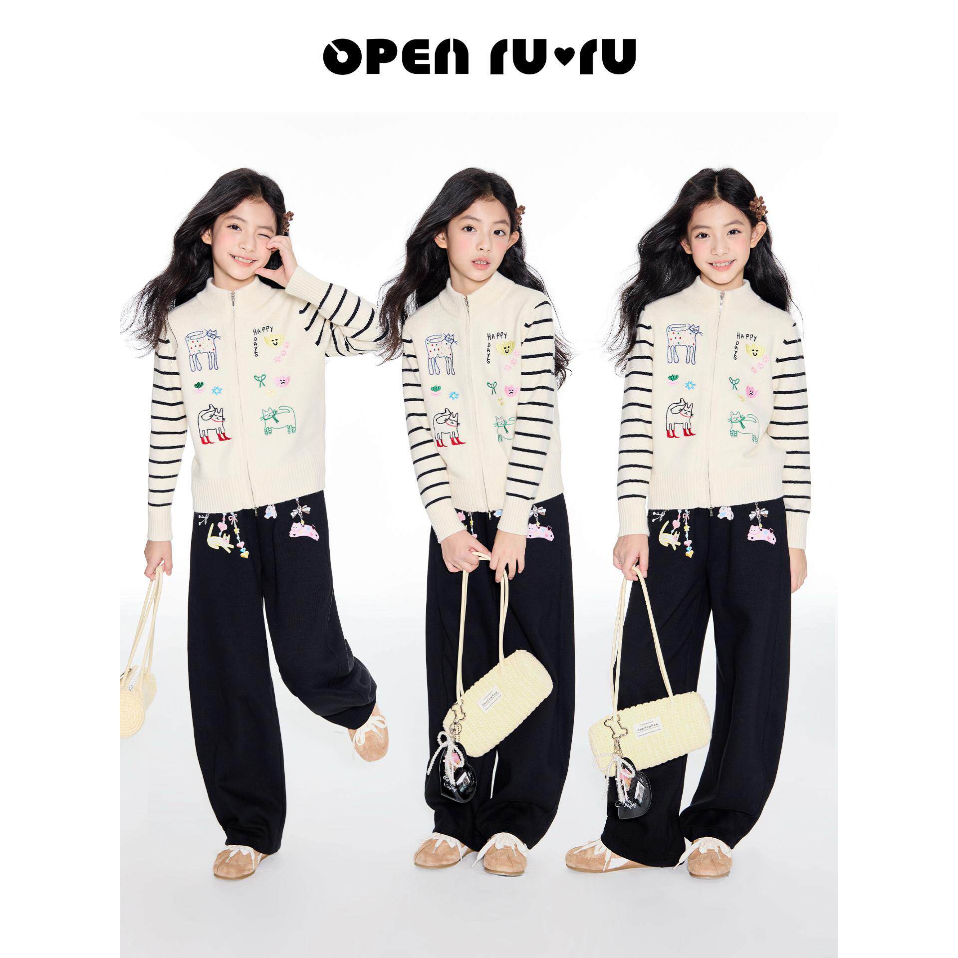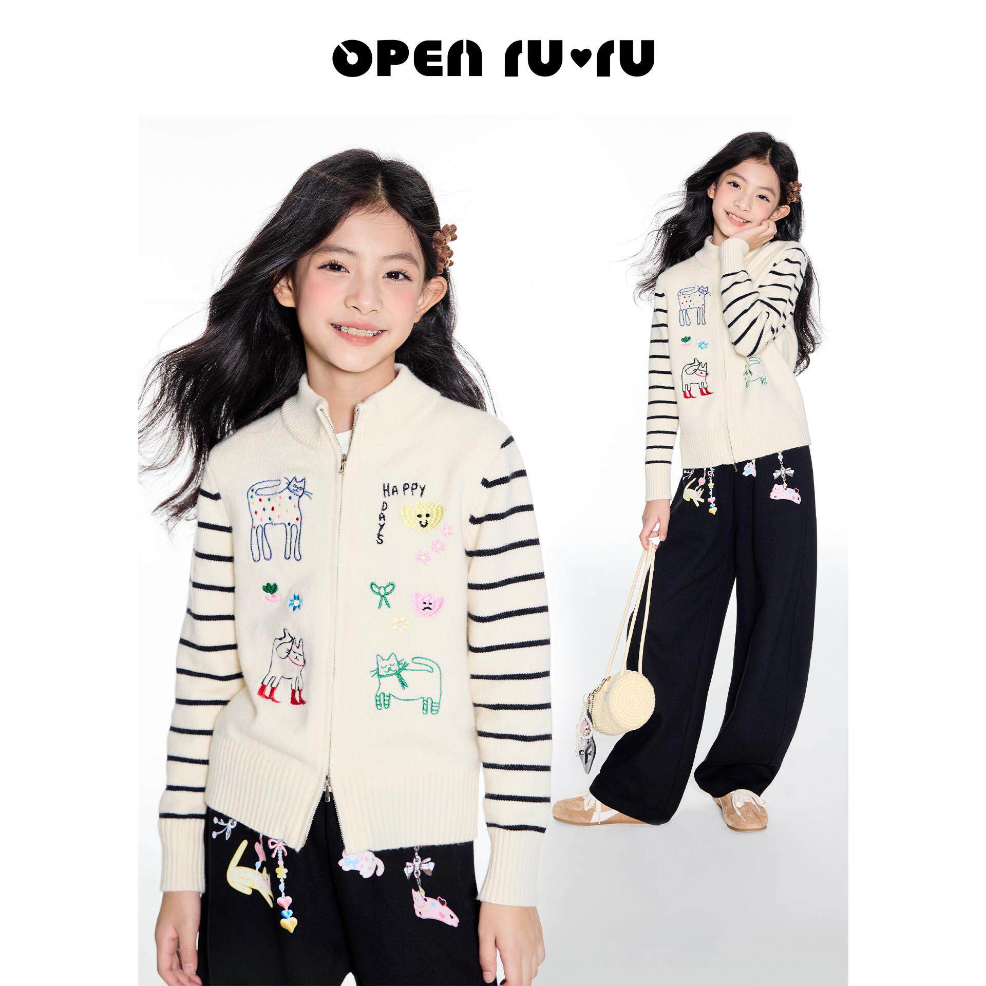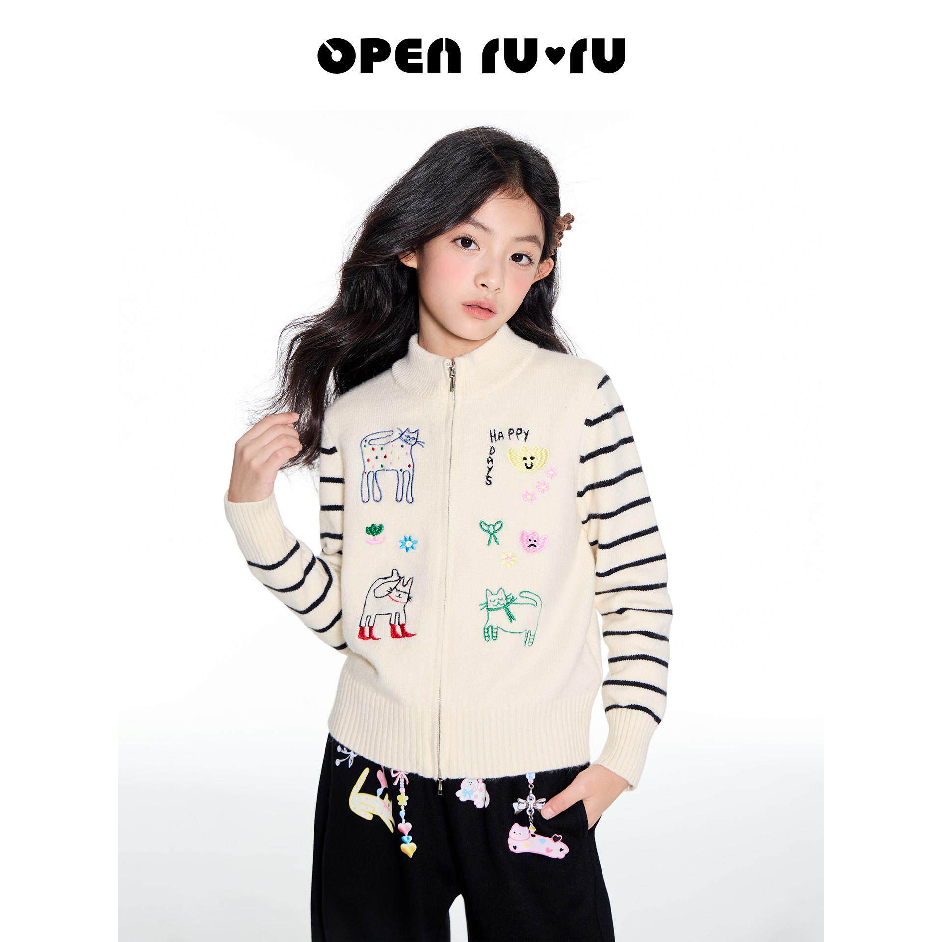 📚 opennunu女童猫咪刺绣立领毛衣秋季新品中大童设计感休闲百搭开衫