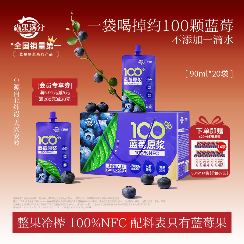 📚 卫视/森果满分100%NFC蓝莓原浆花青素非浓缩还原90ml*20袋