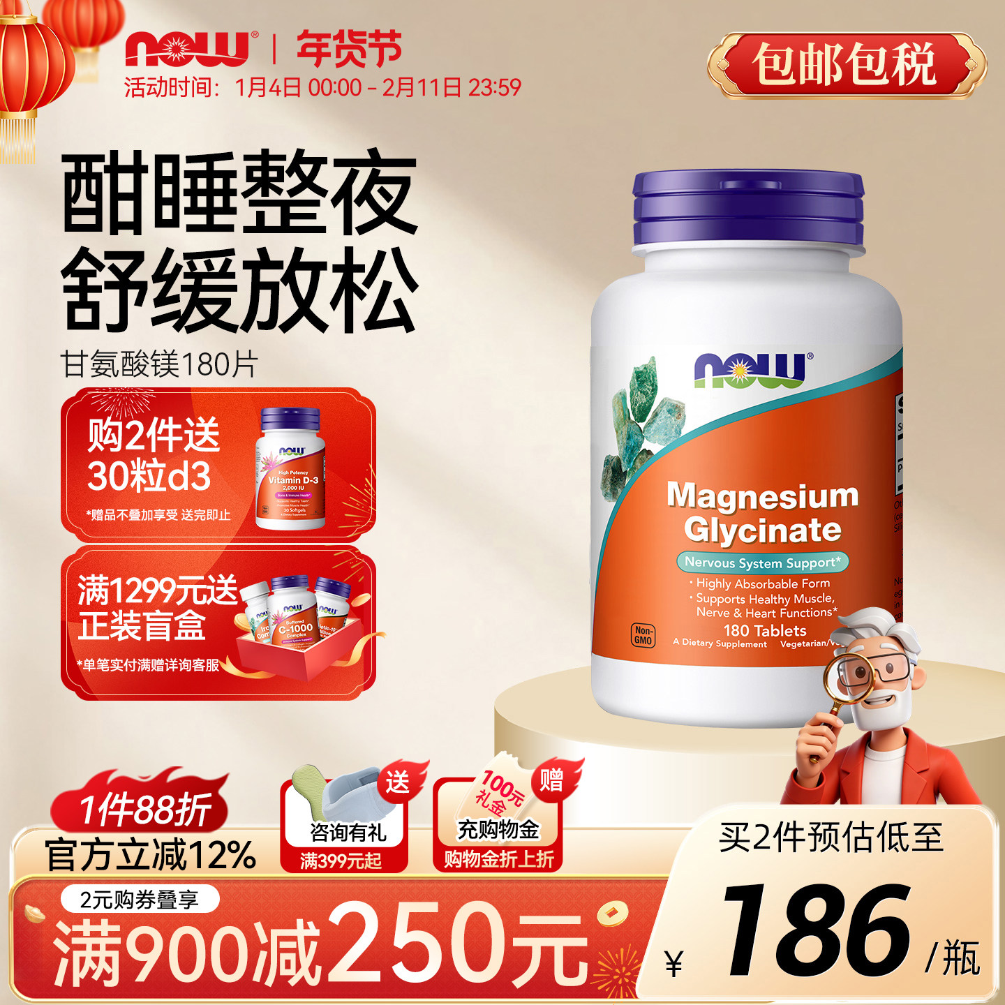📚 NOW诺奥甘氨酸镁片补充剂成人螯合镁元素胶囊200mg睡眠美国进口