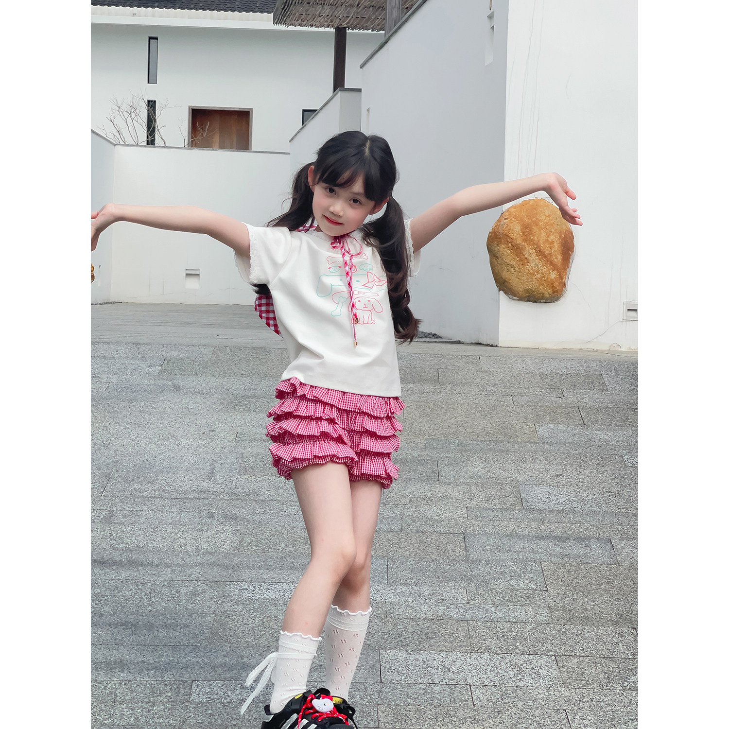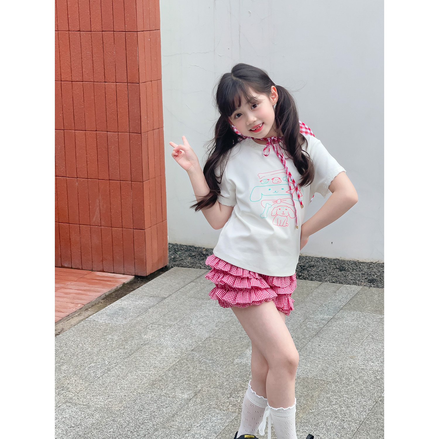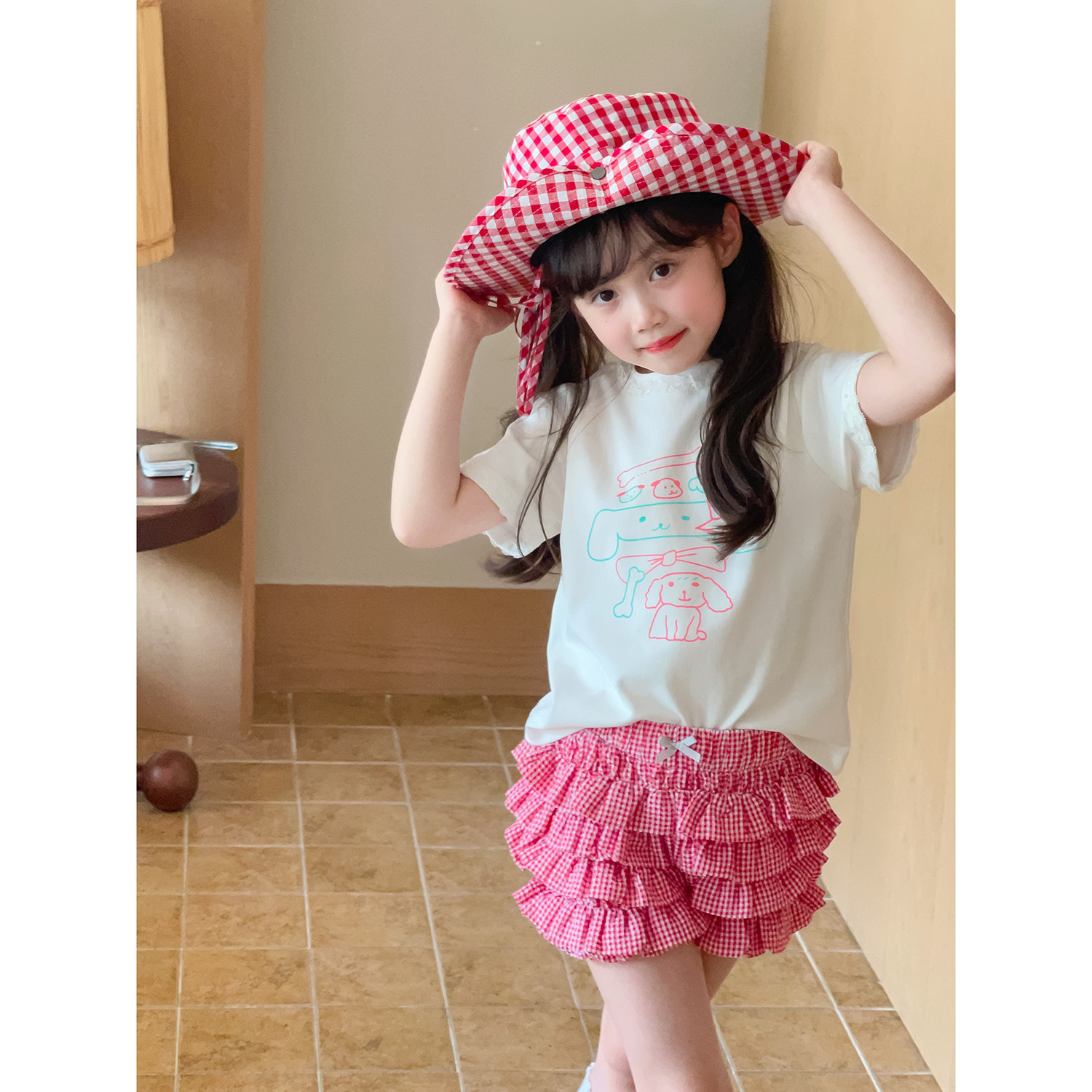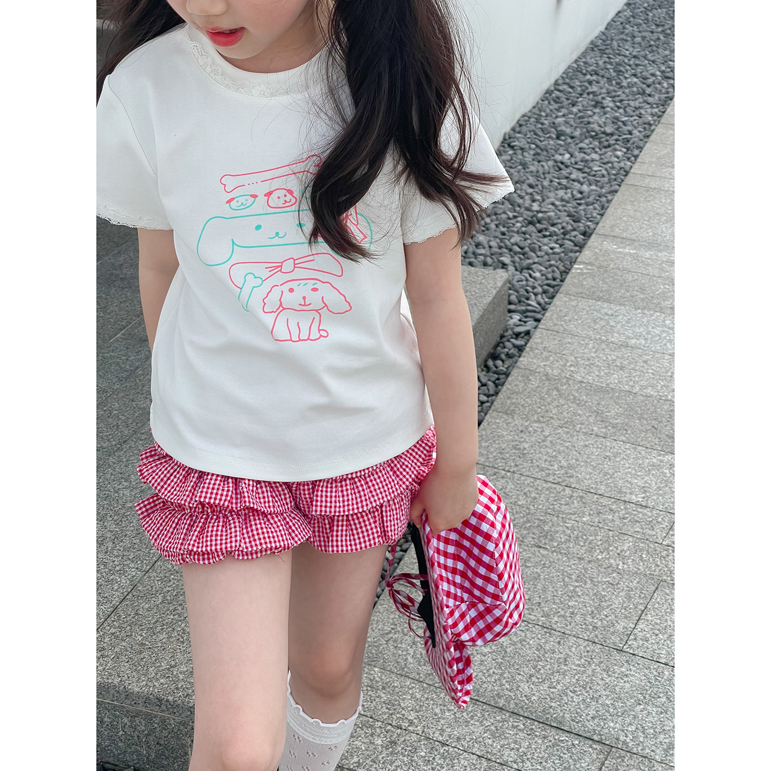 📚 NONO CHILD 女童夏季可爱印花小狗短袖T恤/格子层层短裤