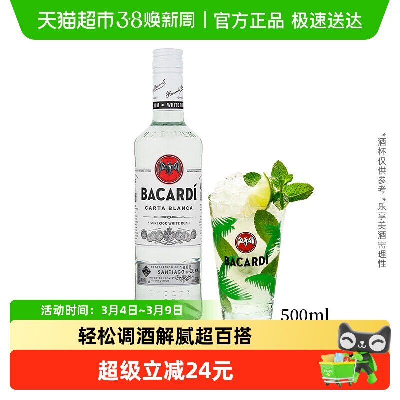 📚 百加得(Bacardi)洋酒白朗姆酒500MLmojito莫吉托基酒调酒