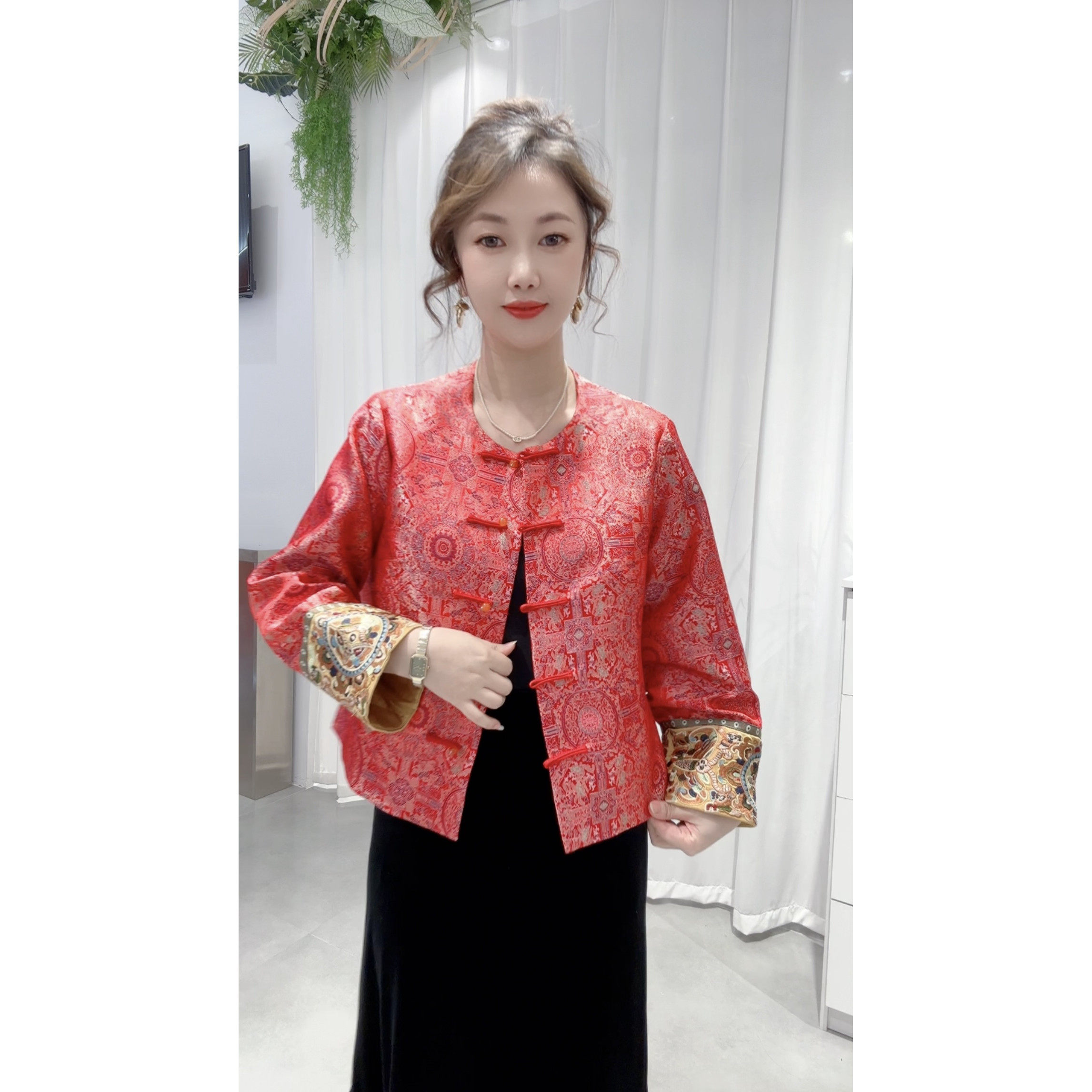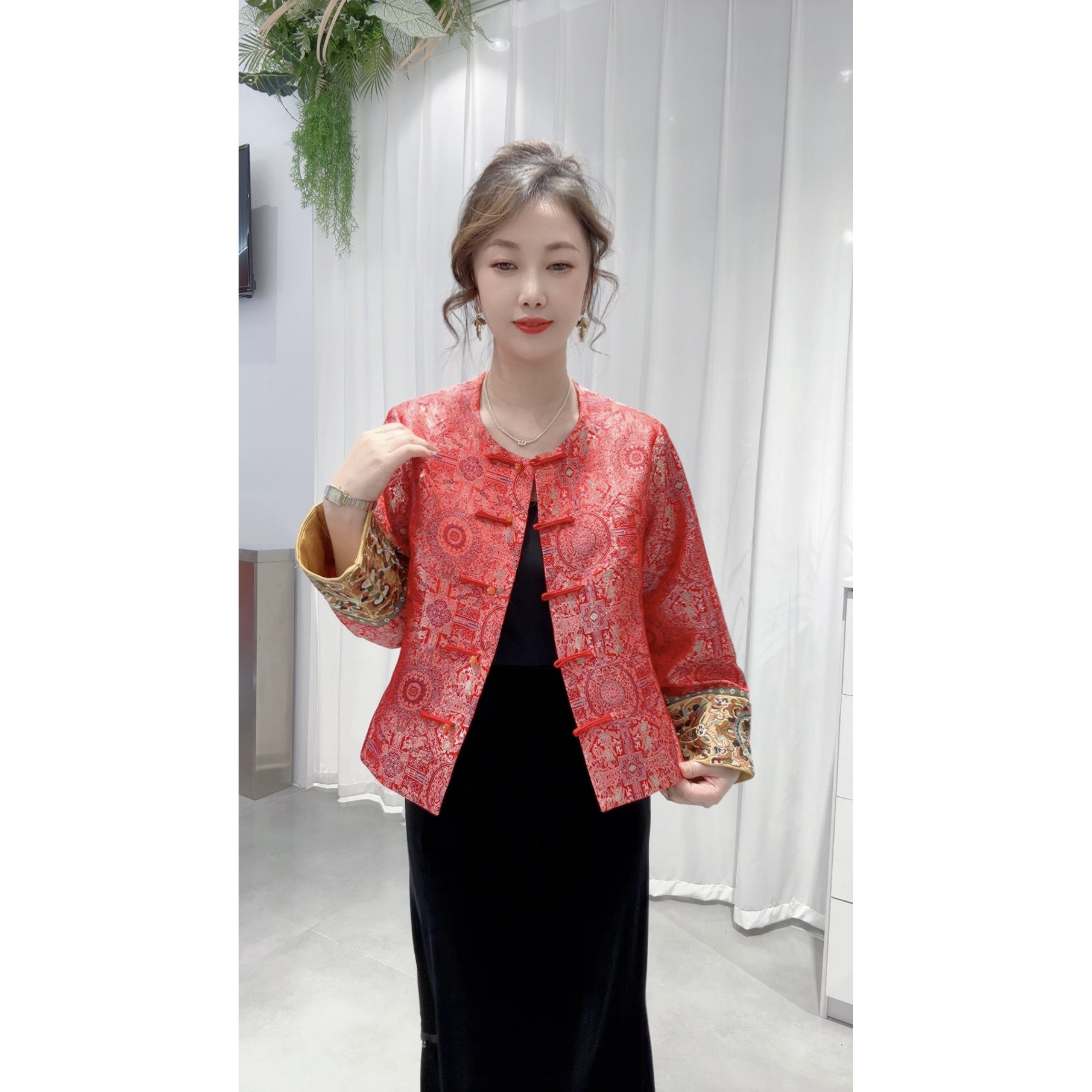 📚 非遗真丝织锦缎宋锦提花上衣女装2026春季新款红色新中式高端外套