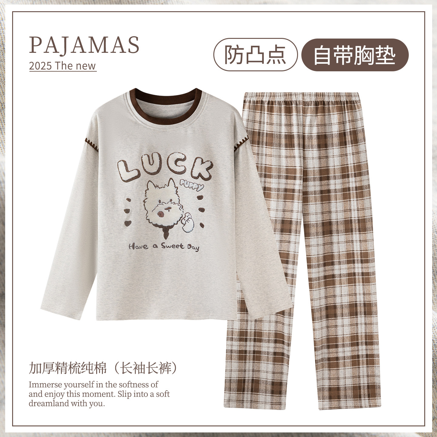 📚 卡之恋睡衣女款秋冬长袖带胸垫纯棉加厚格子睡裤套装春秋季家居服