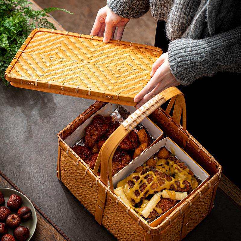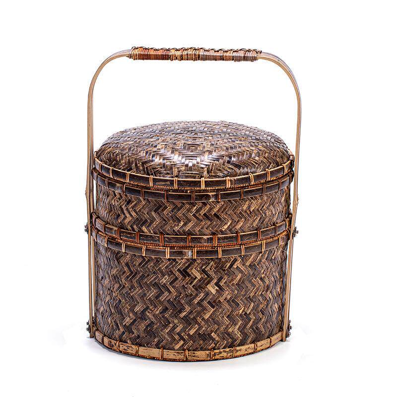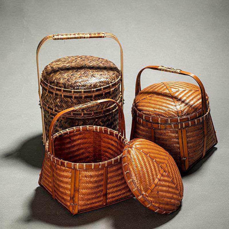 📚 中式复古竹编食盒家用带盖手工收纳竹篮紫竹野餐手提篮圆形茶道篮
