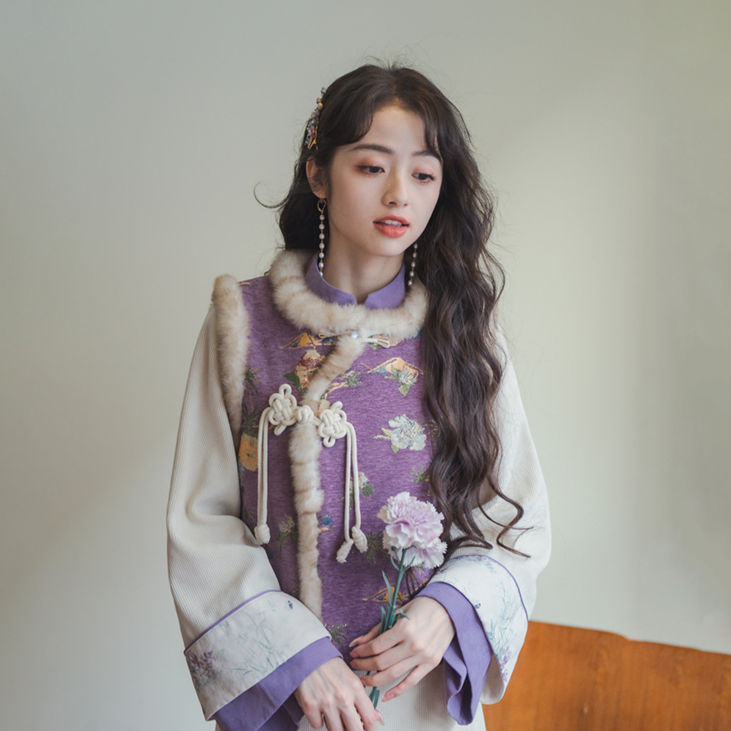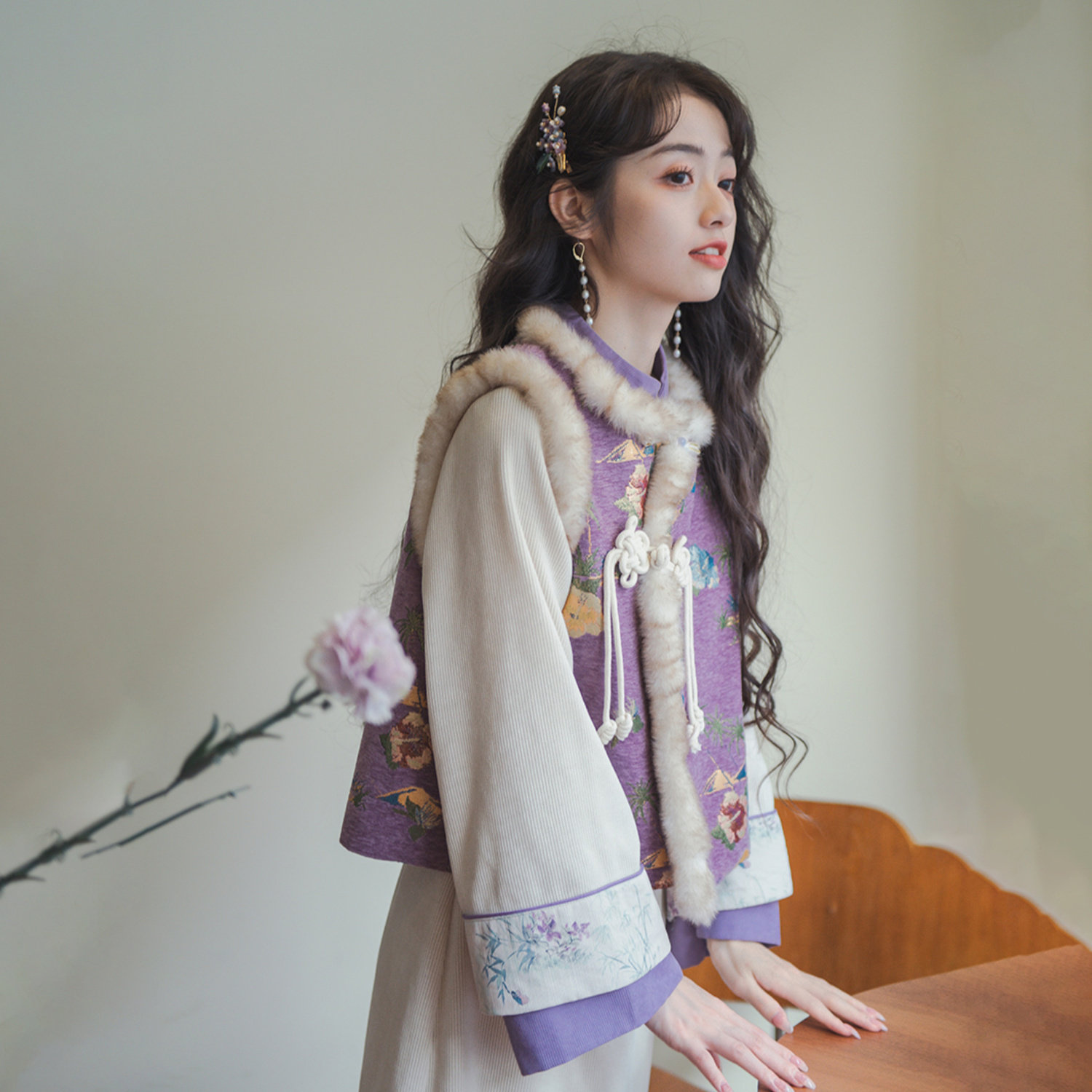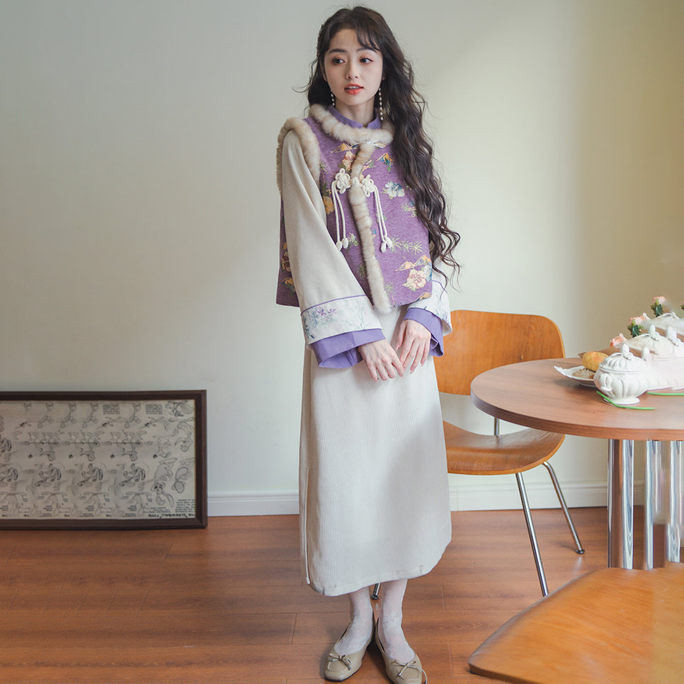 📚 冬季新中式复古风新中式改良旗袍汉服马甲女长袖毛绒中国风两件套
