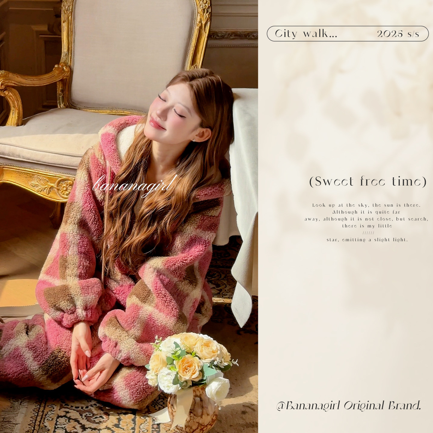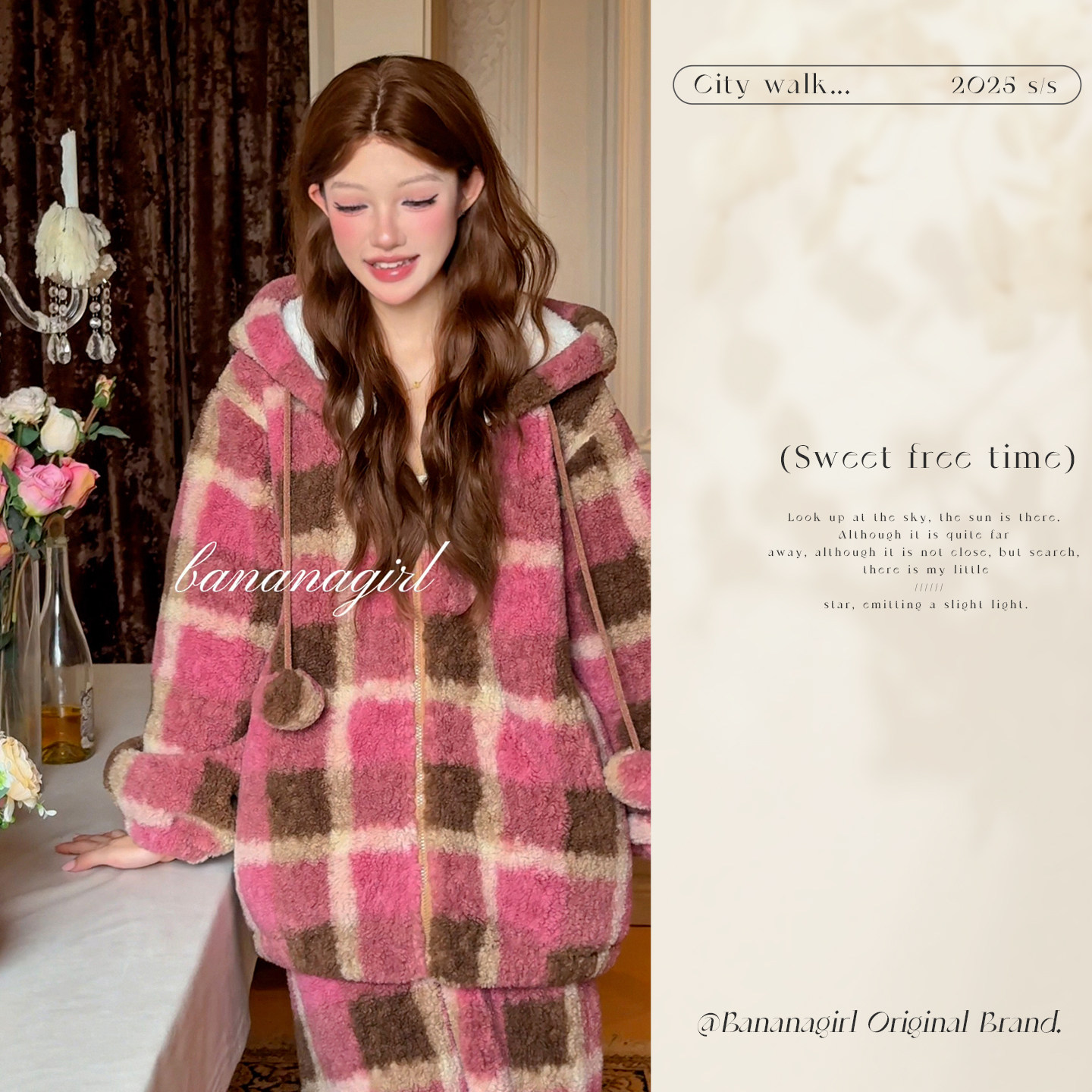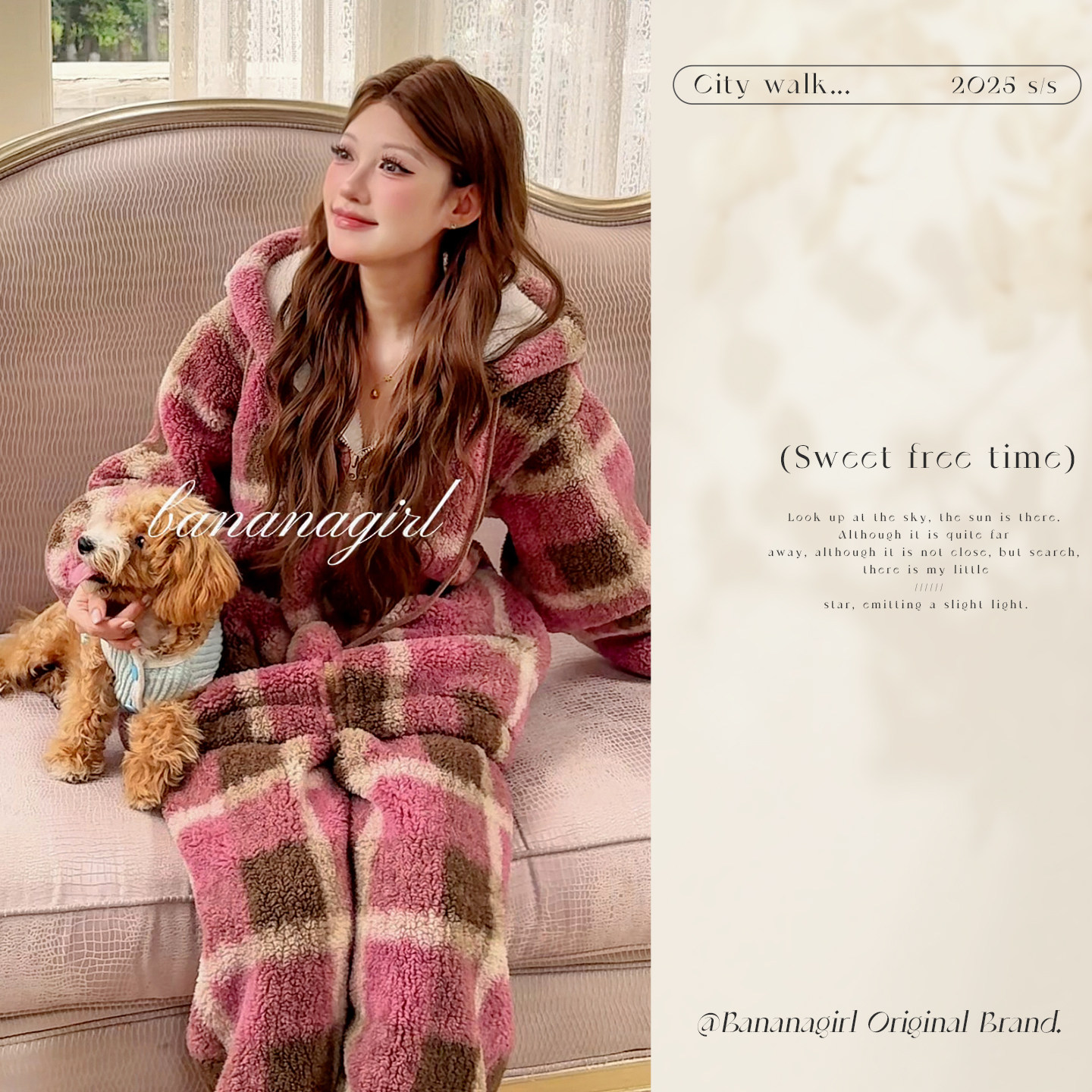 📚 Bananagirl睡衣女款冬季新款加厚加绒简约格子珊瑚绒家居服冬天女