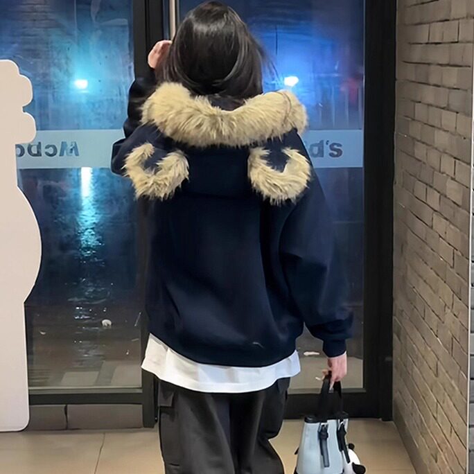 📚 BEETLE TOWN美式复古卡通小熊毛领耳朵连帽卫衣秋女百搭开衫外套