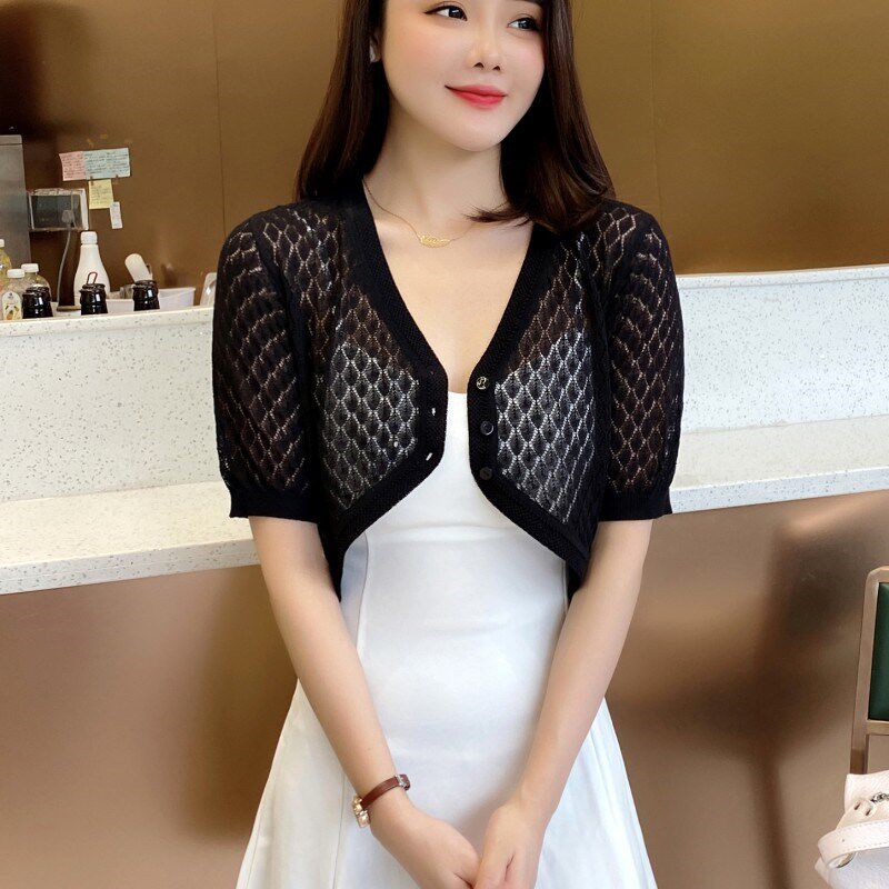 📚 夏季女士短袖针织衫开衫短款冰丝镂空薄款防晒罩衫吊带裙外搭披肩