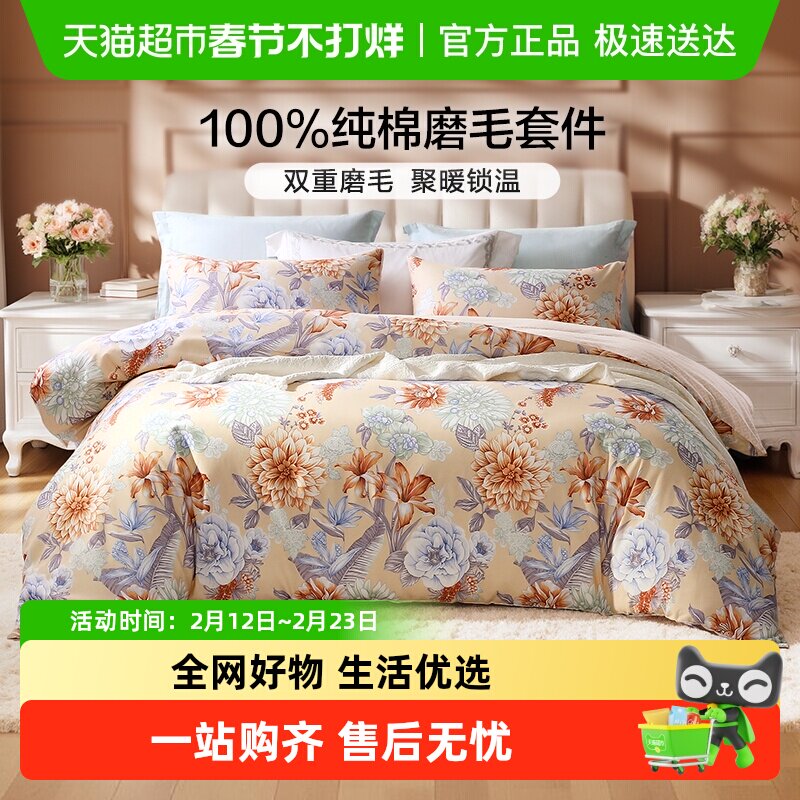 📚 富安娜全棉磨毛四件套纯棉加厚保暖被套床单秋冬天床上用品三件套