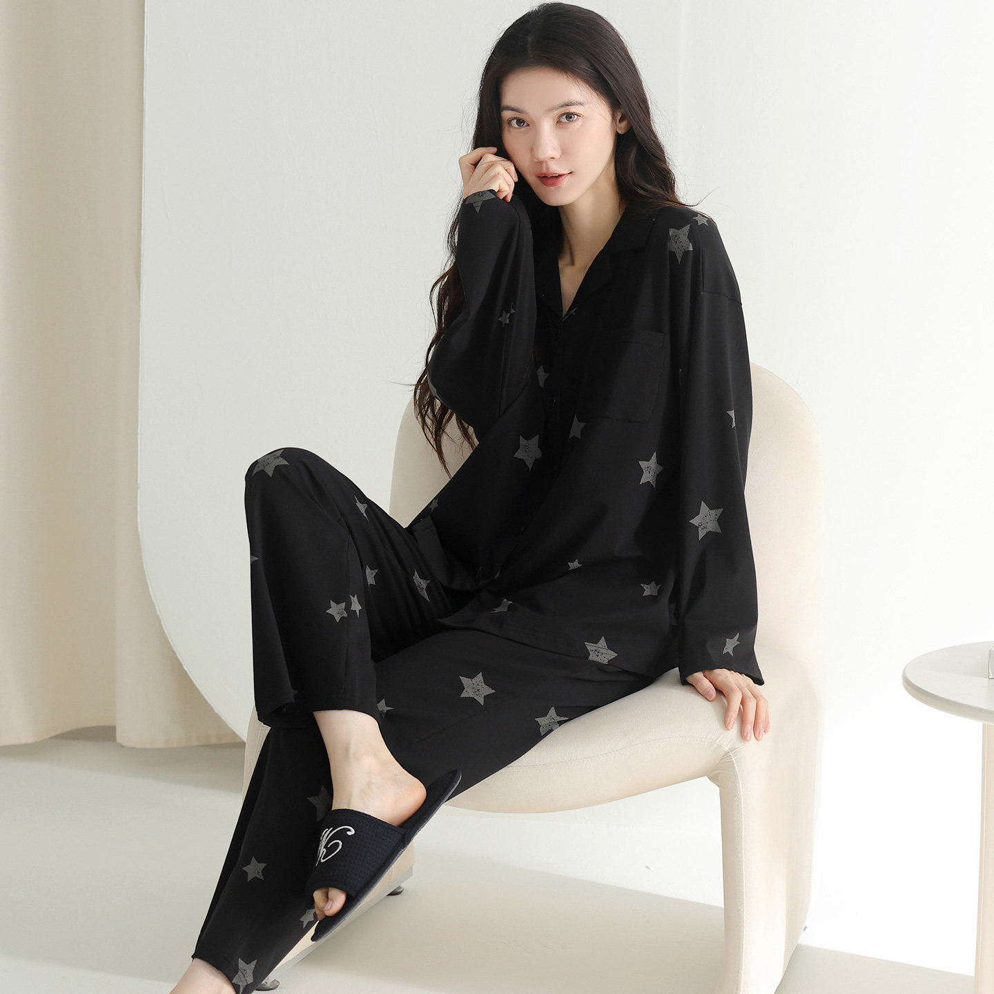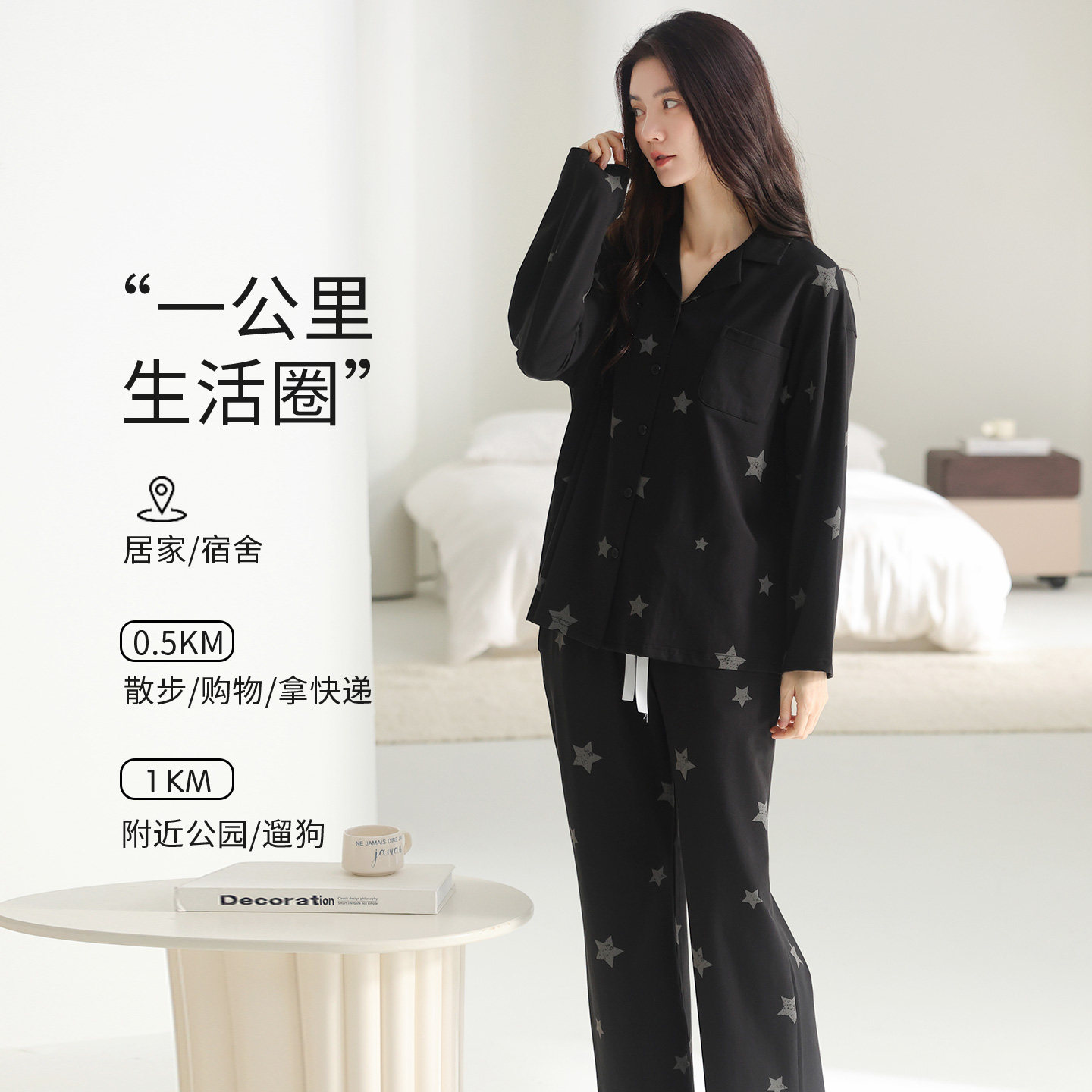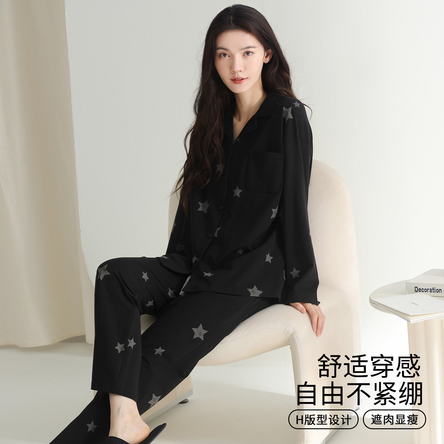 📚 芬腾可安长袖睡衣女款2026新款秋春季纯棉布料100全棉纯黑家居服