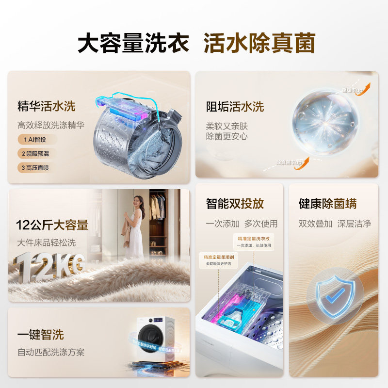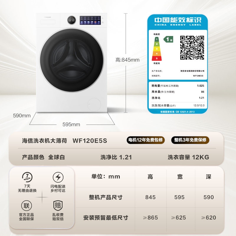 📚 海信洗衣机大薄荷E5S全自动家用12公斤滚筒洗衣机活水洗脱一体机