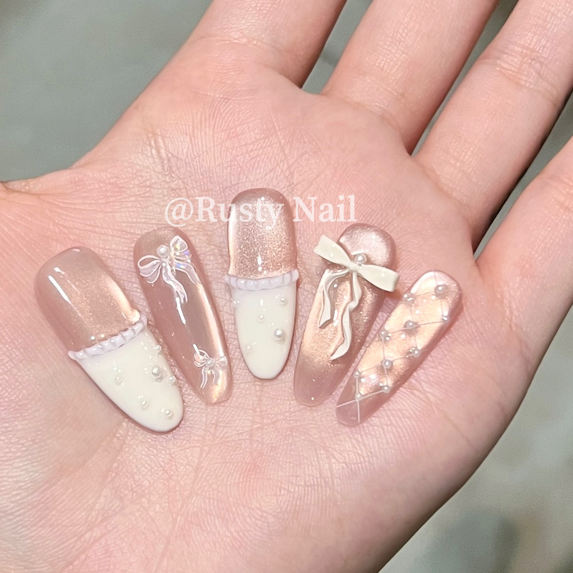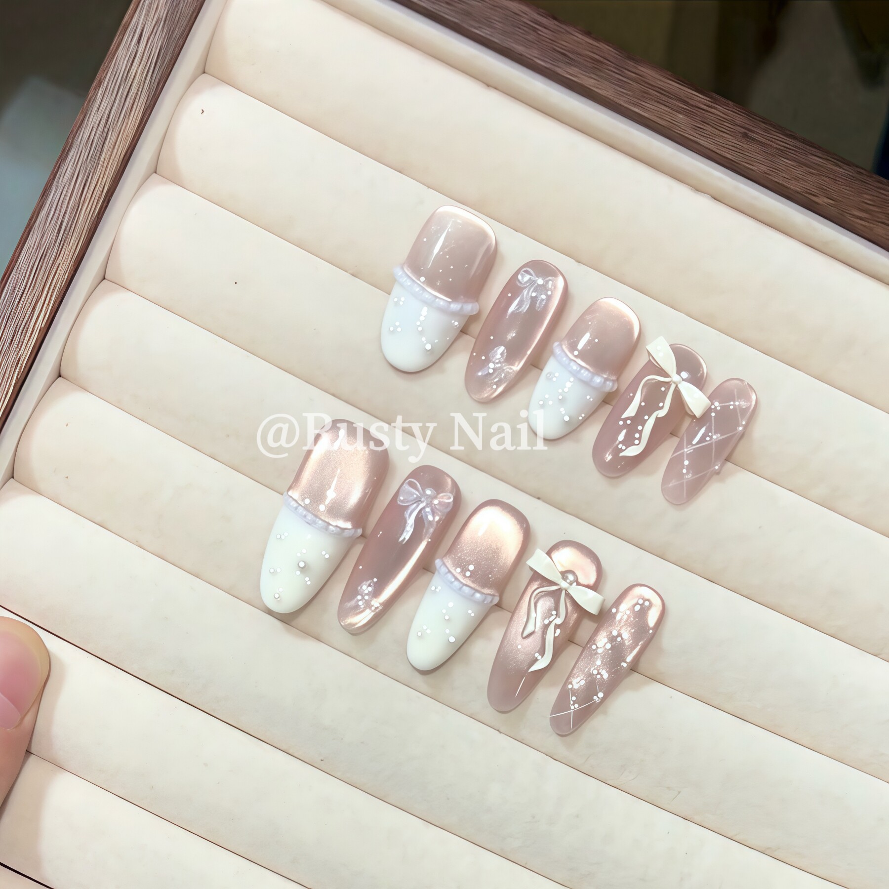 📚 【冰糯奶芙】法式蝴蝶结猫眼纯手工穿戴甲芭蕾风白色菱格美甲贴片