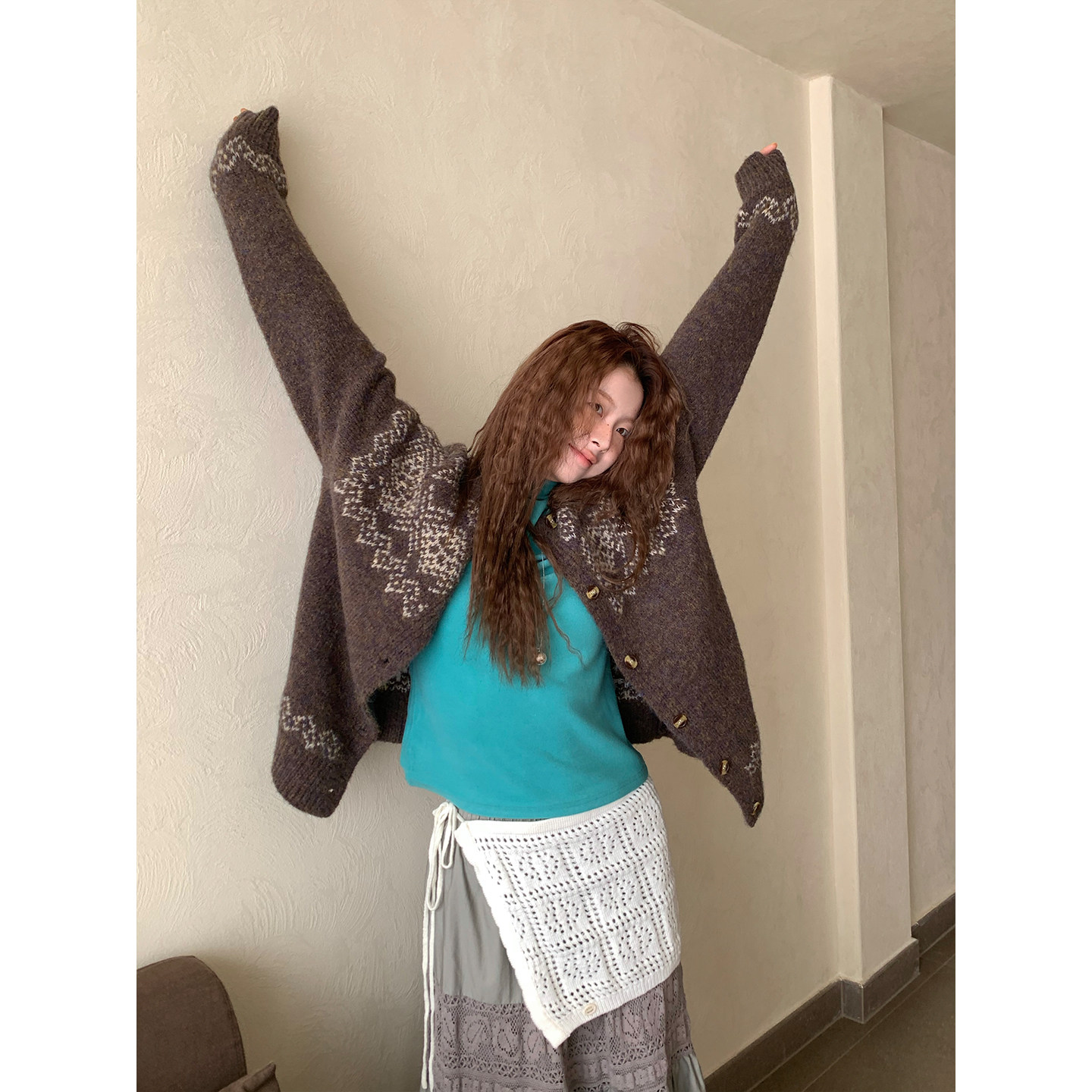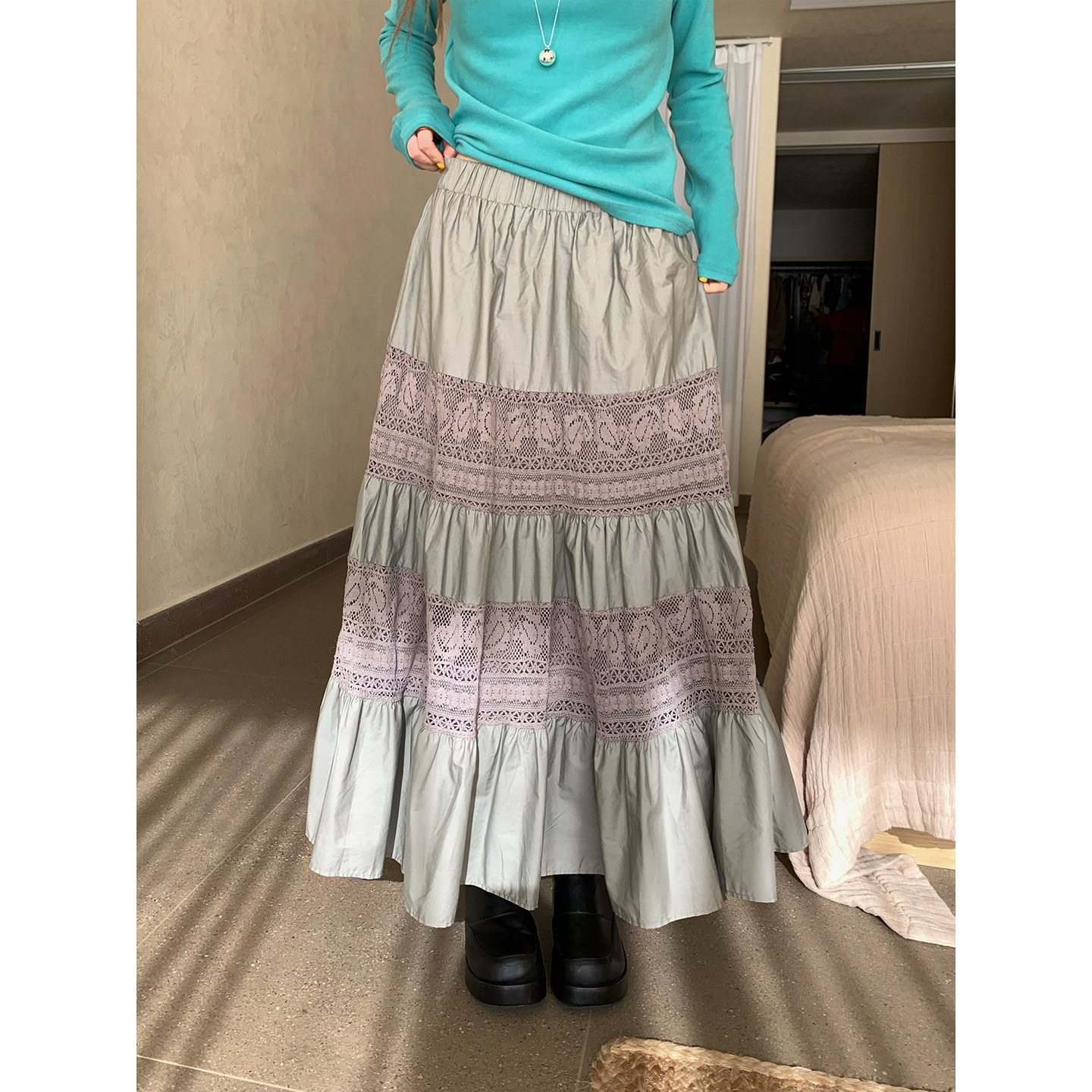 📚 CCKOK 冬季新品 韩系穿搭气质通勤 灰绿色拼接蕾丝半身长裙女