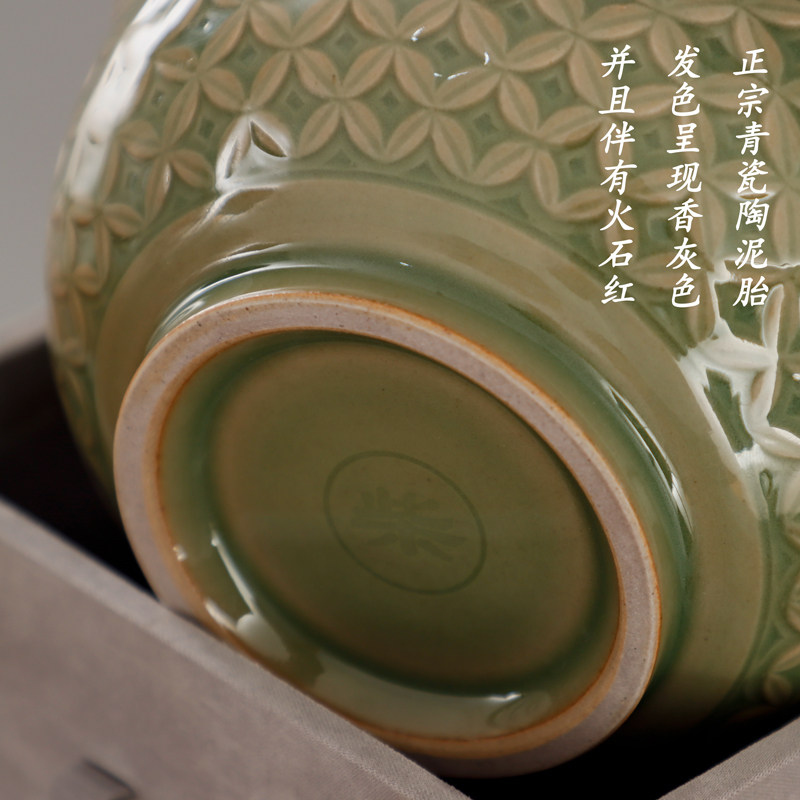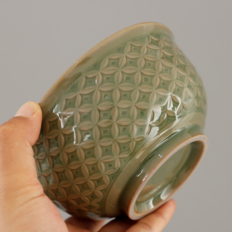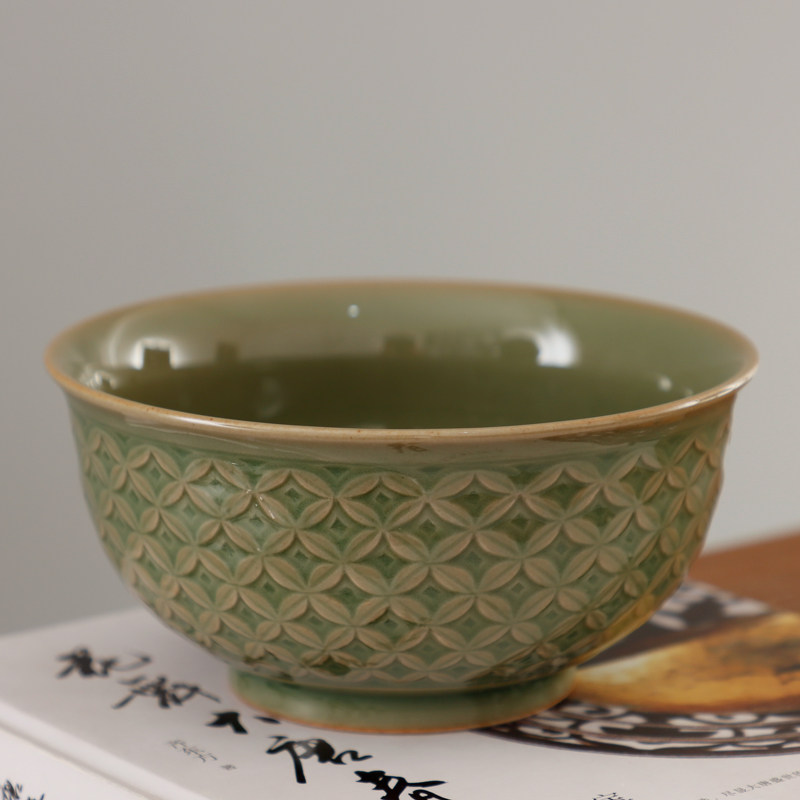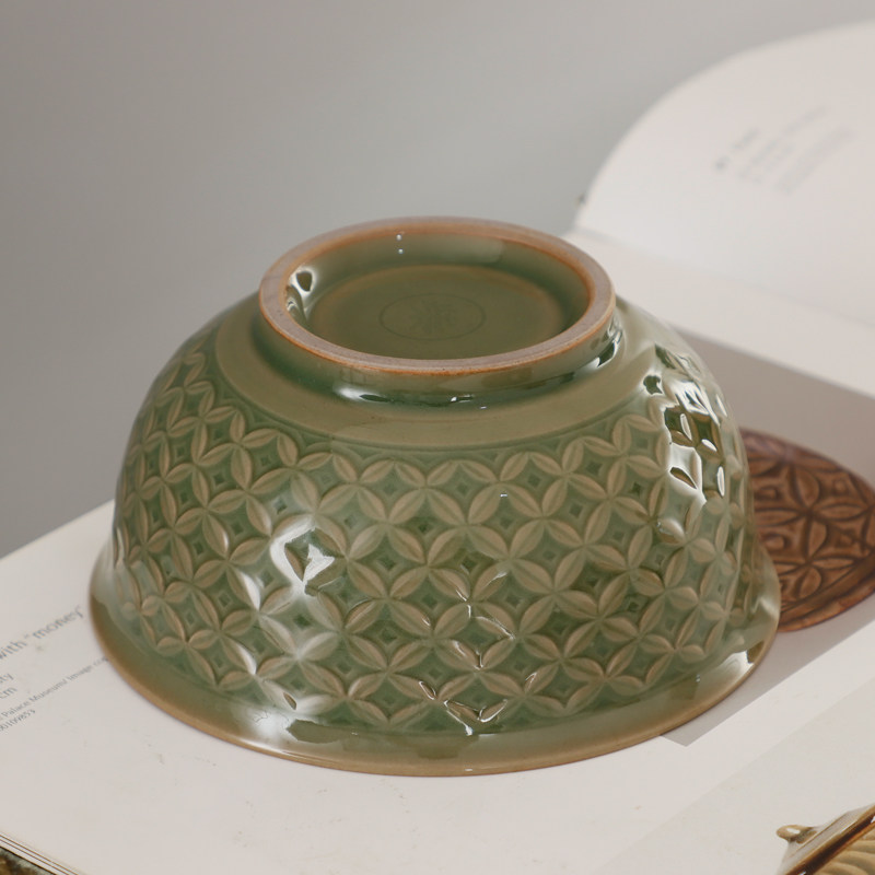 📚 耀州窑新美学橄榄青釉印花半手工粗陶青瓷陶瓷餐具钱多多纹中号碗