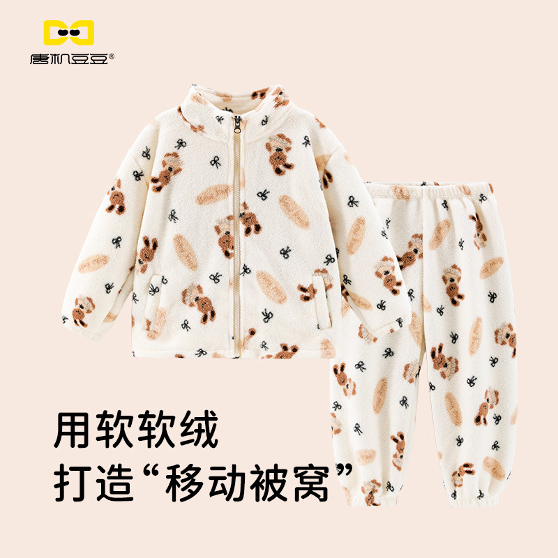 📚 唐机豆豆2025冬季新款女童家居服雪粒绒加厚立领保暖睡衣套装