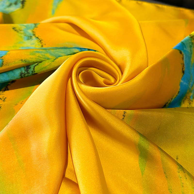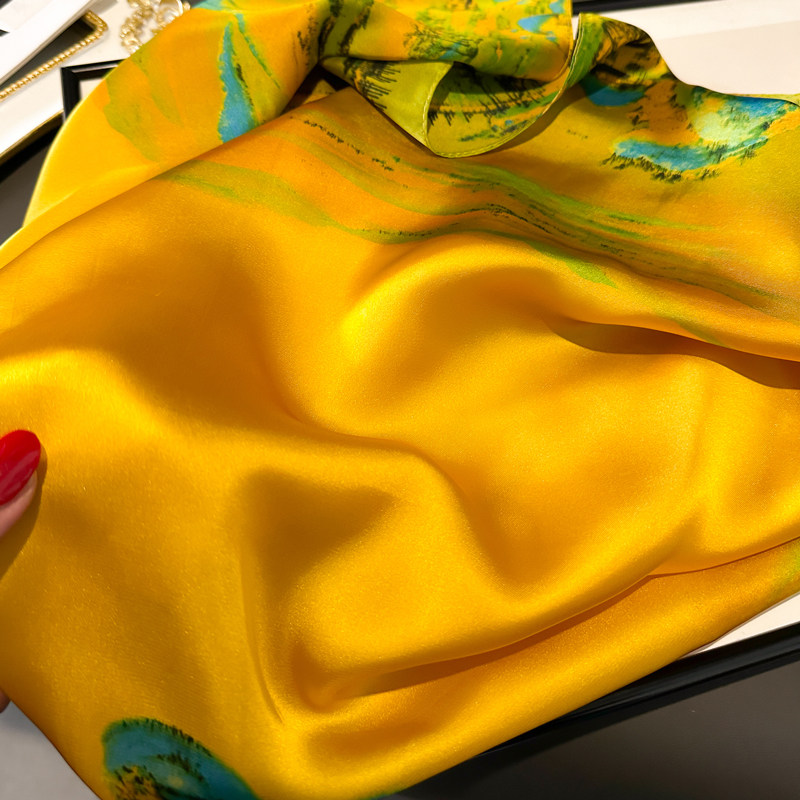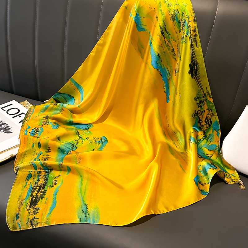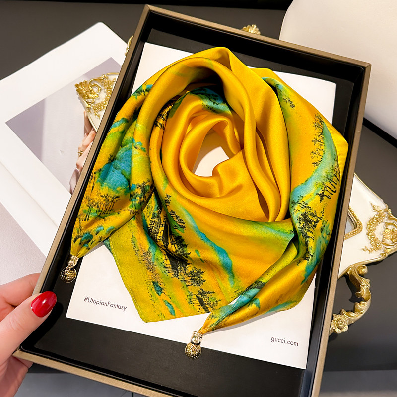 📚 千里江山图磁吸扣三角小方巾丝巾女黄色春秋夏季护颈围脖子围巾70