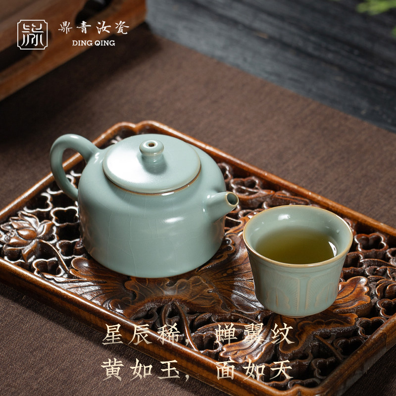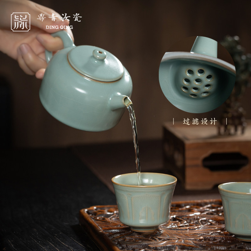📚 问鼎开片复古鼎青汝瓷井泉幽兰套组茶杯小茶壶家用泡茶壶开片可养