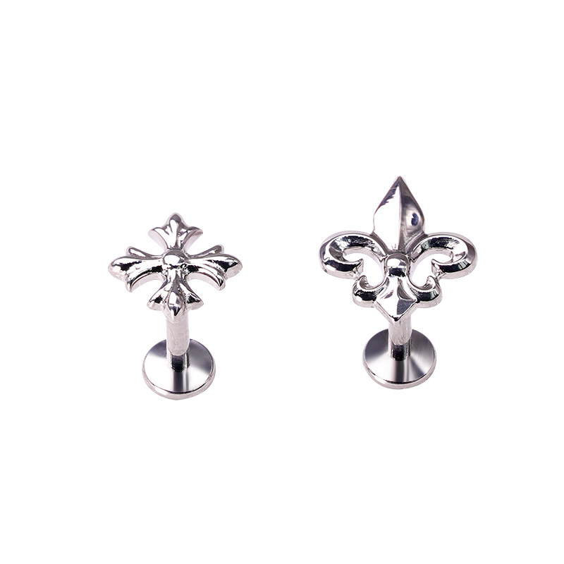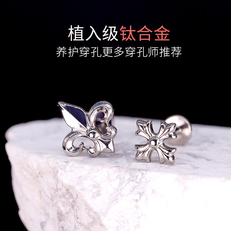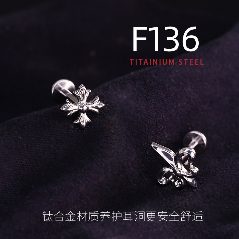 📚 rock boilF136钛合金十字架耳钉轻奢复古内螺纹鸢尾花耳骨钉哥特