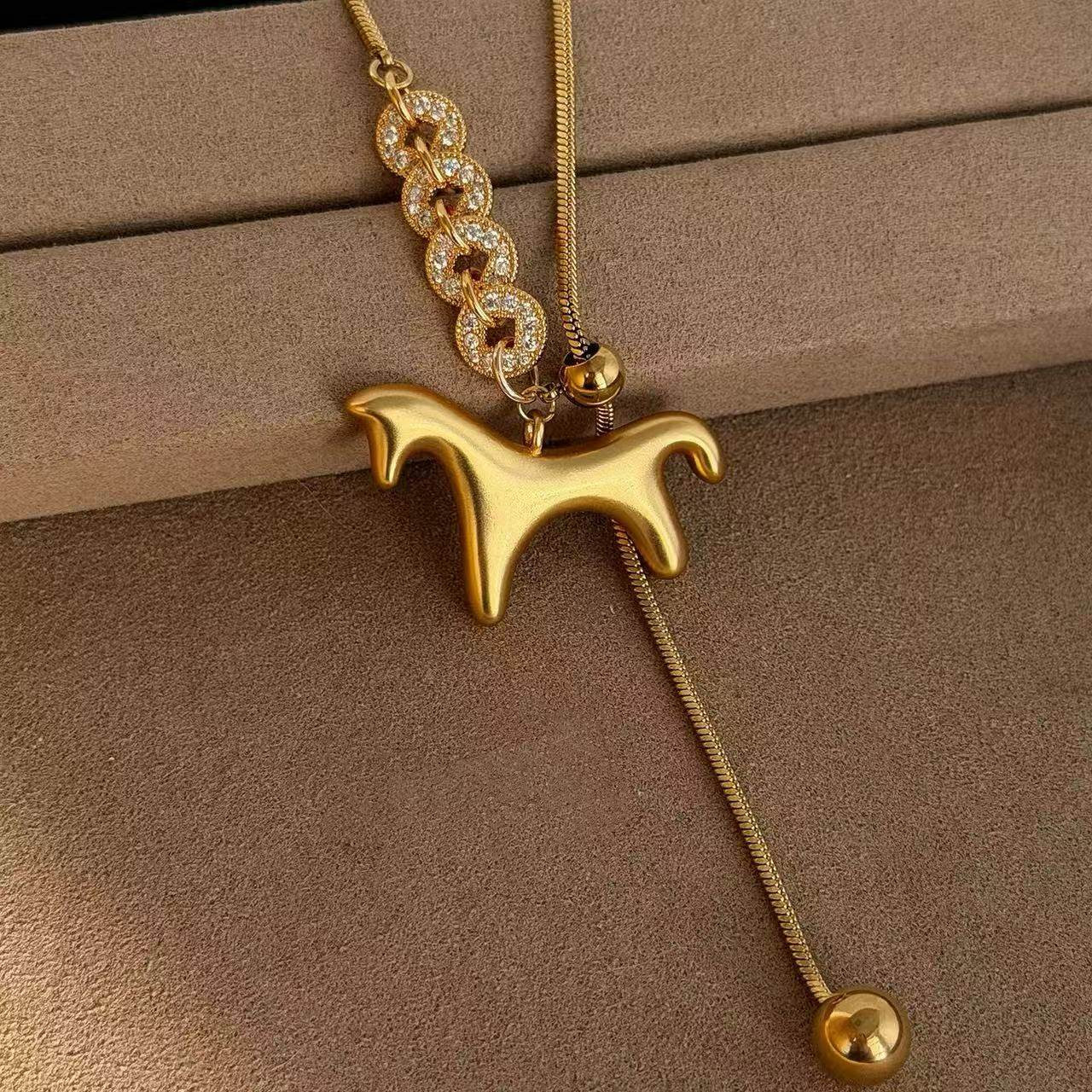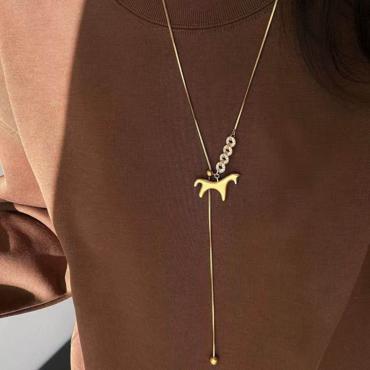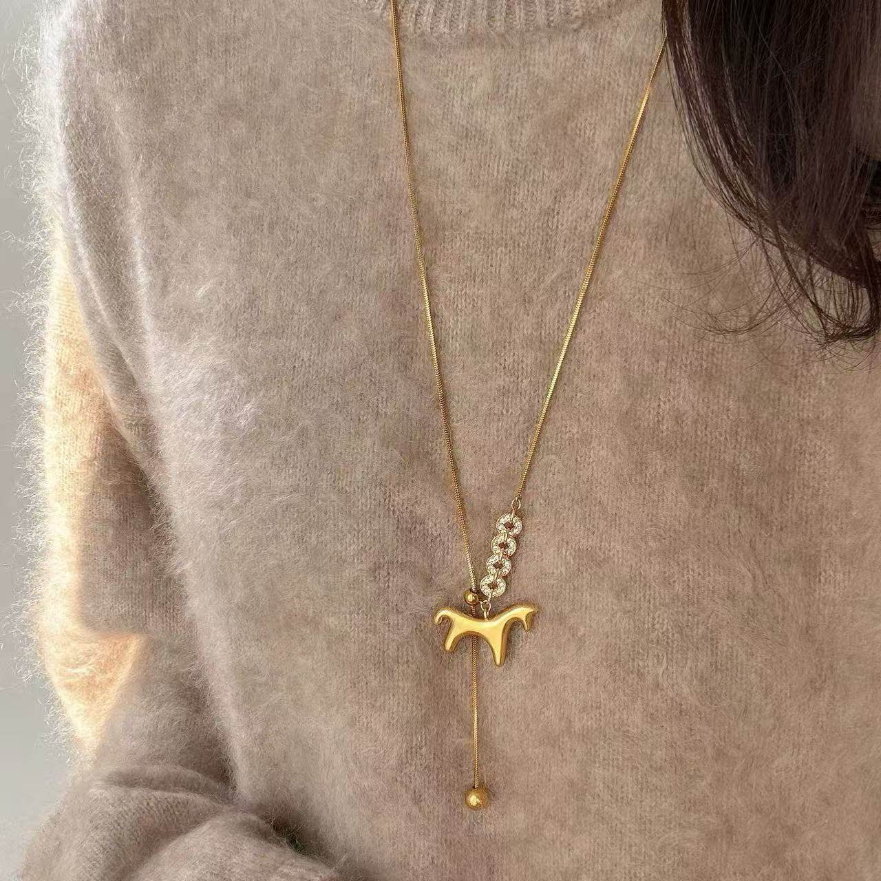 📚 马上有钱黄金色小马铜钱毛衣链女满钻轻奢贵气金色马年老钱风项链