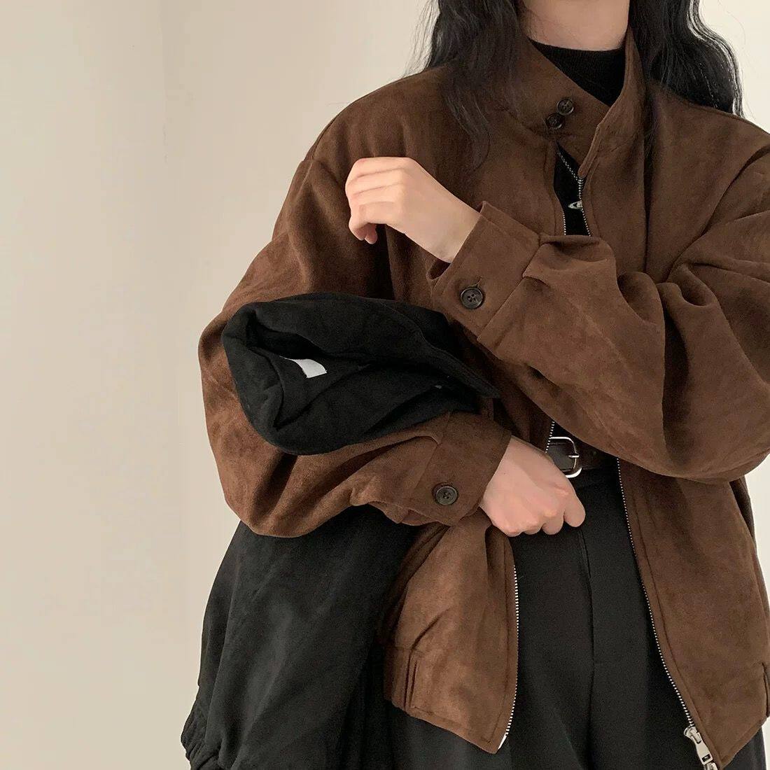 📚 美式复古麂皮绒外套女春秋季新款设计感小众飞行员短款夹克上衣潮