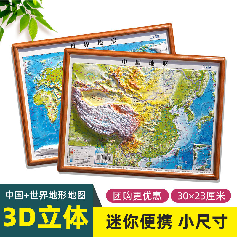 📚 【2026年精雕版】中国地图和世界地图3d立体凹凸地形图 小尺寸30x23厘米 迷你桌面便携式 学生用地理地形地貌三维图