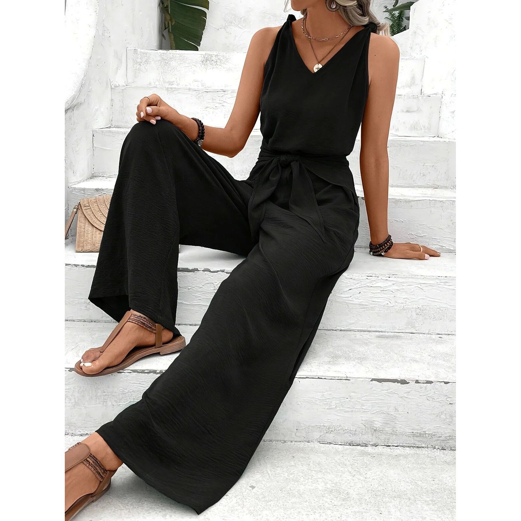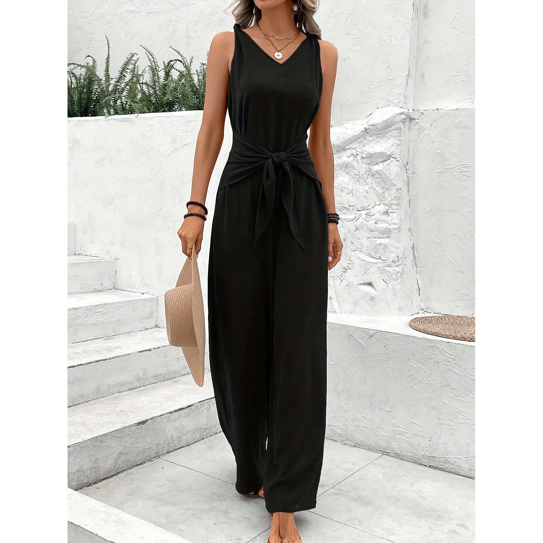 📚 纯色女士V领无袖阔腿连体裤V-neck sleeveless wide leg jumpsuit