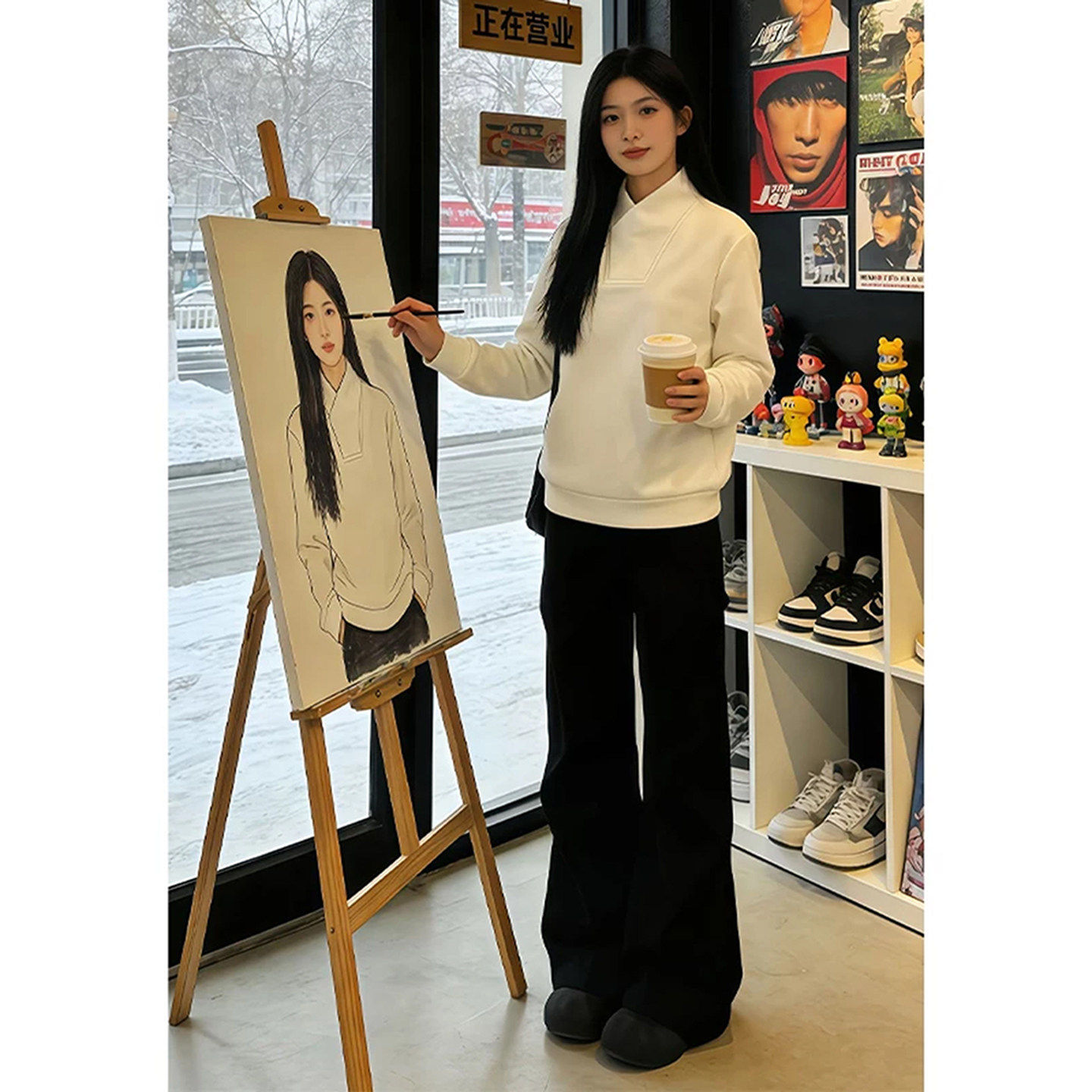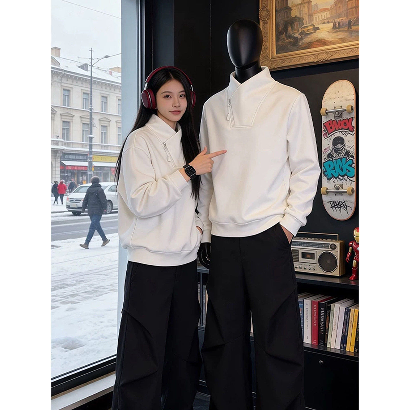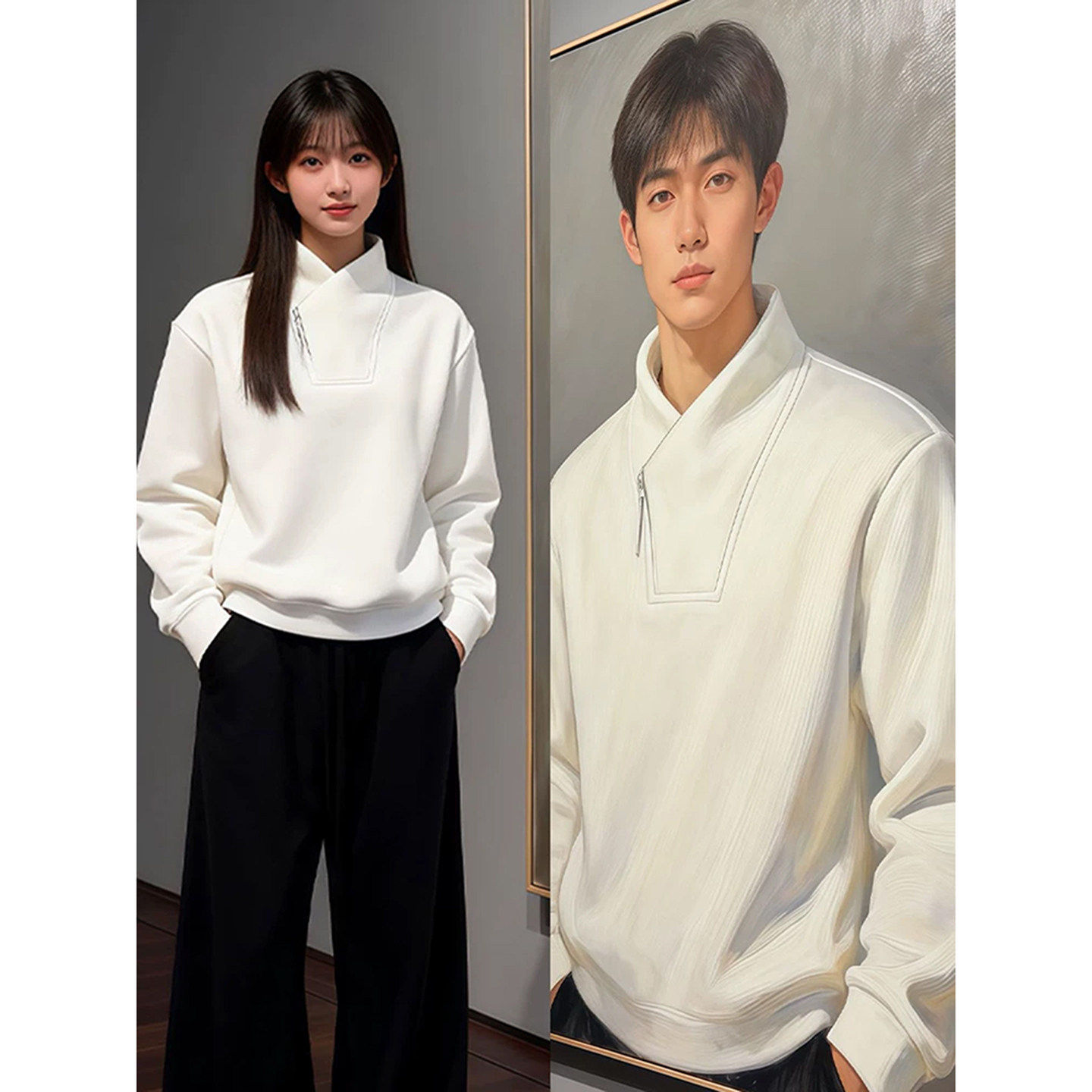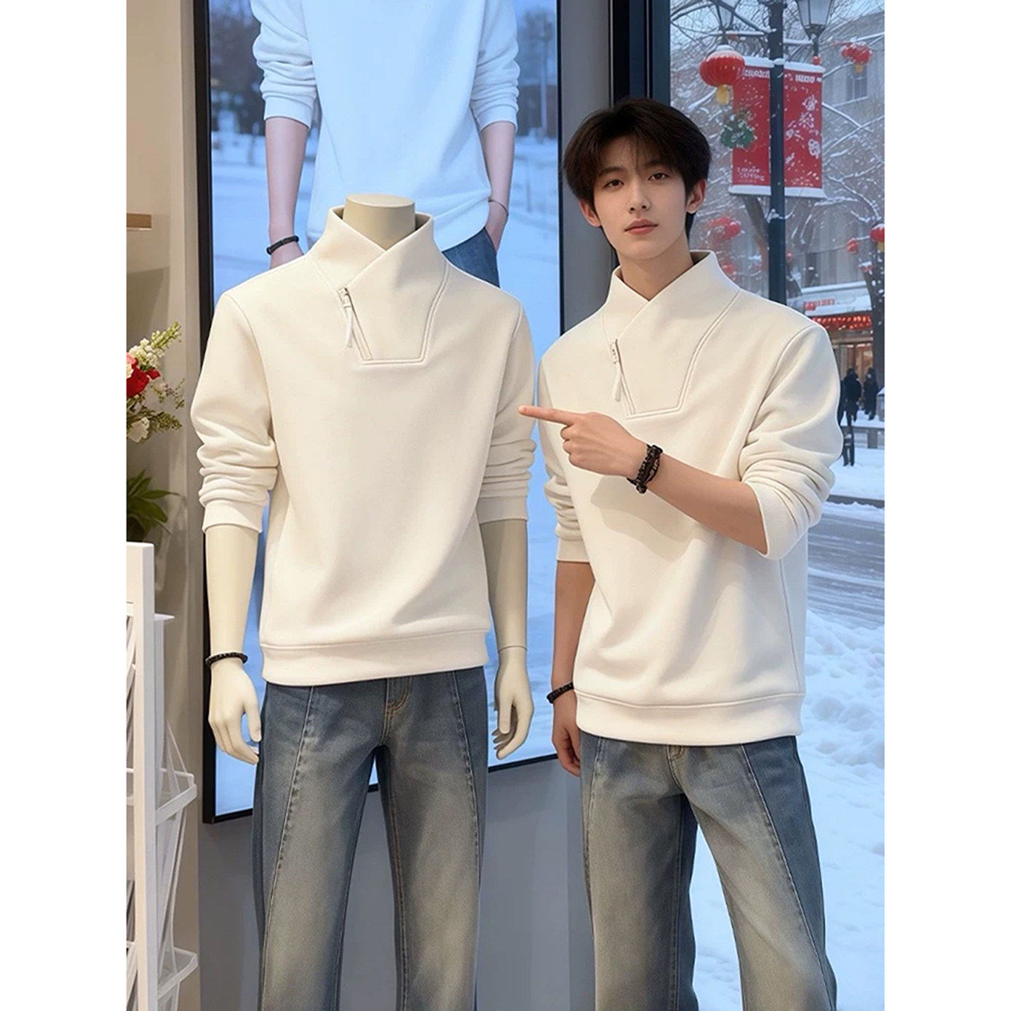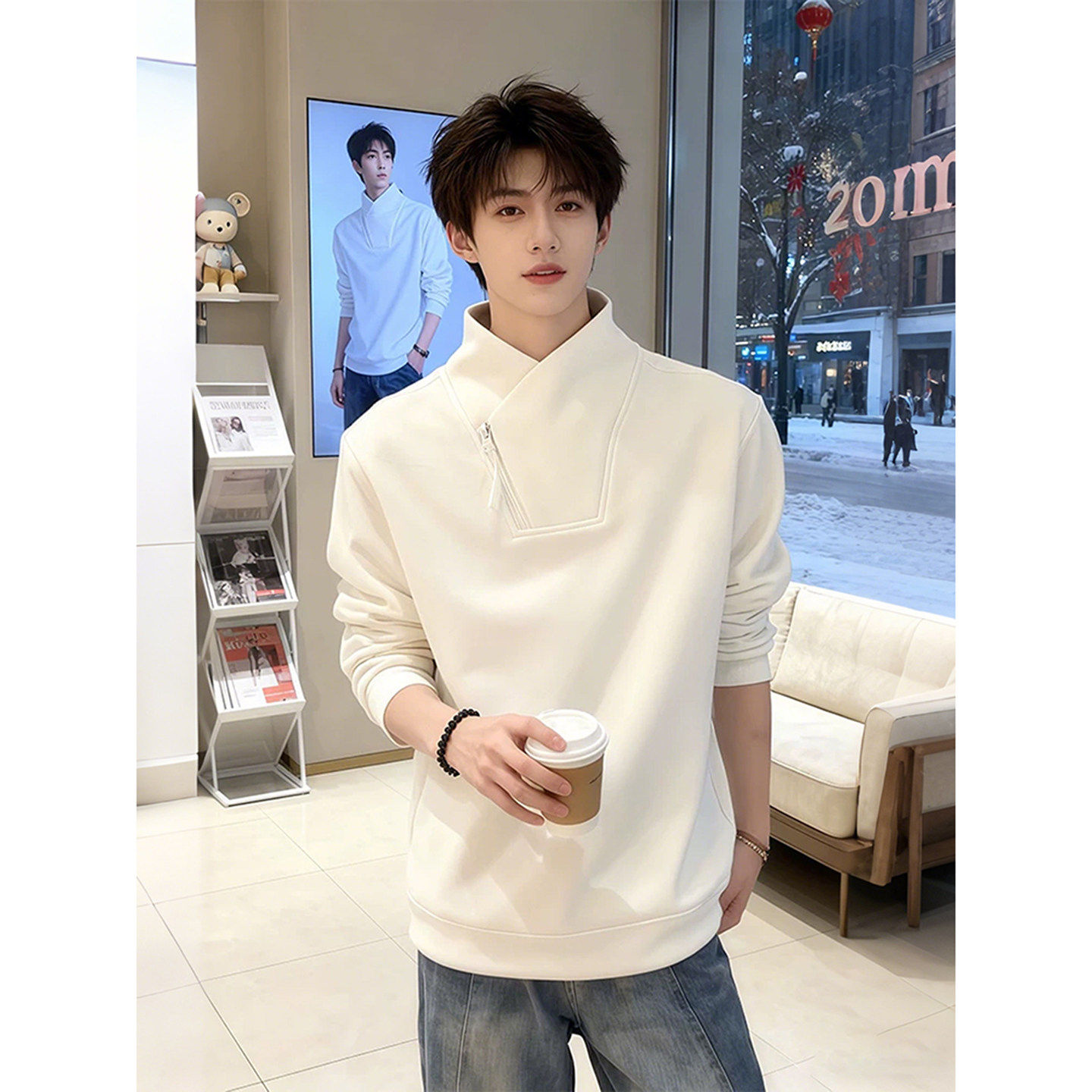 📚 白色斜领拉链短款卫衣男秋冬重磅长袖t恤正肩立领加绒内搭打底衫
