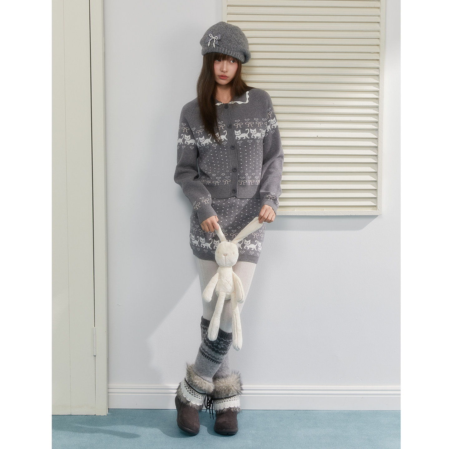 📚 ECHOSTA小猫爱心费尔岛提花复古针织开衫外套上衣包臀短裙套装