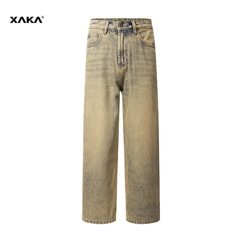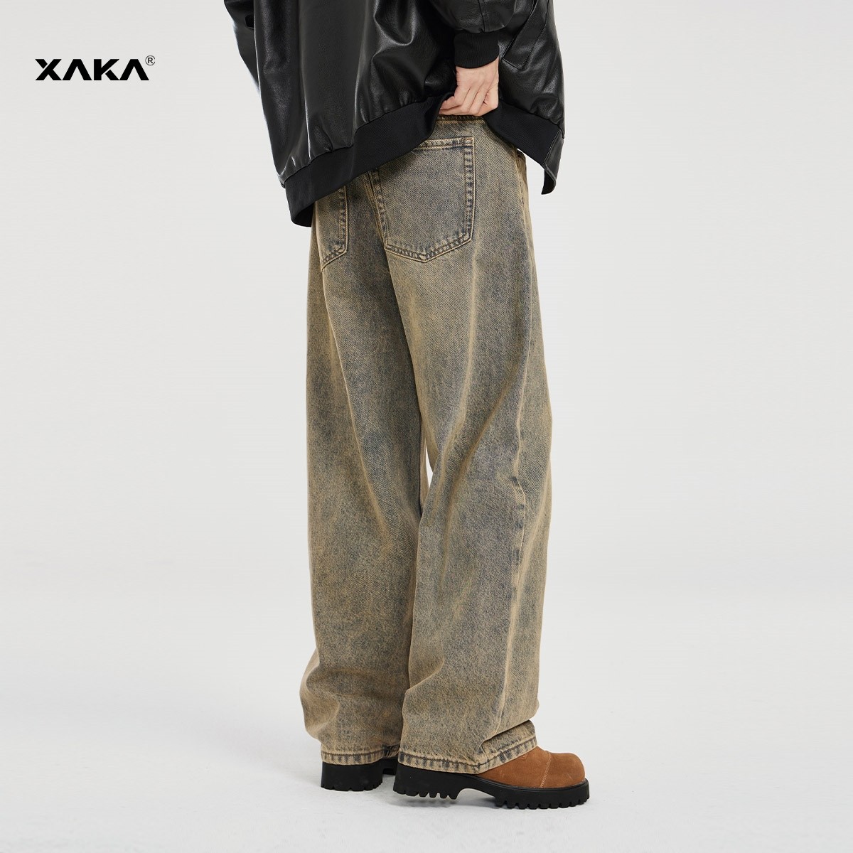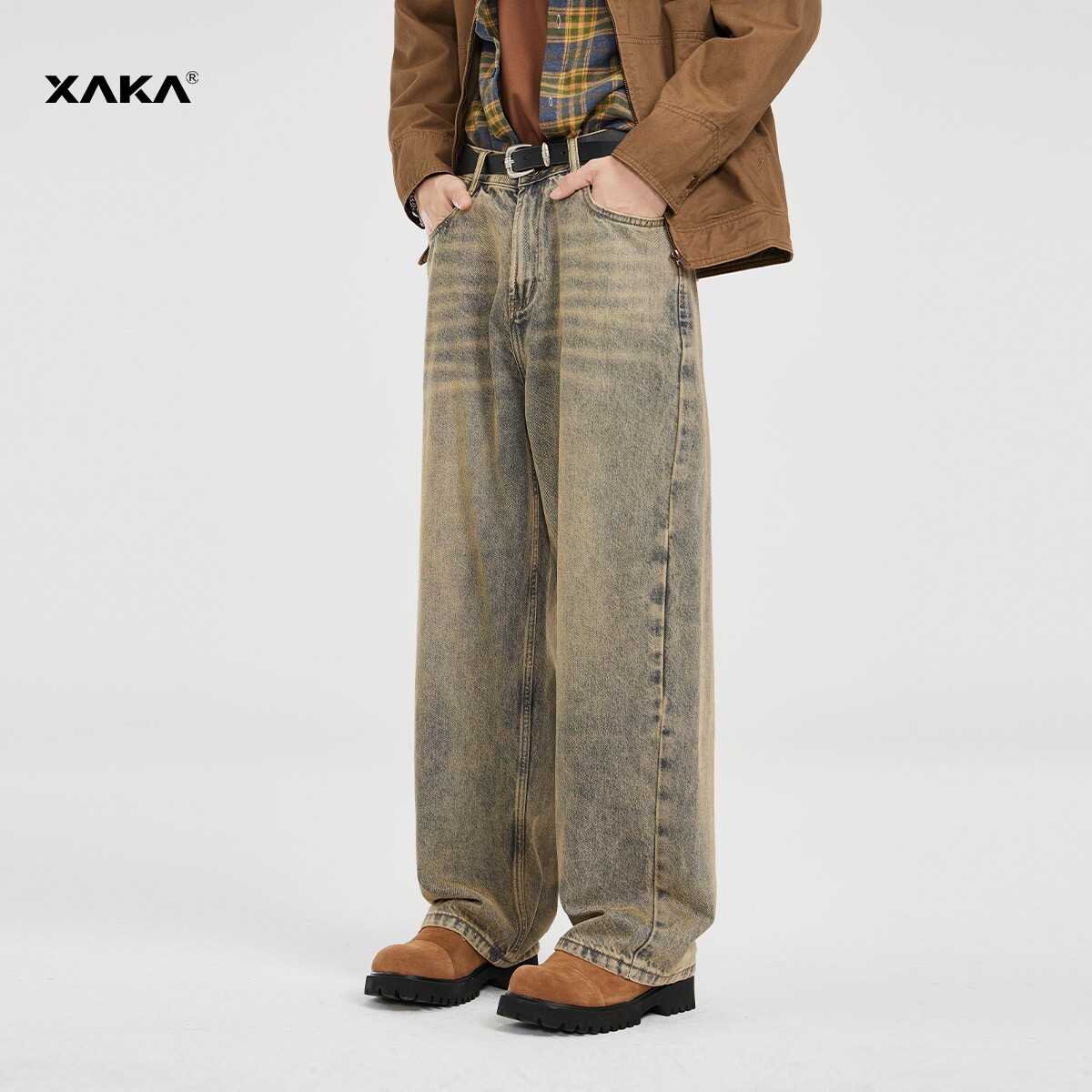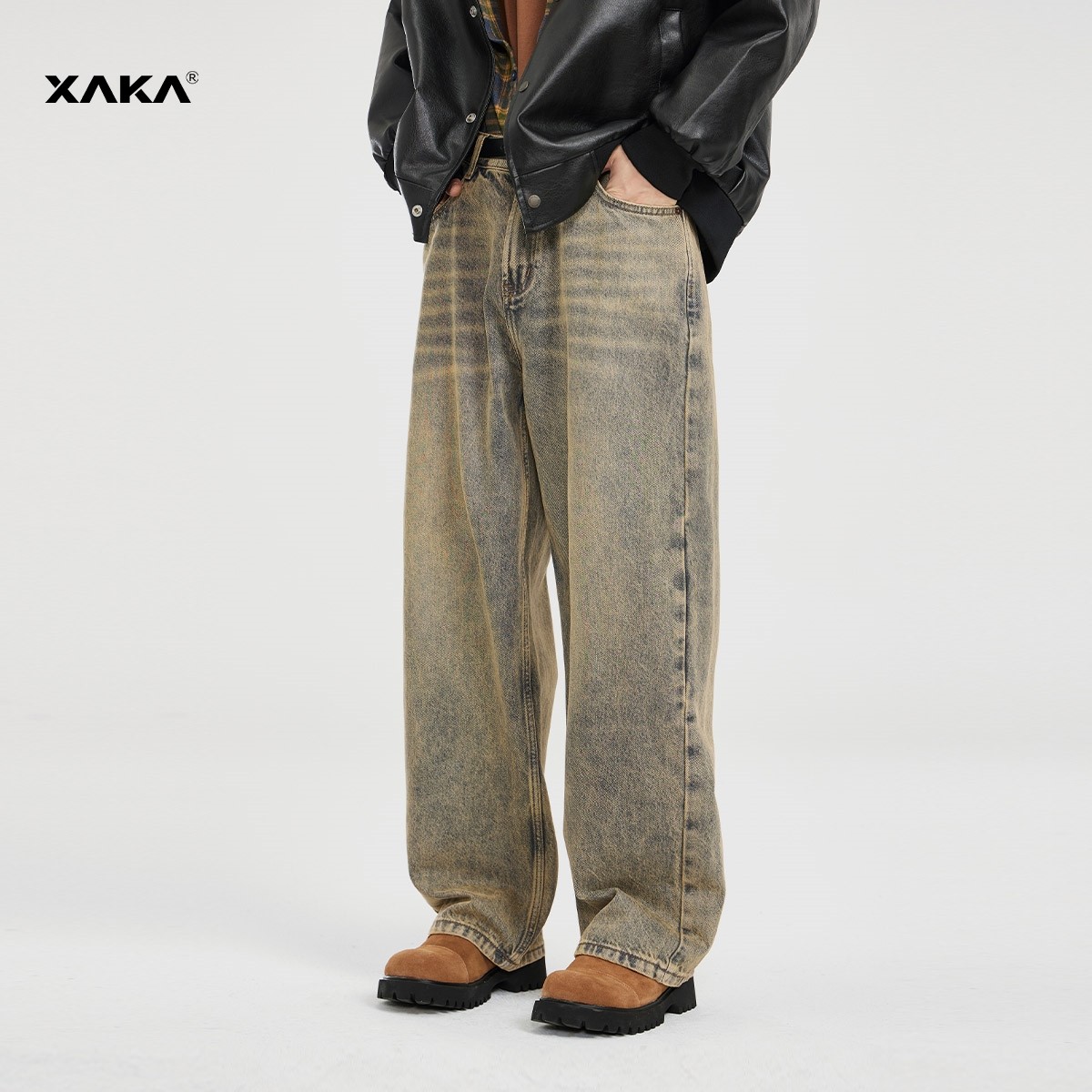 📚 XAKA美式复古赛络纺黄泥染牛仔裤男美拉德高街宽松直筒阔腿长裤子