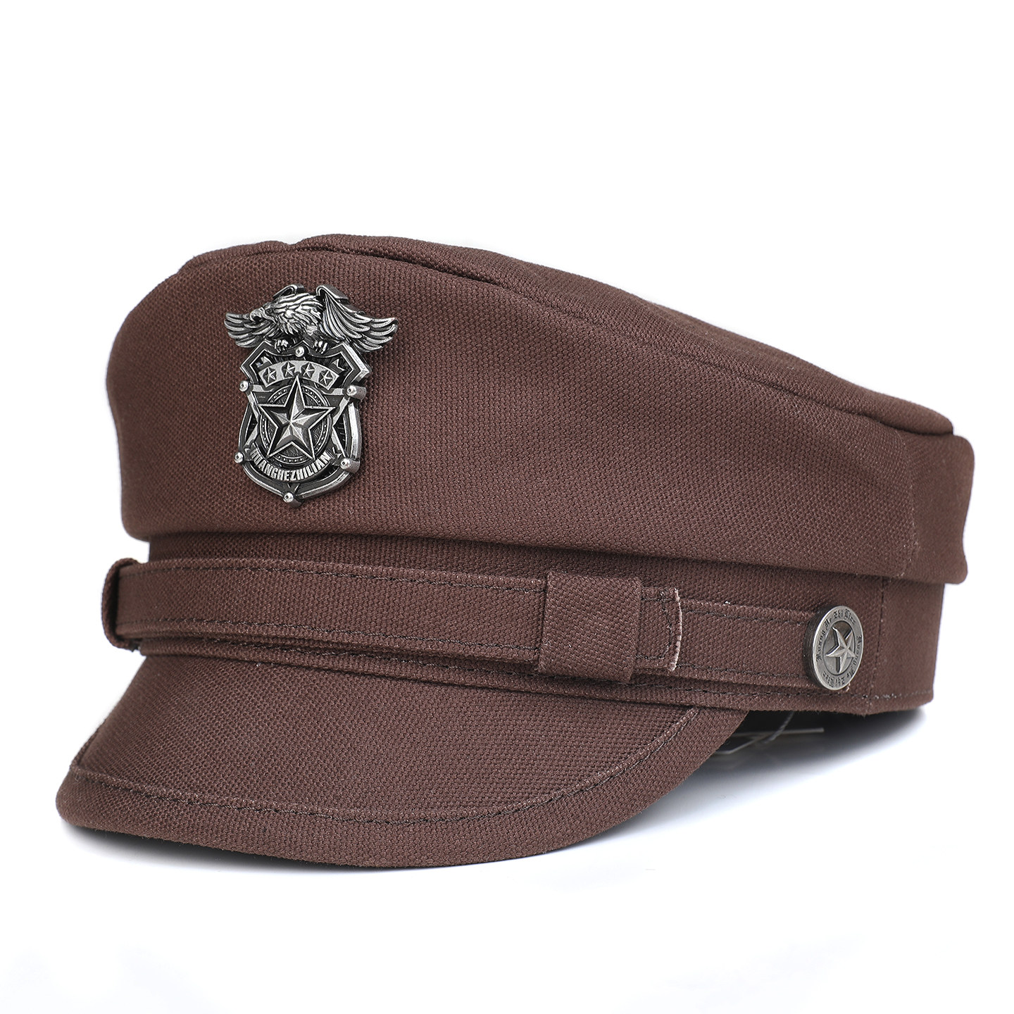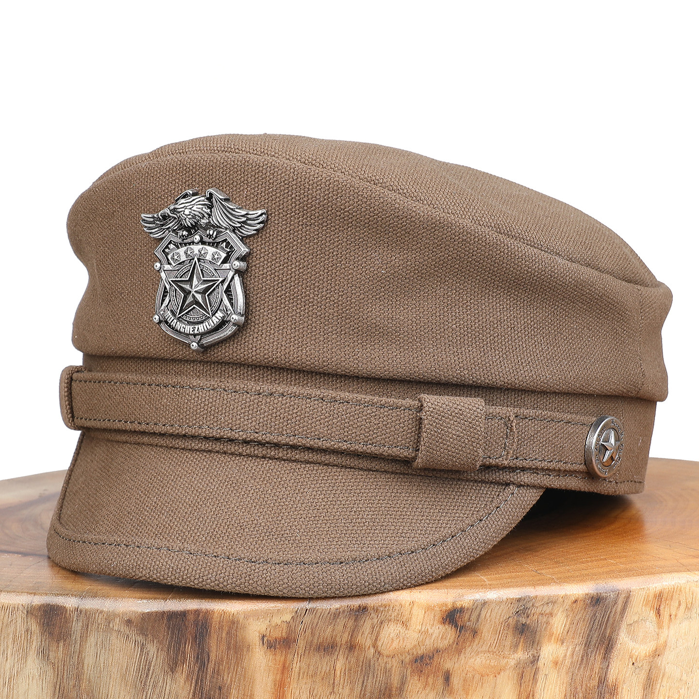 📚 帆布新款春秋平顶外贸机车男士帽子复古徽章鸭舌帽中老年水手船长