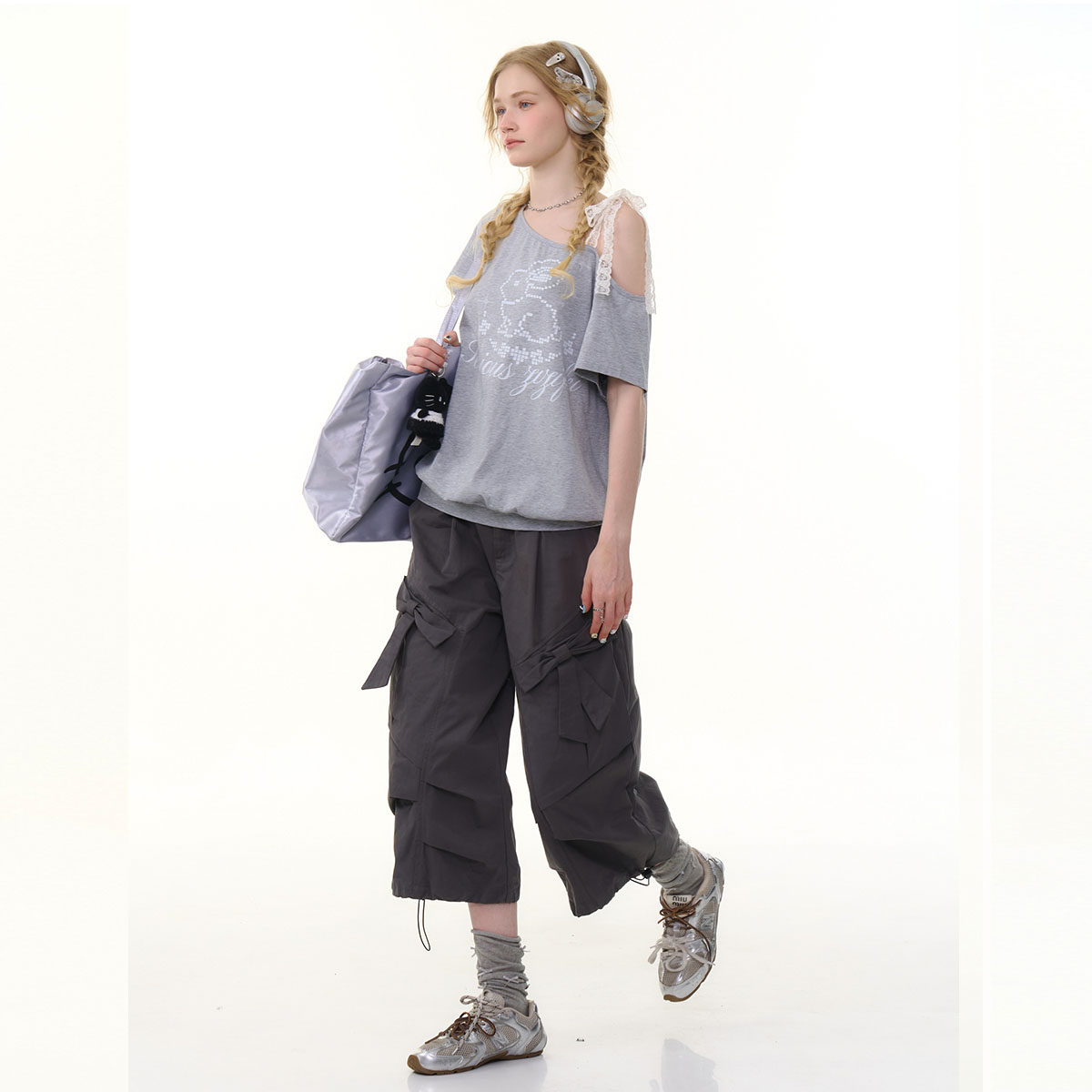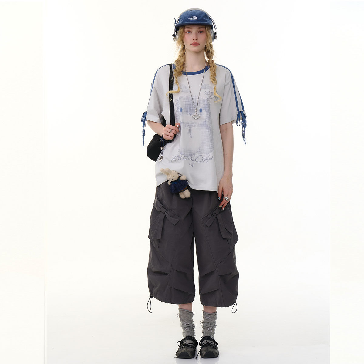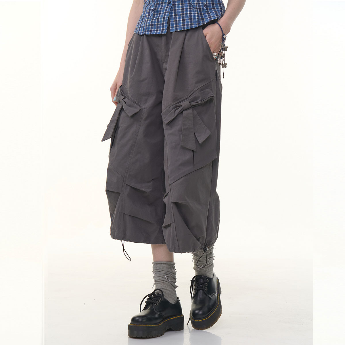 📚 ziziFei夏美式设计感深灰色高腰蝴蝶结阔腿直筒工装休闲七分裤女