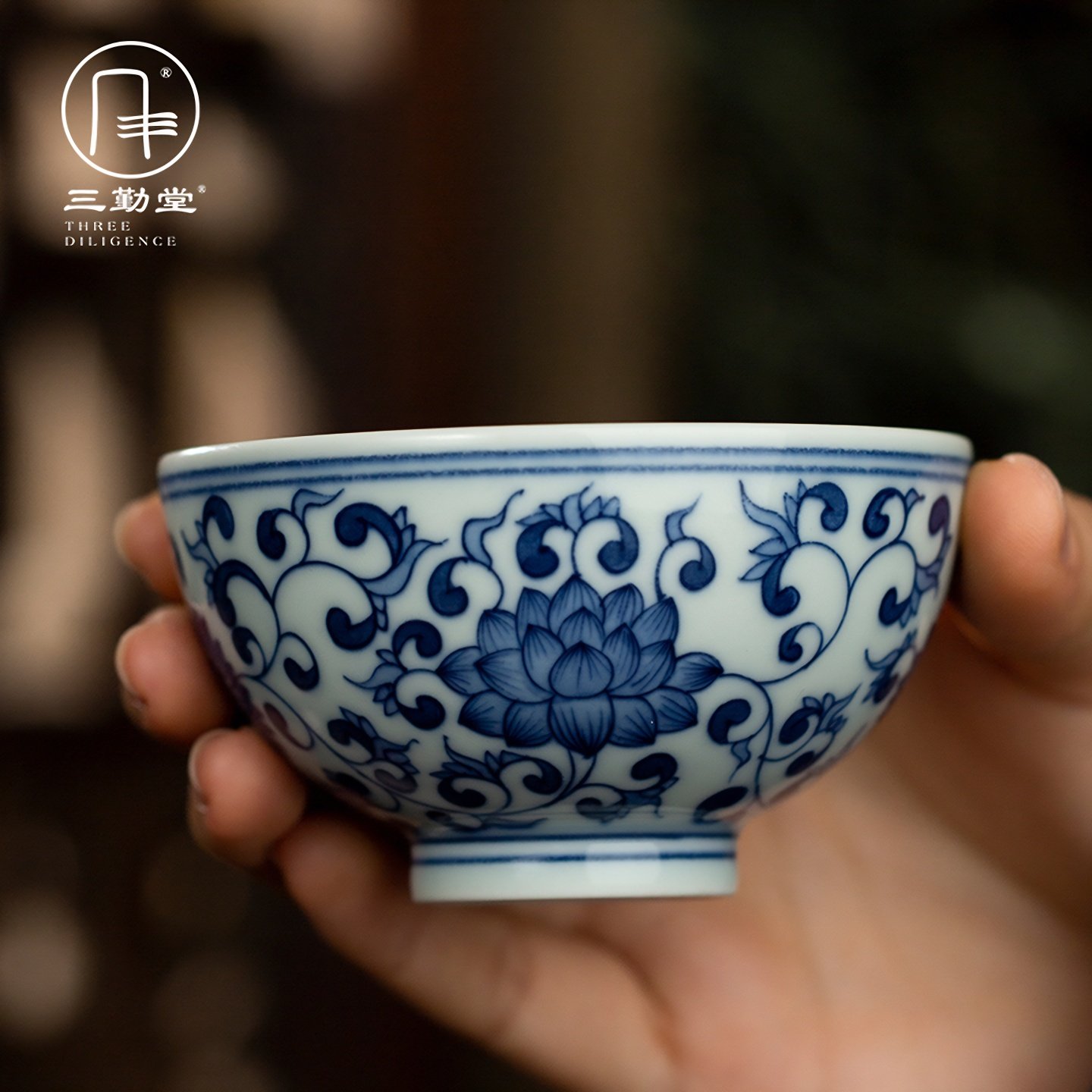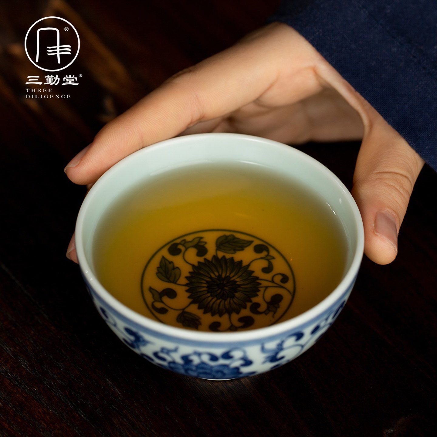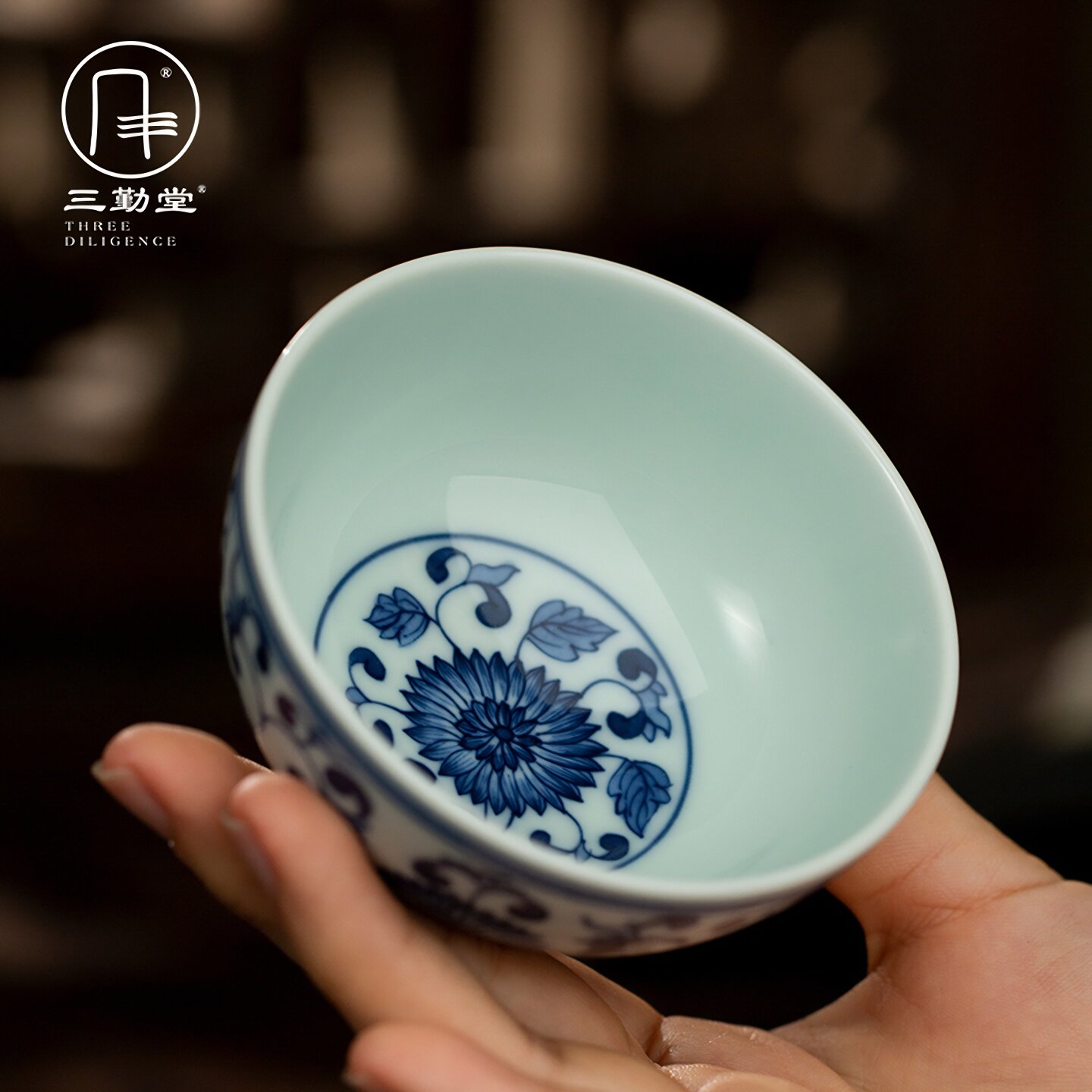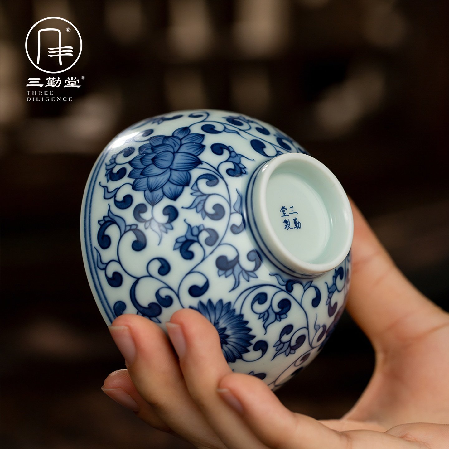📚 三勤堂青花缠枝鸡心单杯手绘釉下青瓷主人杯子景德镇手工功夫茶具