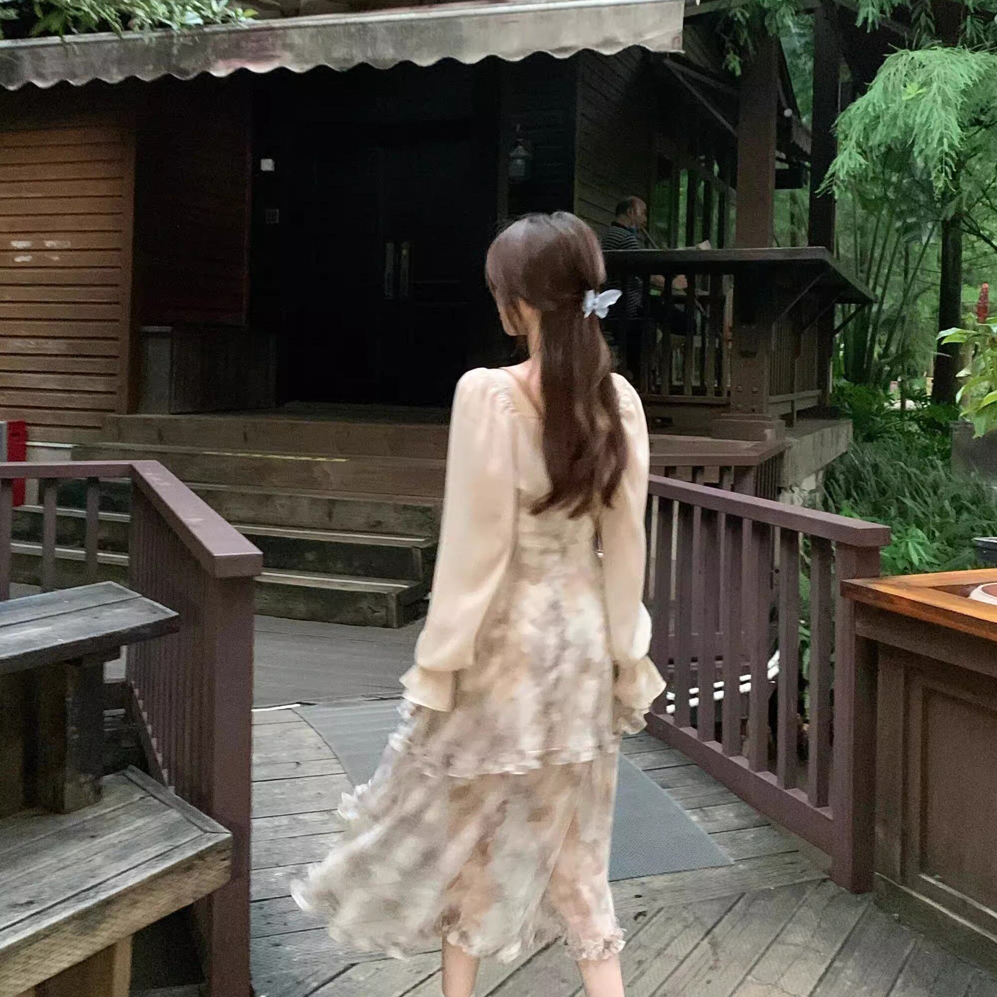 📚 2026新款水墨江南吊带连衣裙气质晕染飘逸感碎花长裙夏开衫两件套