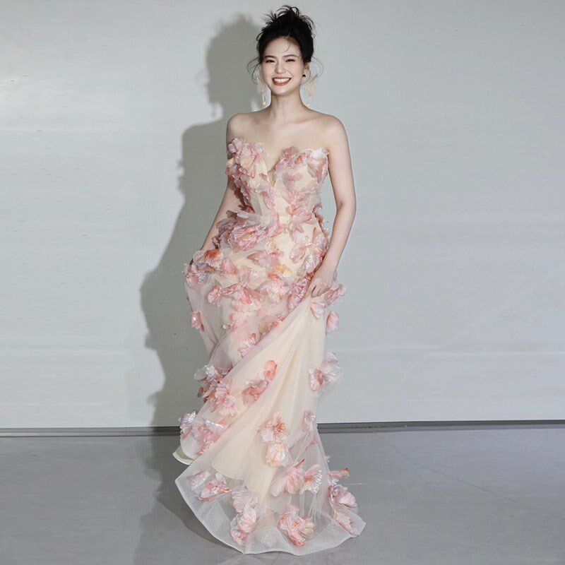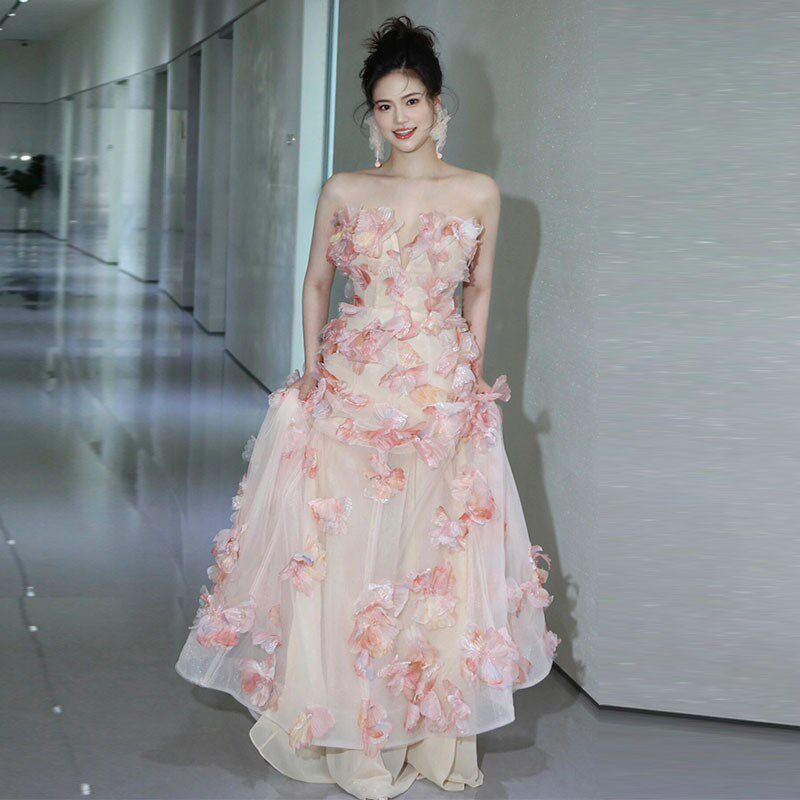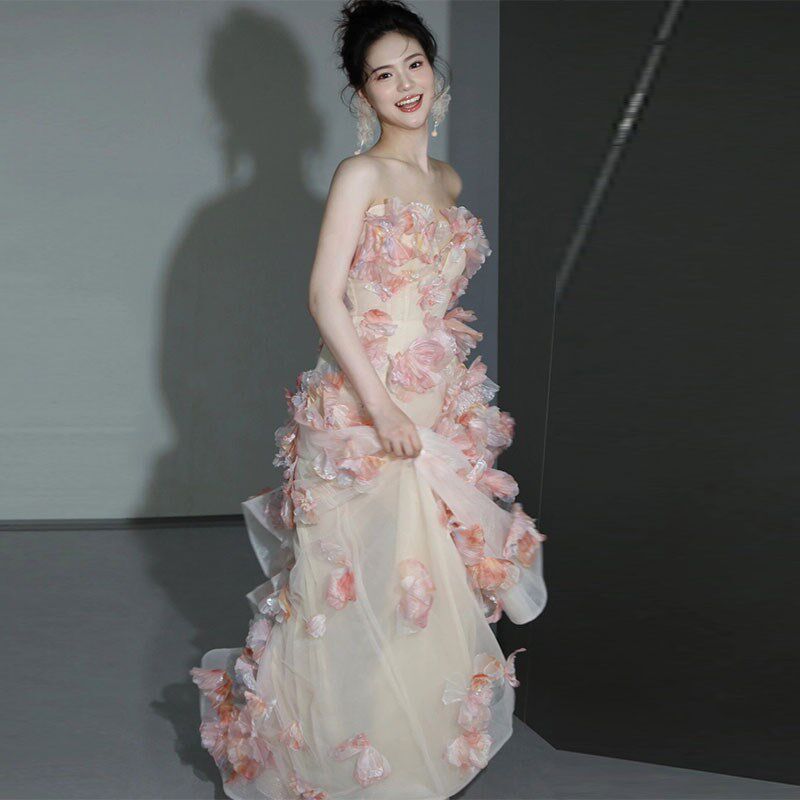 📚 粉色新娘敬酒服2025新款高端生日宴会主持人抹胸晚礼服裙声乐艺考
