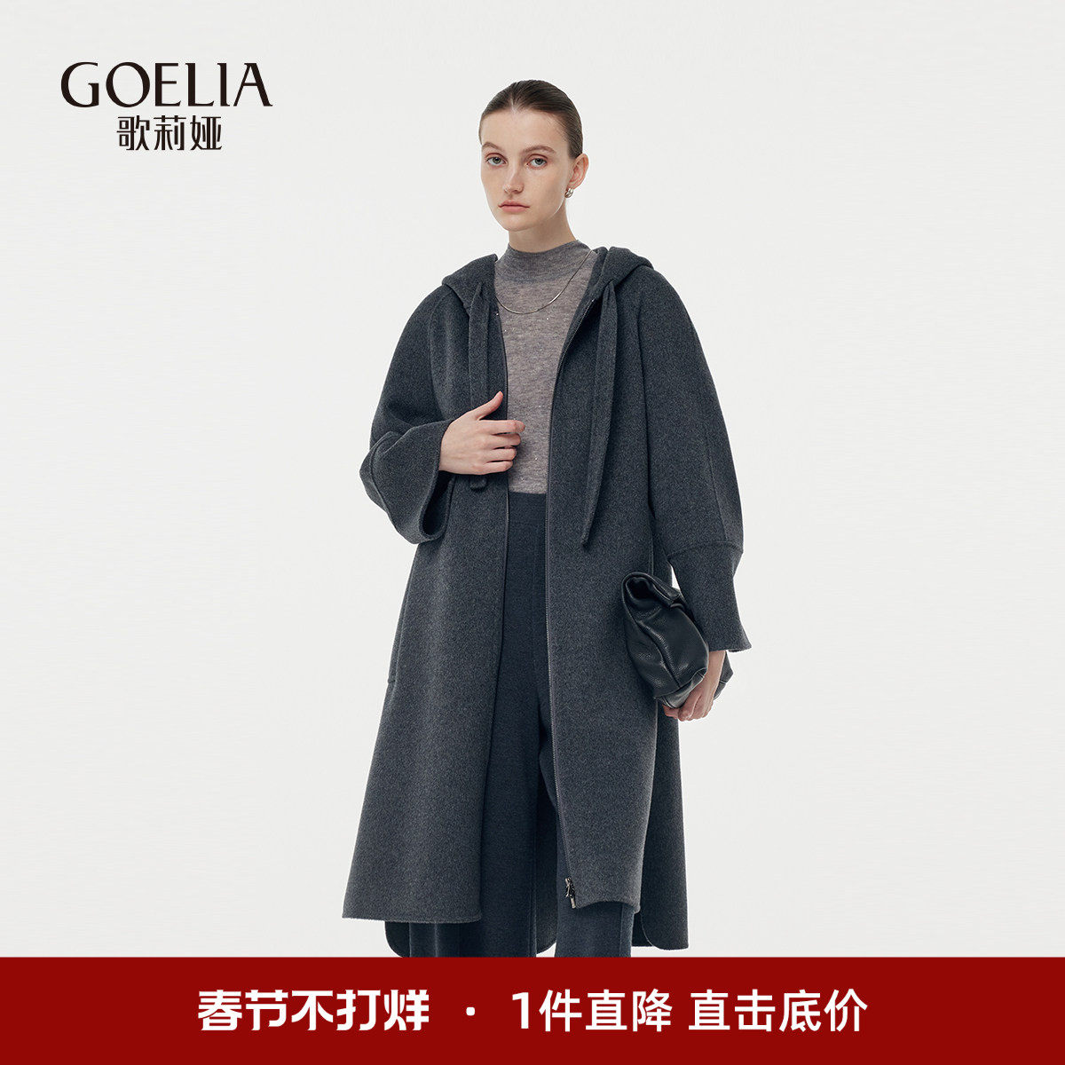 📚 首降5折|歌莉娅灰色全羊毛大衣女冬季连帽拉链双面毛呢中长款外套