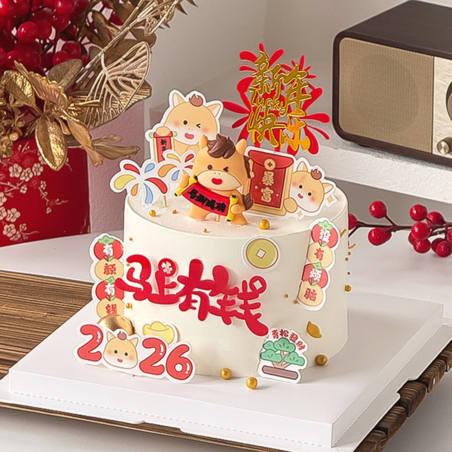 📚 新年快乐蛋糕装饰马到成功摆件2026年马上有钱亚克力跨年礼花插件