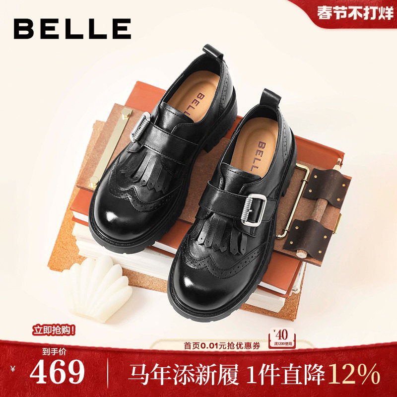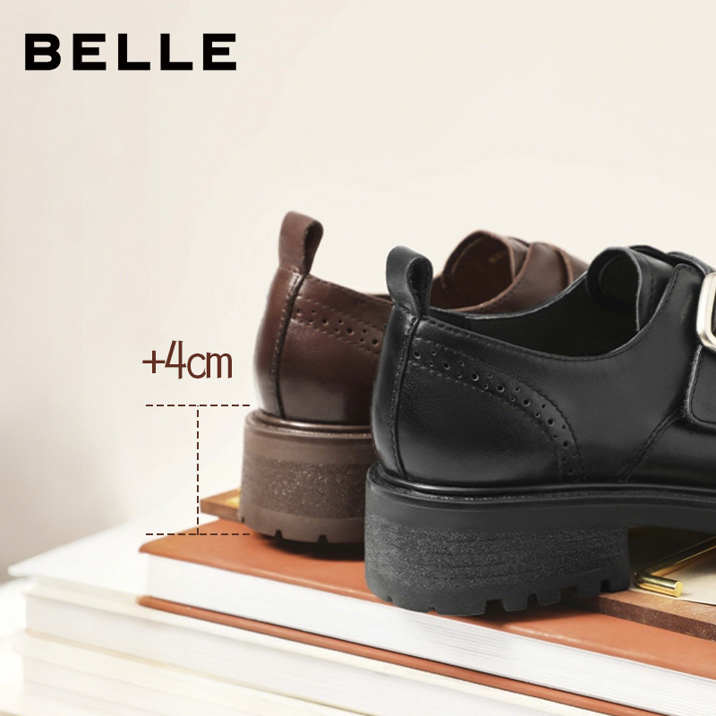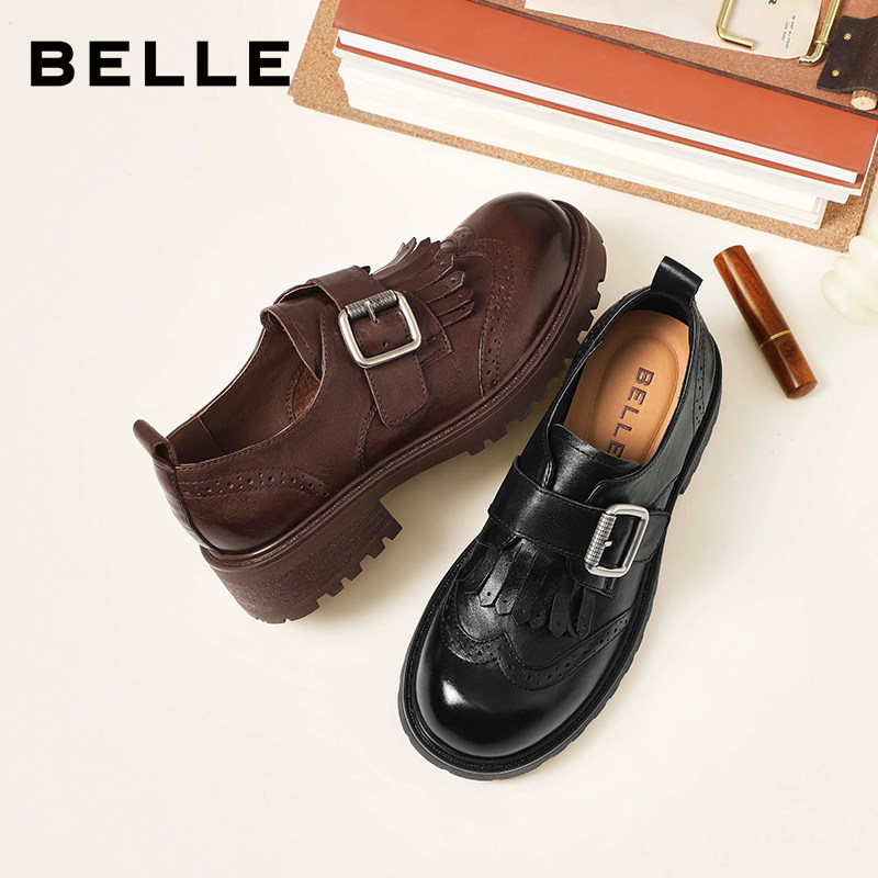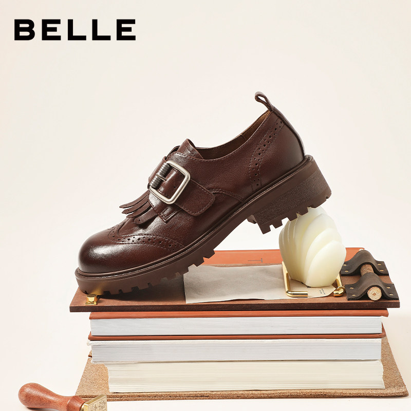 📚 百丽英伦风孟克乐福鞋女新款雕花布洛克真皮厚底小皮单鞋B3030预