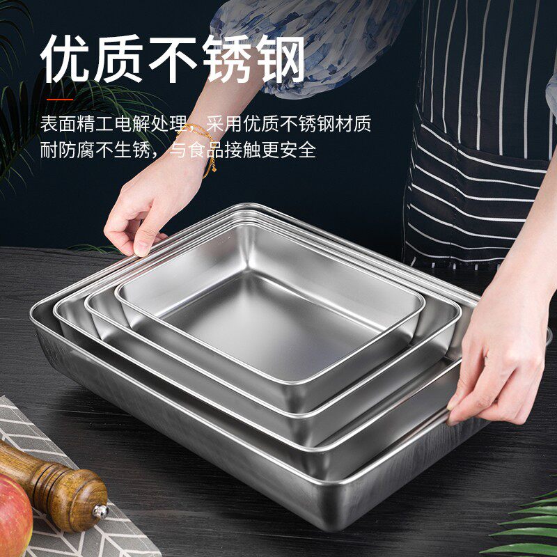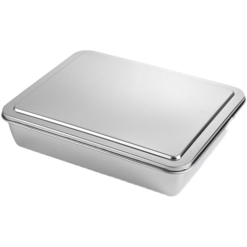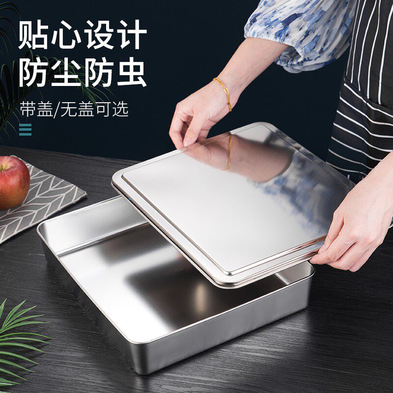 📚 不锈钢方盒304平底长方形带盖盒子糕点盘蒸饭盘熟食盘快餐菜盘子