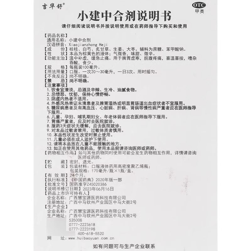 📚 吉华舒 小建中合剂 170ml/瓶/盒 脾胃虚寒温中补虚缓急止痛食少
