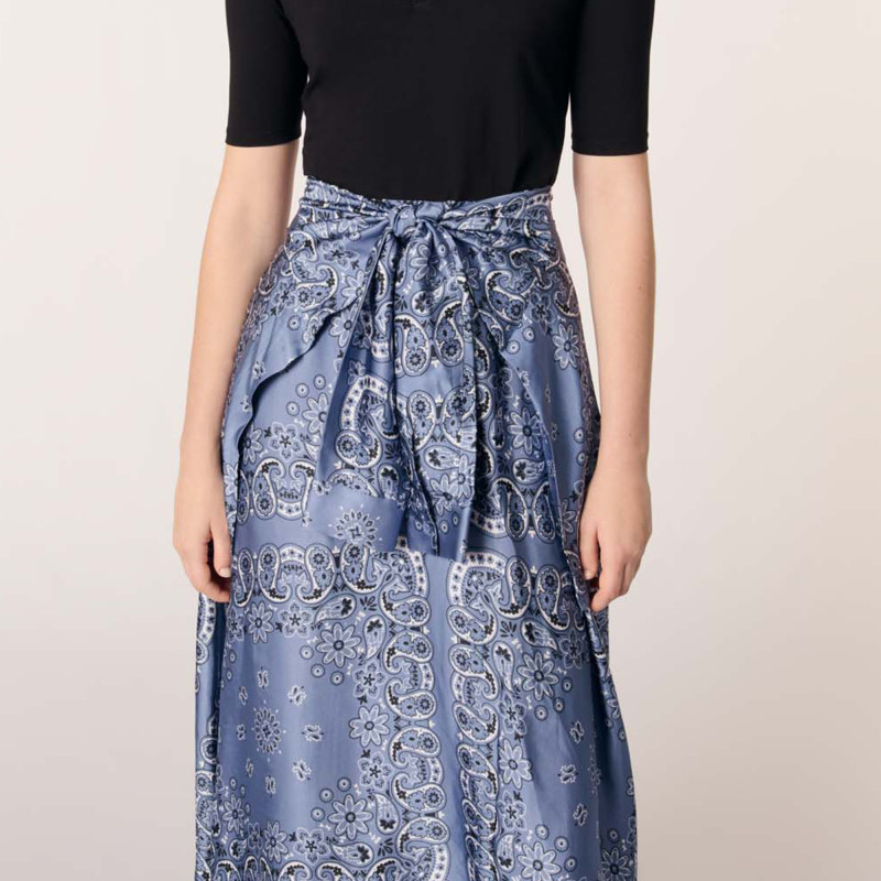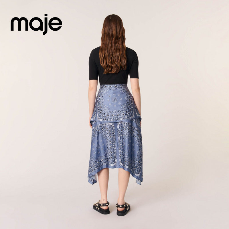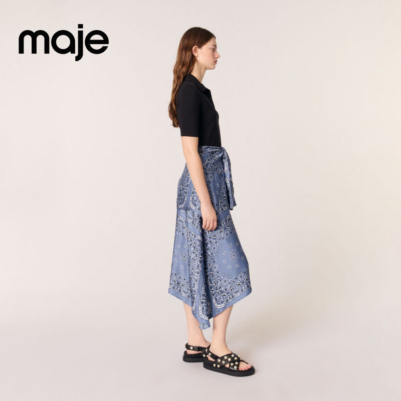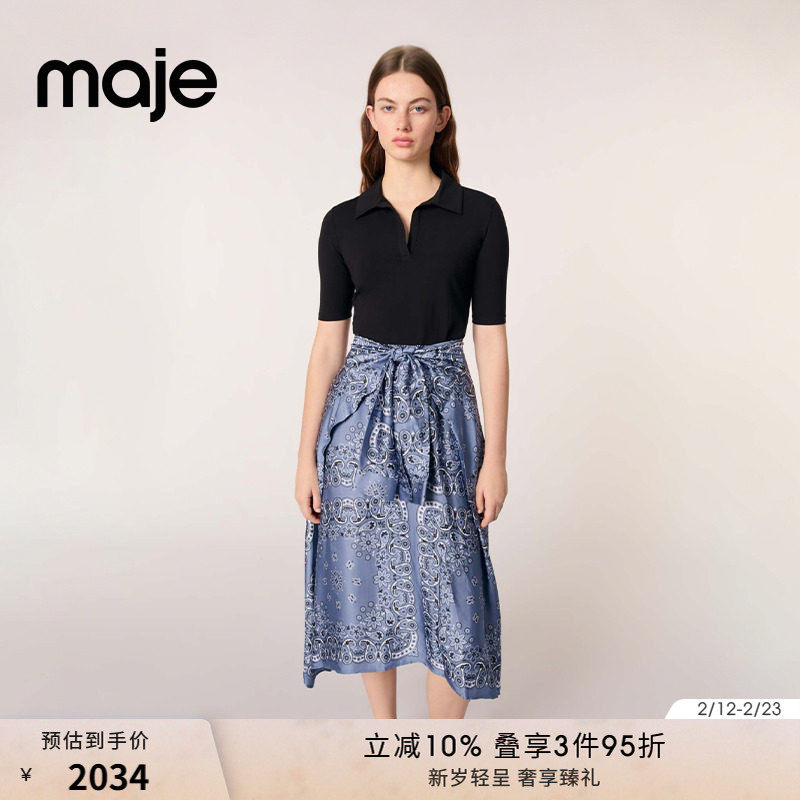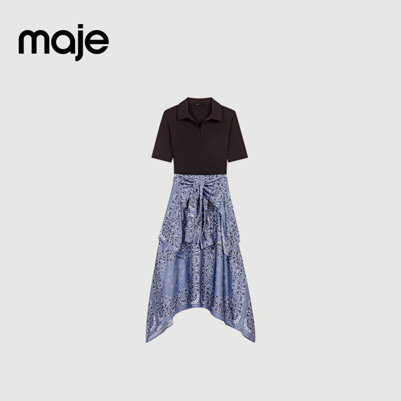 📚 Maje2025春夏女装法式时尚印花图案系带长款收腰拼接长款连衣裙